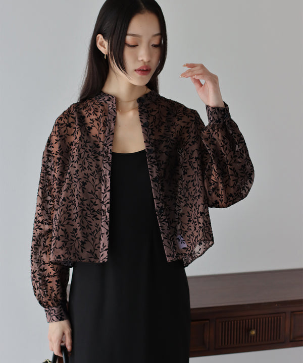 模様の部分はベルベットのような生地になるので、透け感もありつつ模様部分は秋らしい質感でこの時期にピッタリの一枚になっています。