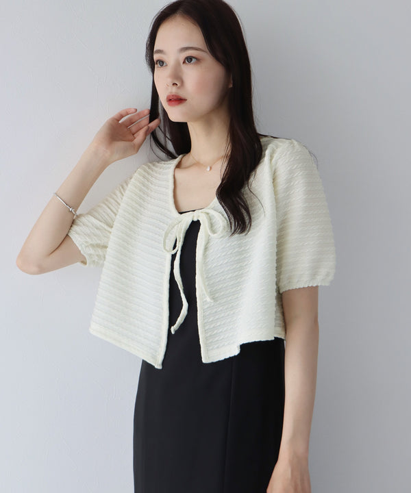 半袖ケーブル柄リボンカーディガン