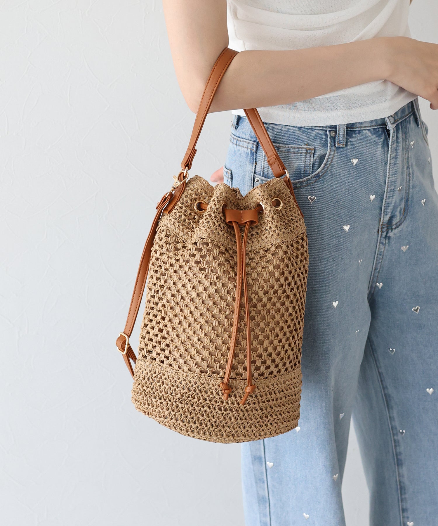 涼しげなペーパー素材で季節感のある巾着型ストローバッグ。軽量ながら見た目以上に収納力のある大容量バッグで、500mlペットボトルやハンディファン、長財布などが楽々入るのもポイント◎