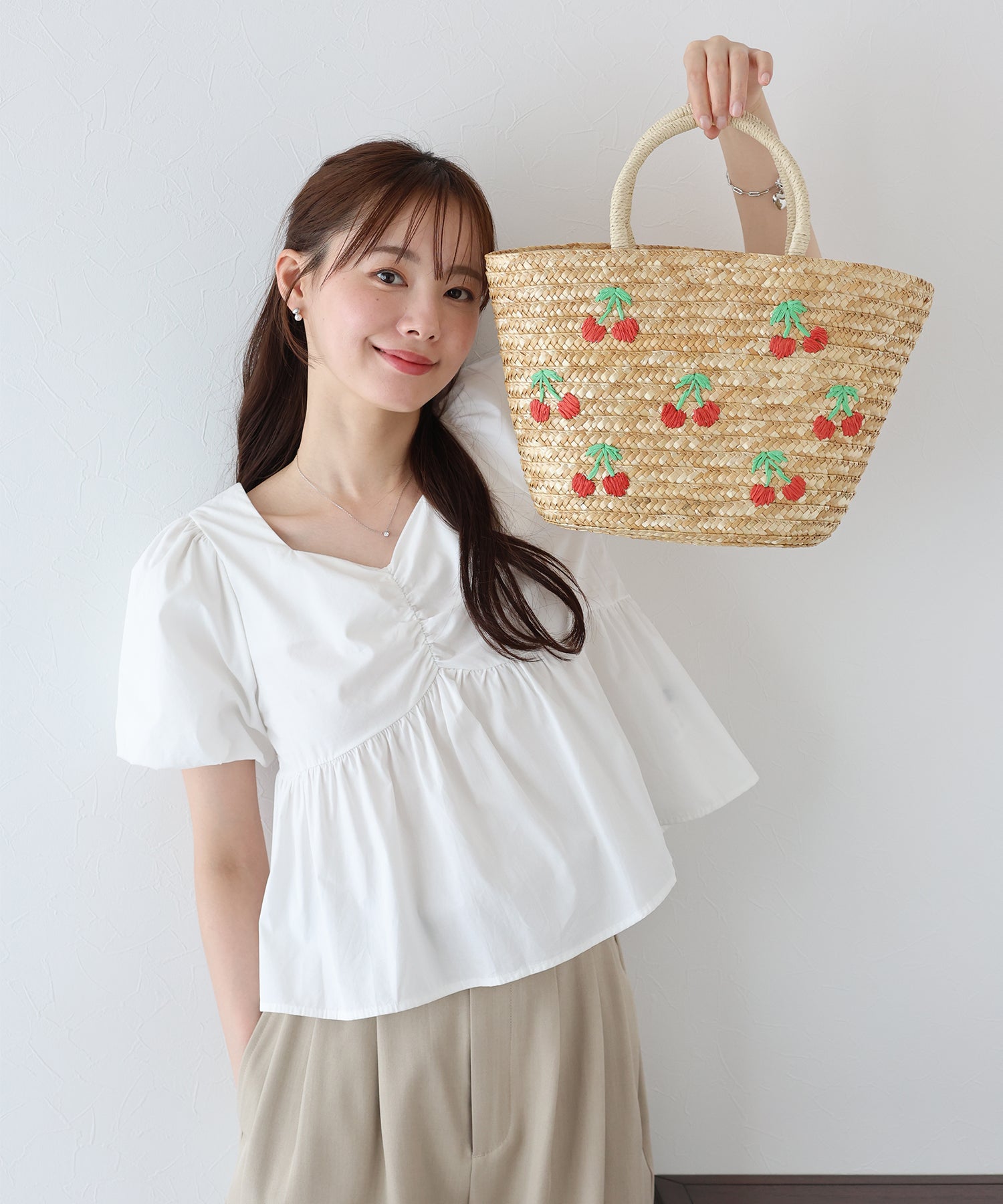 季節感を感じさせてくれるガーリーなカゴバック。さくらんぼやレモンの刺繍を施し、ポップでキュートなイメージを演出します。