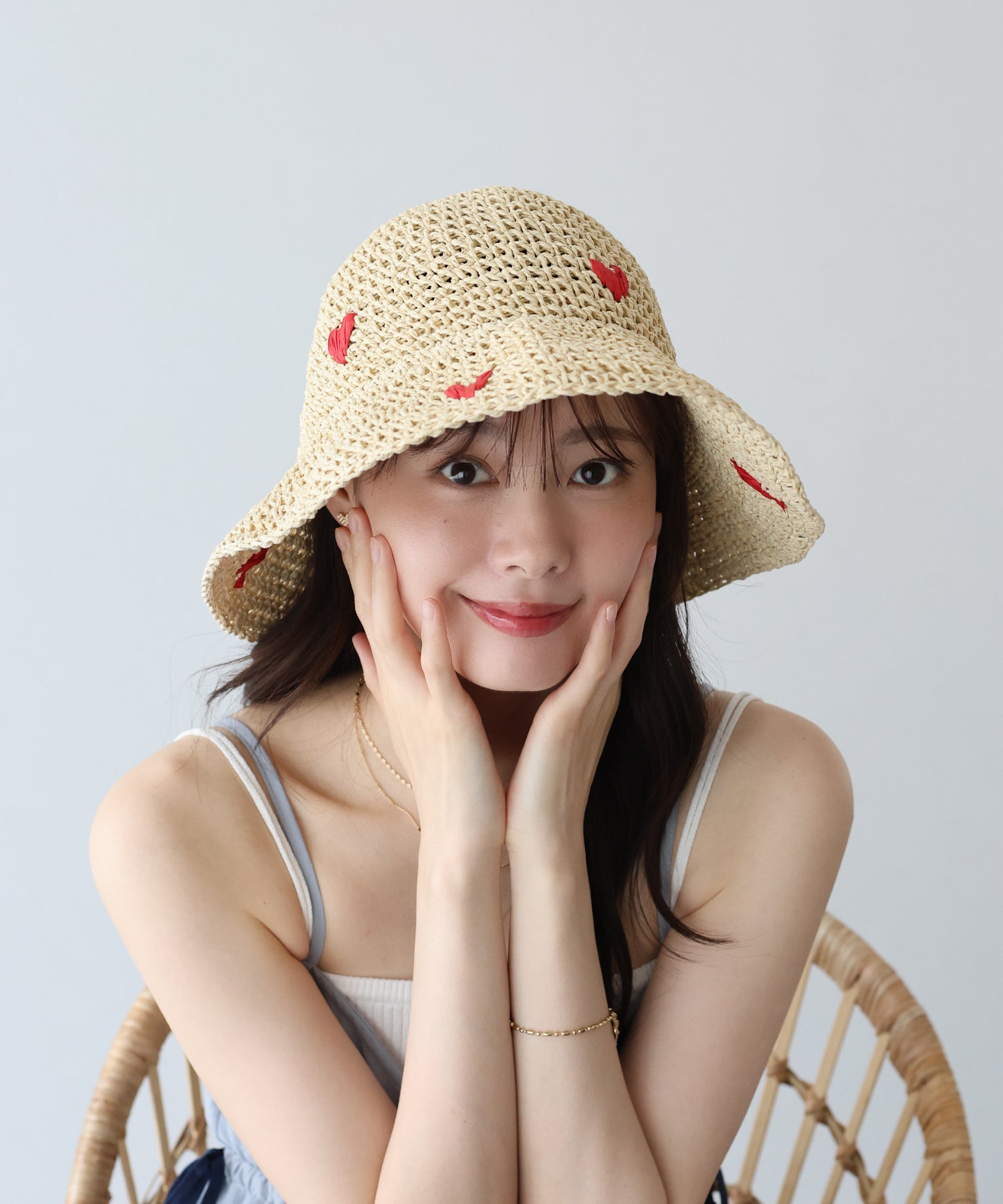夏のスタイリングに欠かせない涼しげなペーパーハット。全体にあしらわれたカラフルなチェリーやハートの刺繍が、遊び心のあるデザイン。