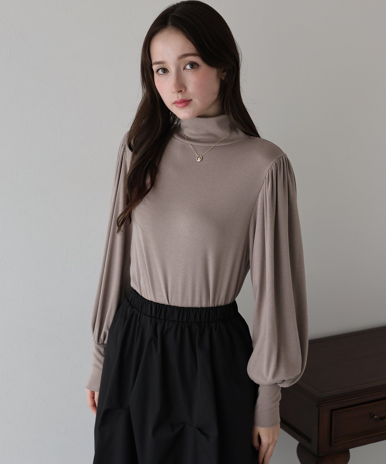 ハイネックデザインとタック入りスリーブがポイントのカットソー