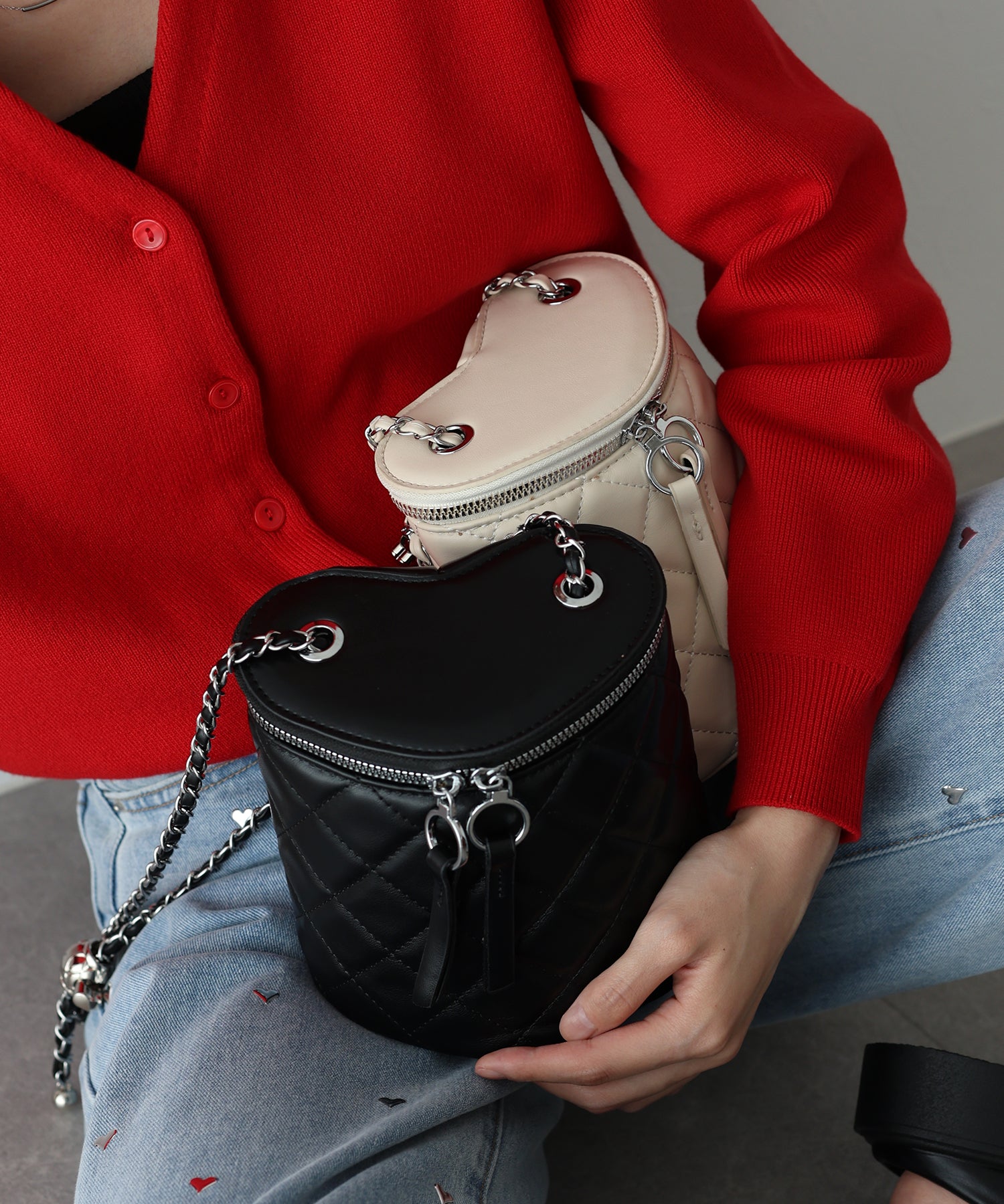 ハート型のシルエットが愛らしいミニバック。フェイクレザーのキルティングと小ぶりのサイズ感が上品な印象に。かわいらしいサイズ感のミニバッグながら、スマートフォンやハンカチ・折り畳み財布など、見た目以上の荷物を収納出来ます。