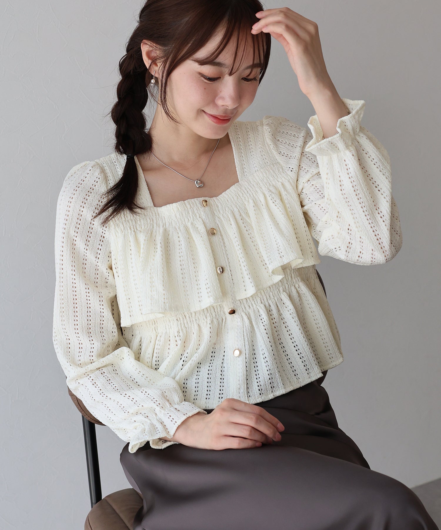 前身頃全体にあしらったティアードフリルが動くたびにふんわりと揺れて軽やかな印象に。