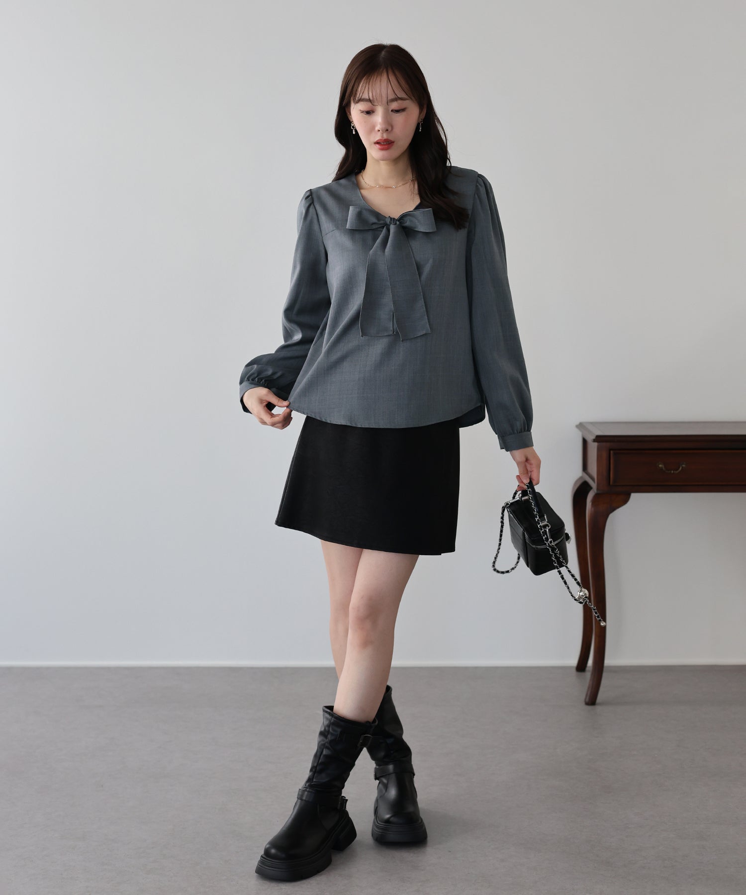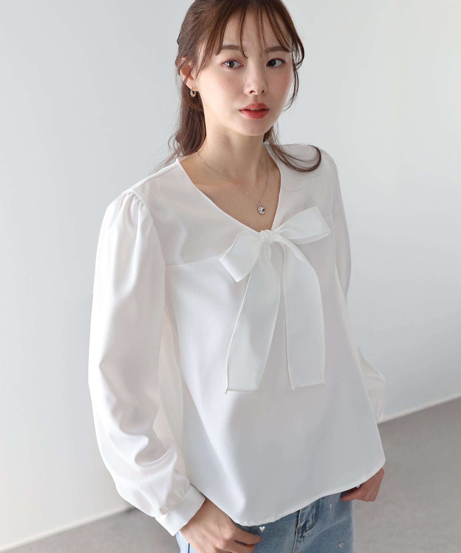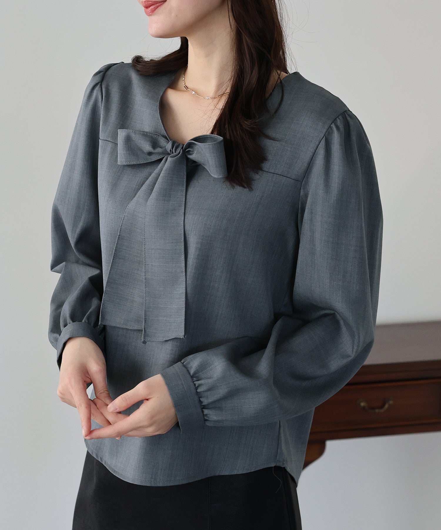 1枚でレディに仕上がるノーカラーボウタイブラウス