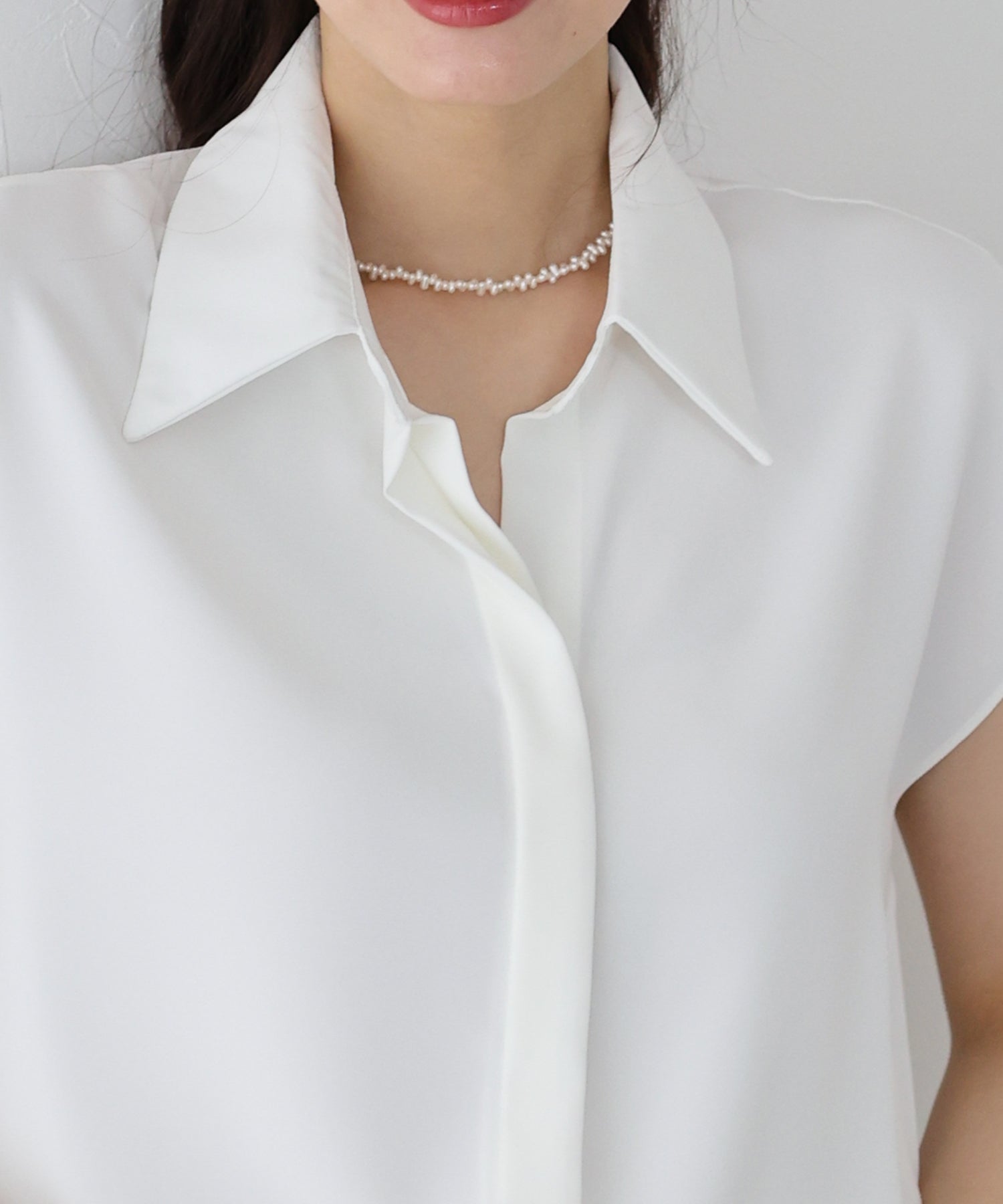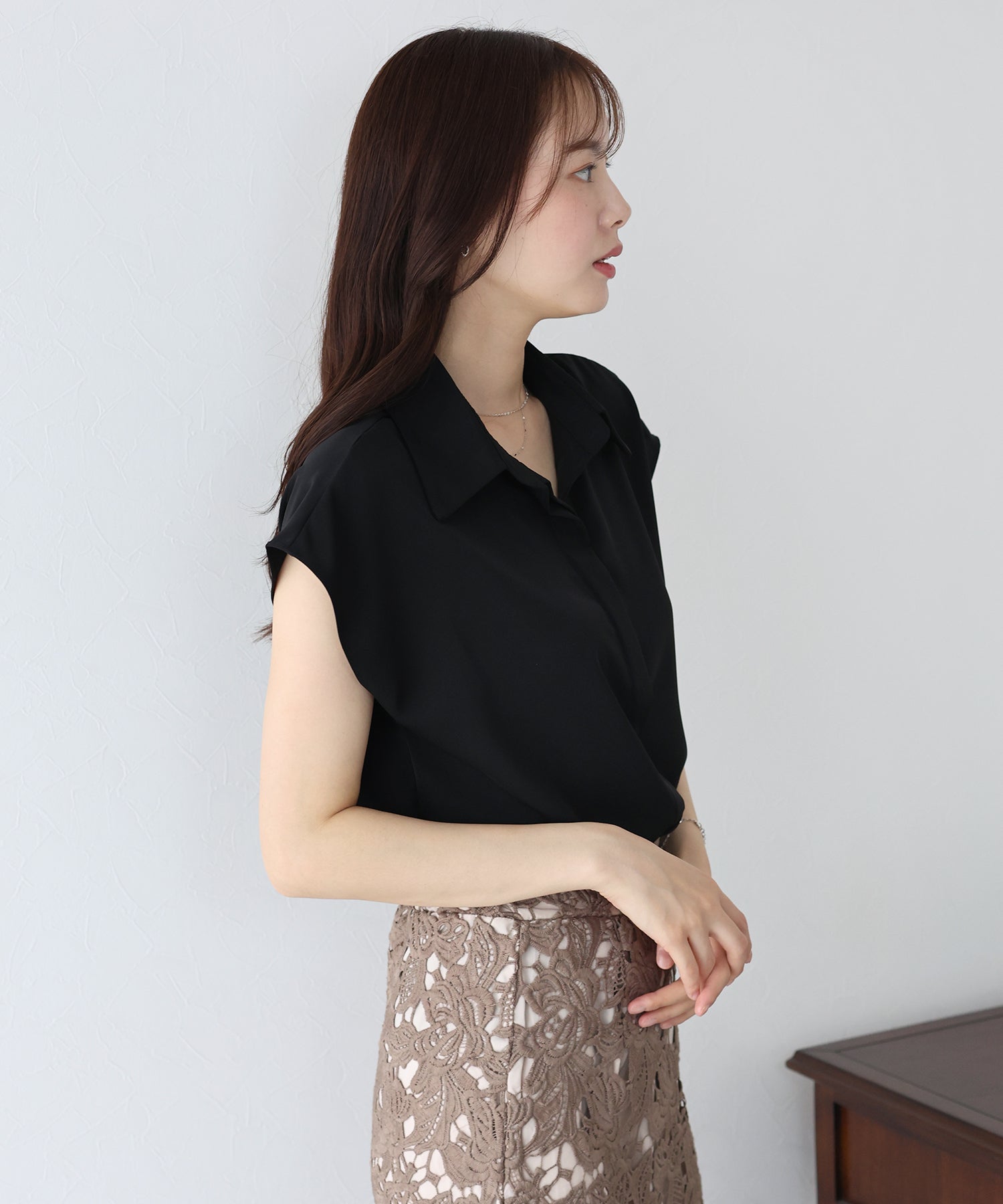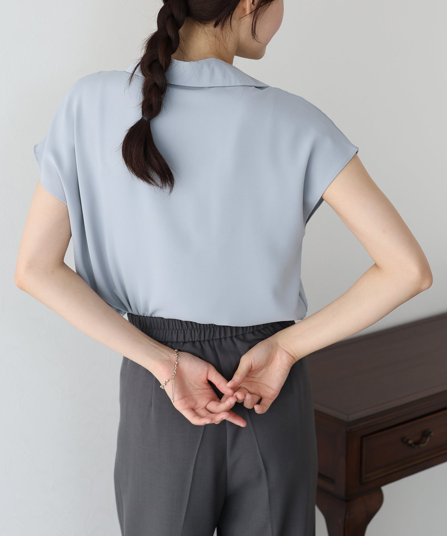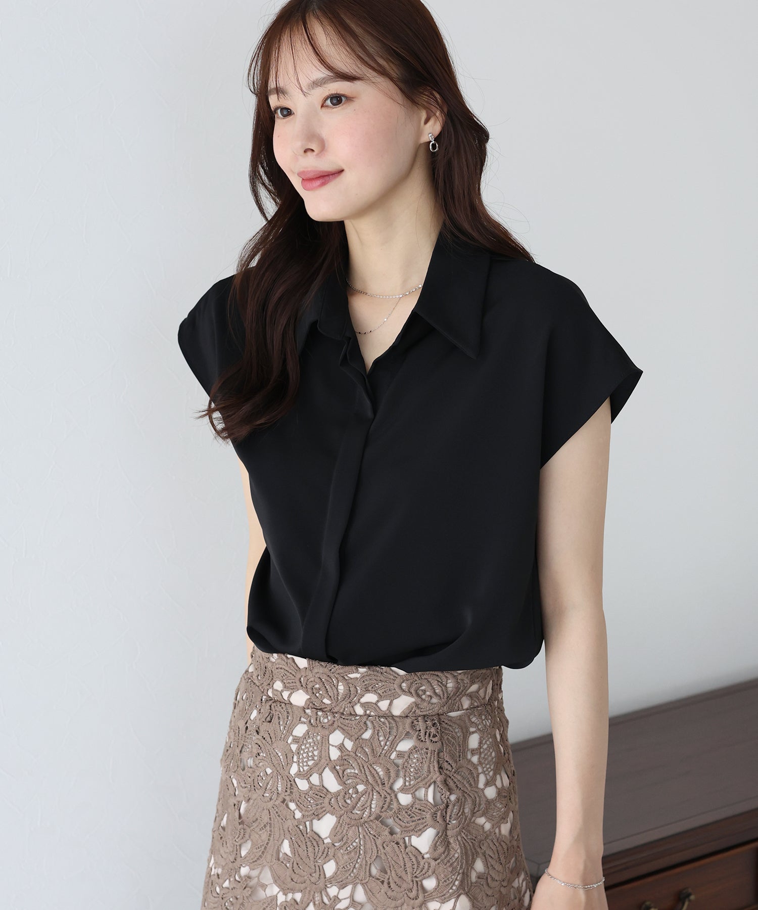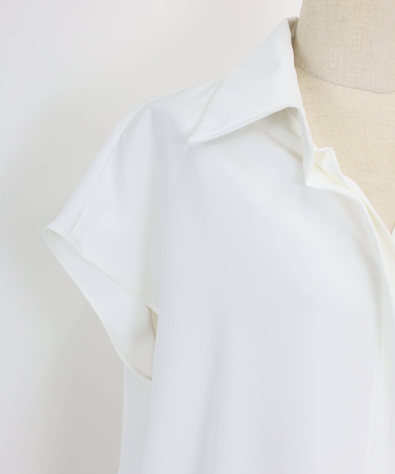 襟付きできちんと感を出し、首元が開いたデザインで大人の女性らしい抜け感を演出します。