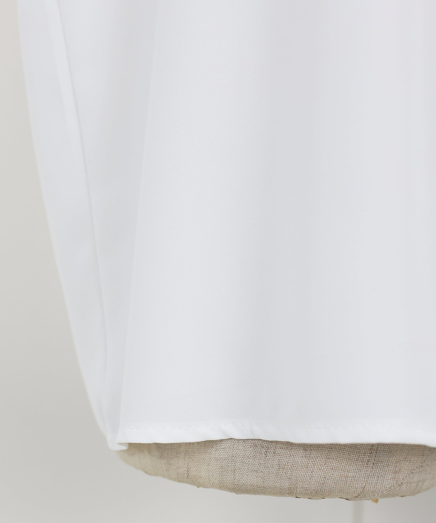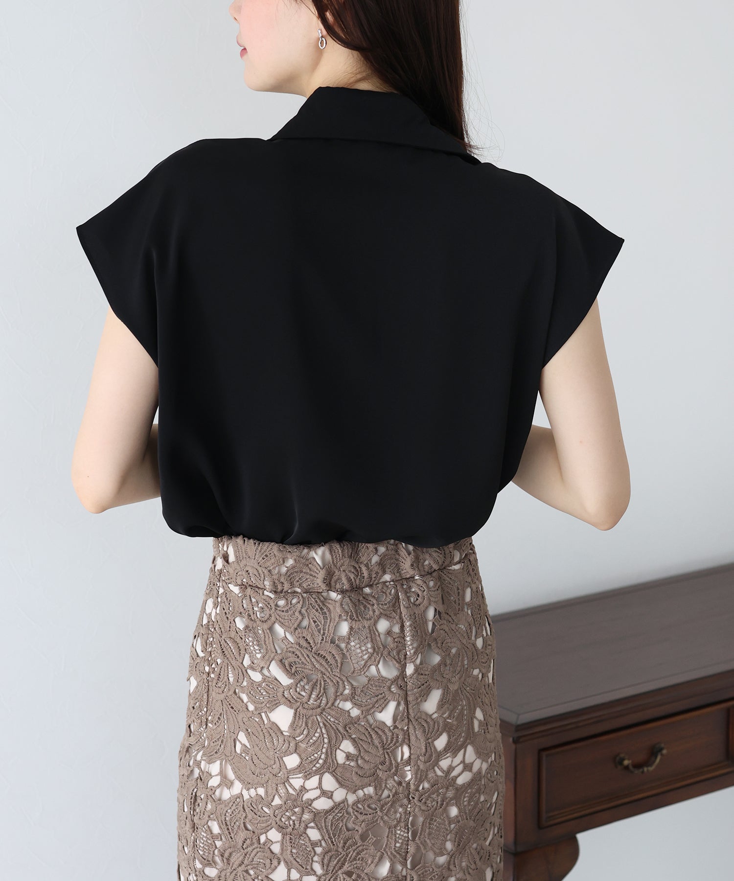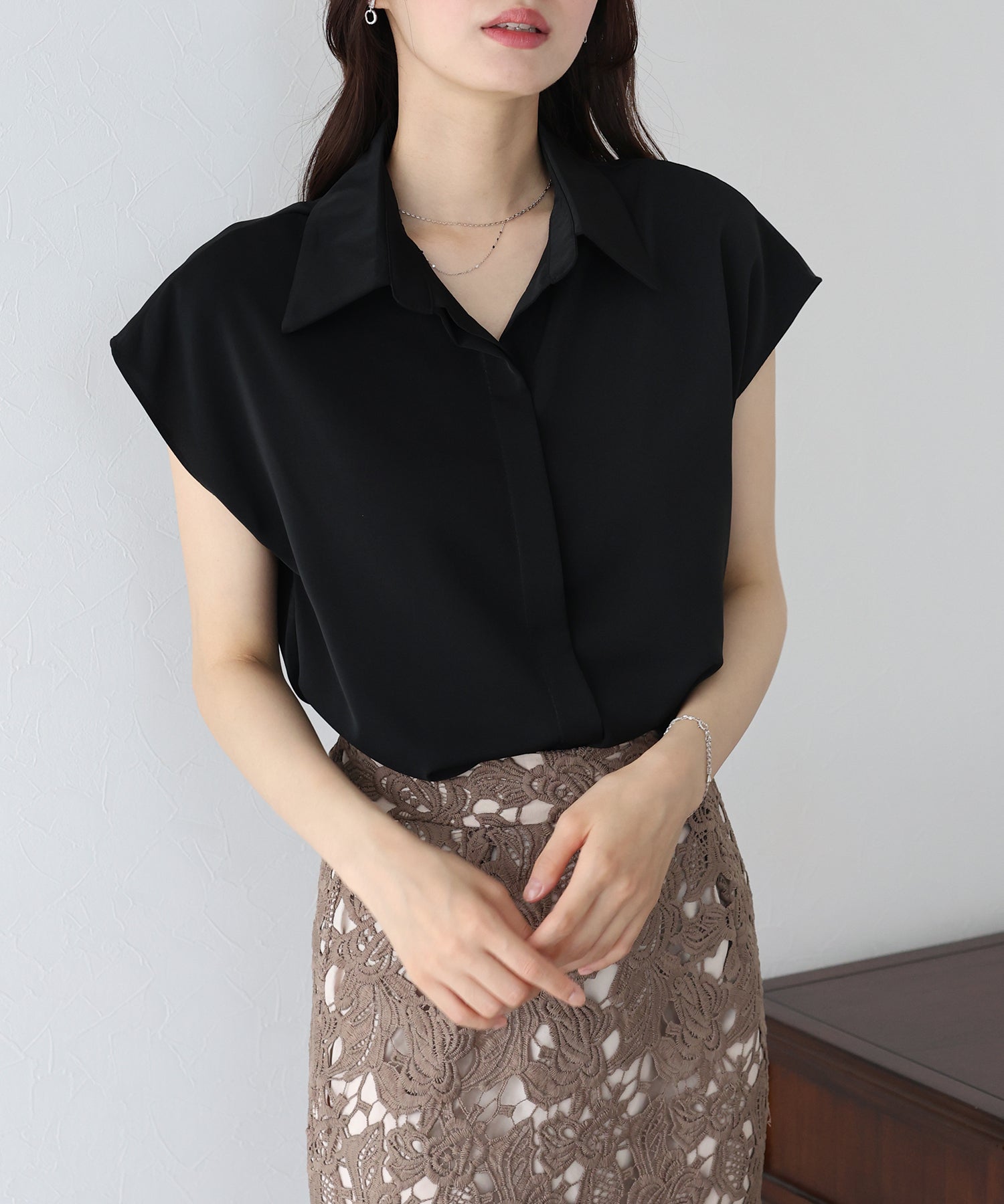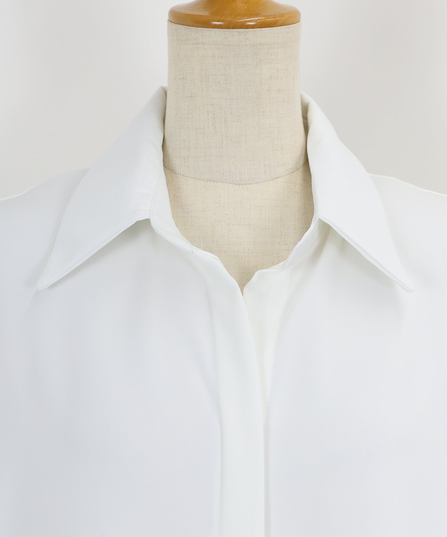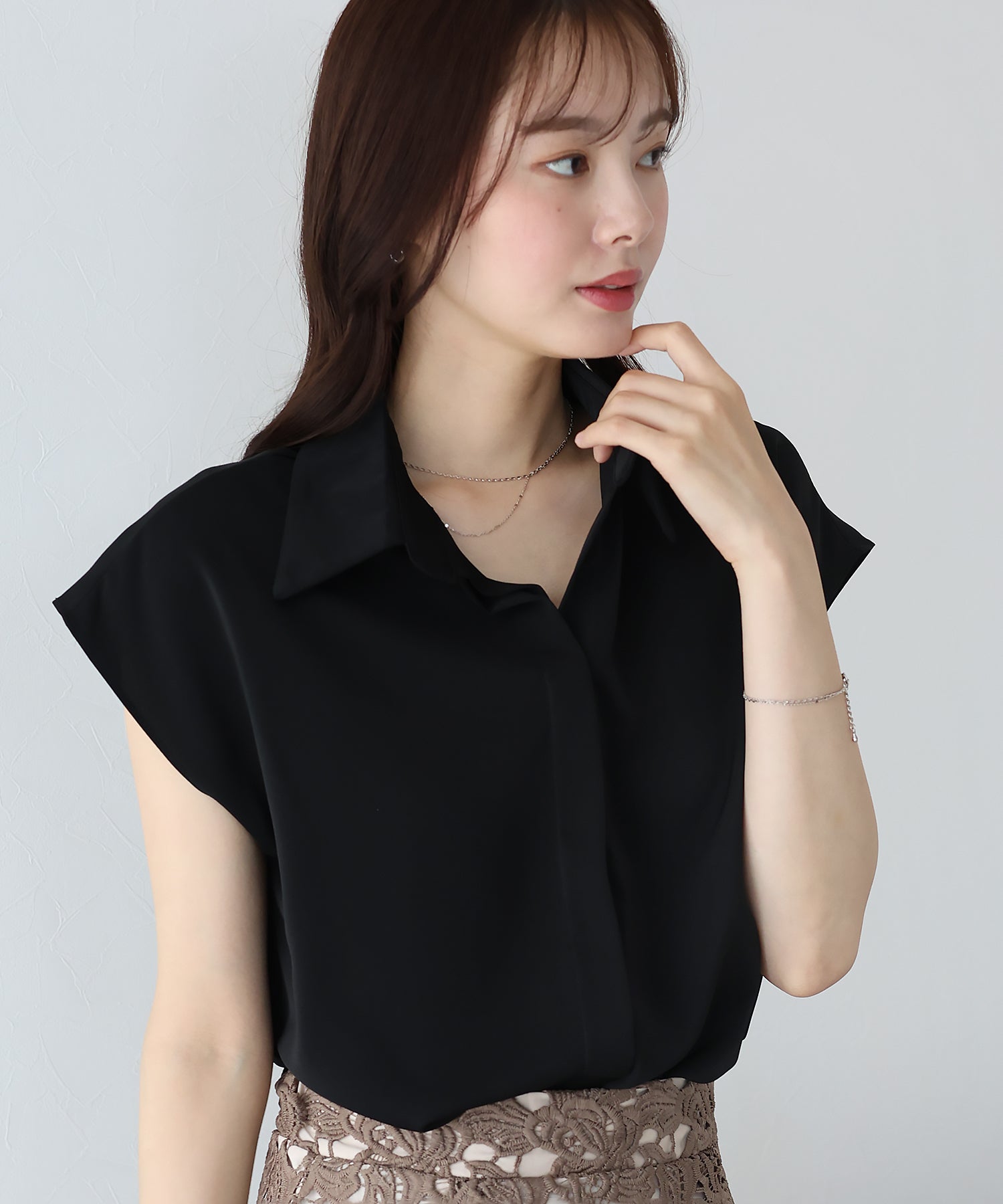 襟付きできちんと感を出し、首元が開いたデザインで大人の女性らしい抜け感を演出します。