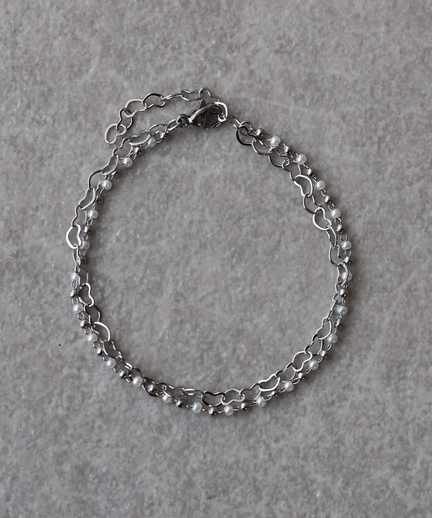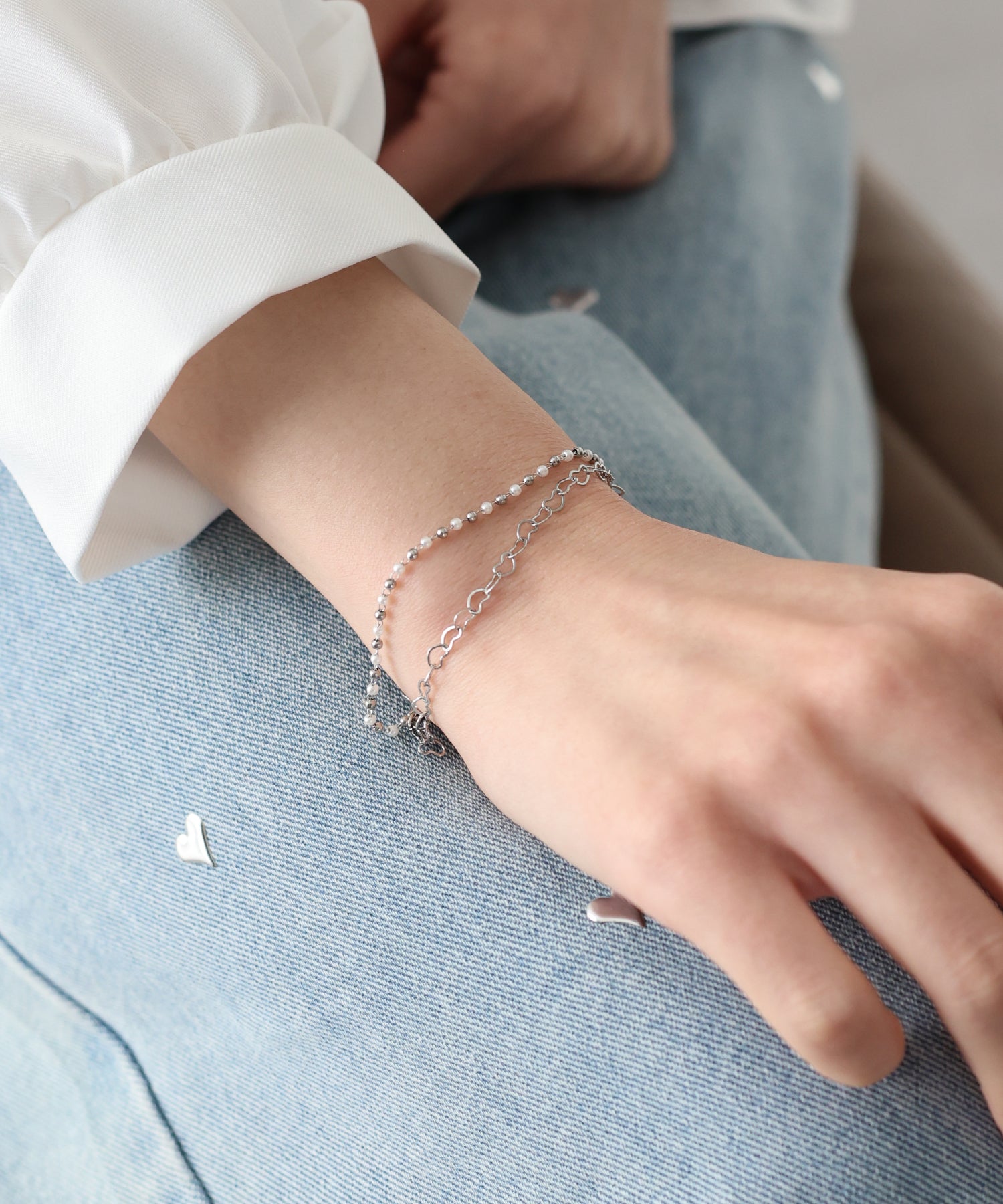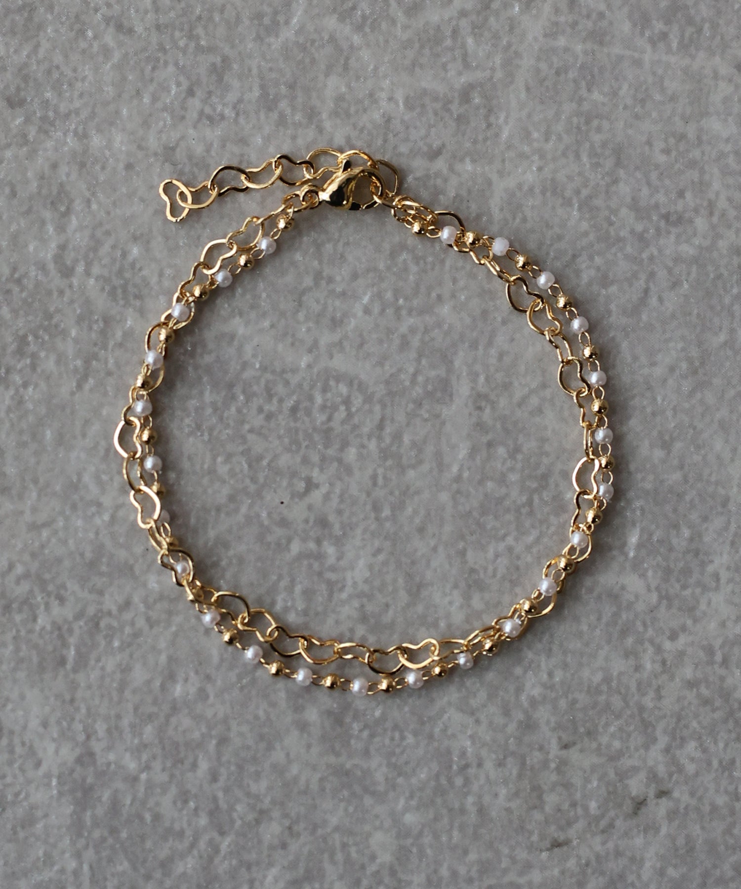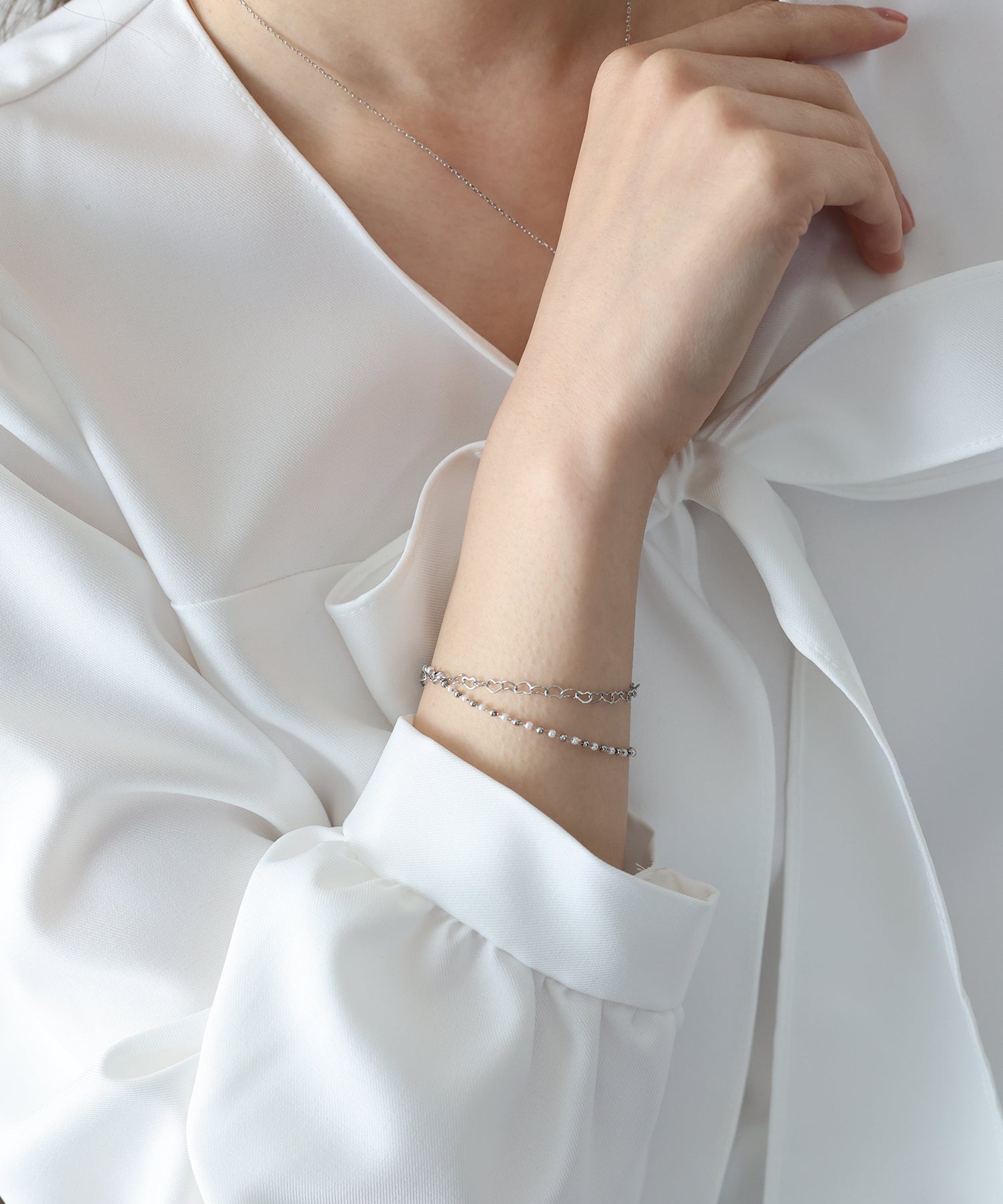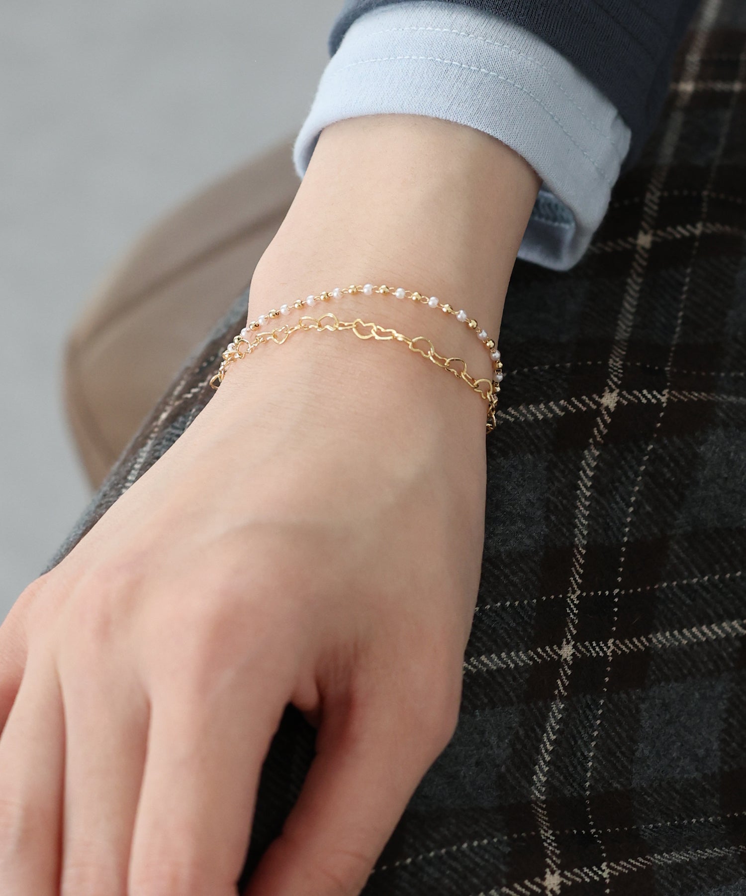 光の反射できらきらと輝くハートチェーン×パールの2連ブレスレット。