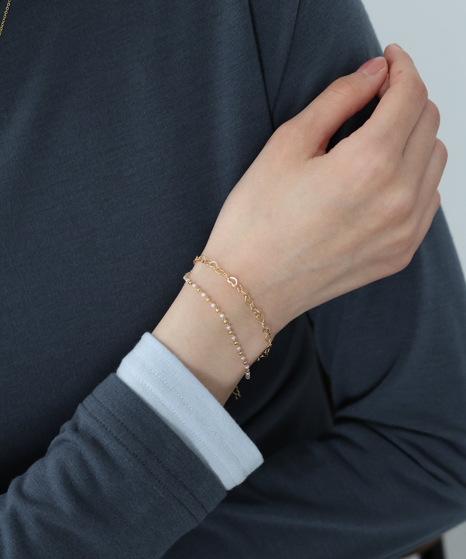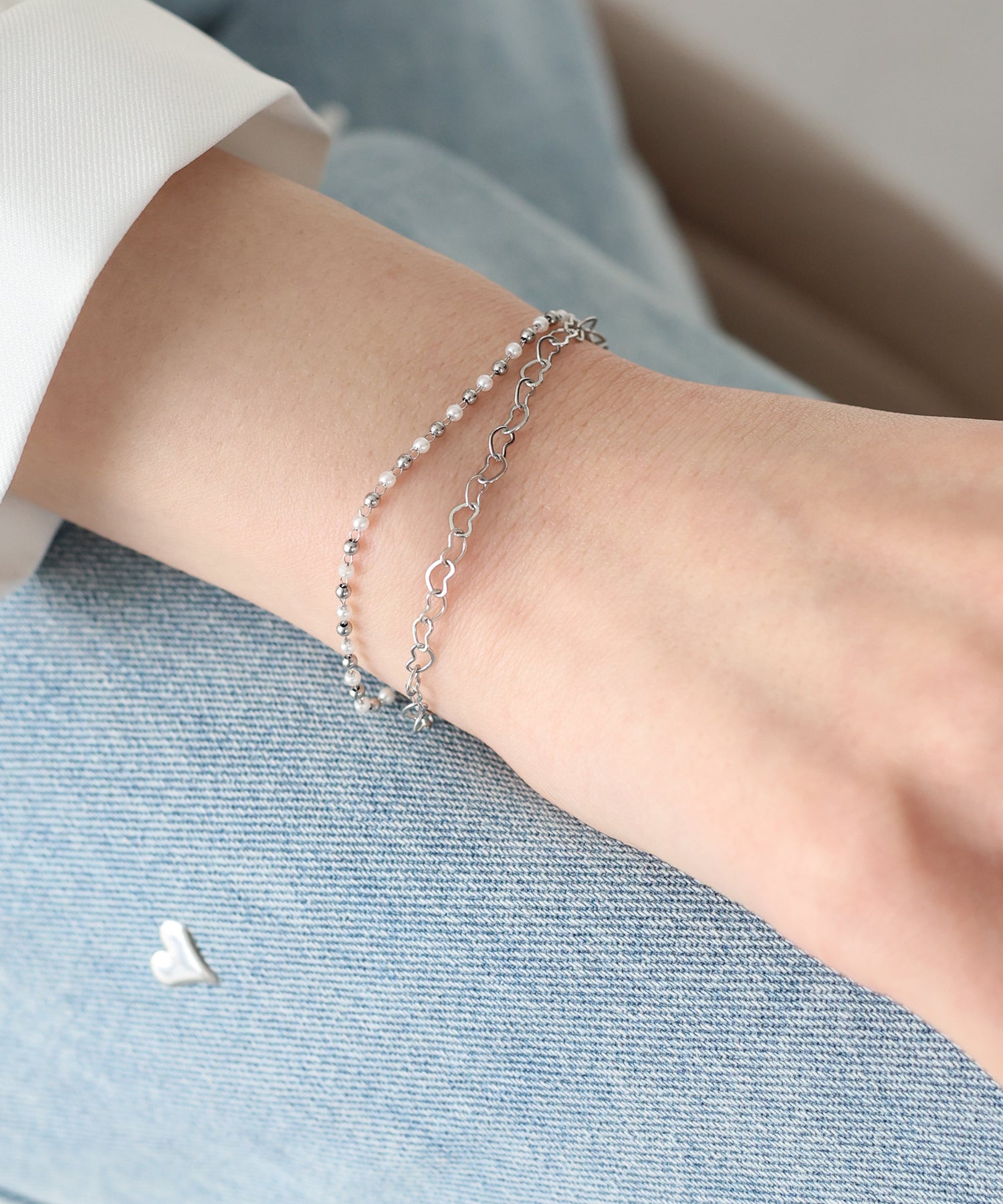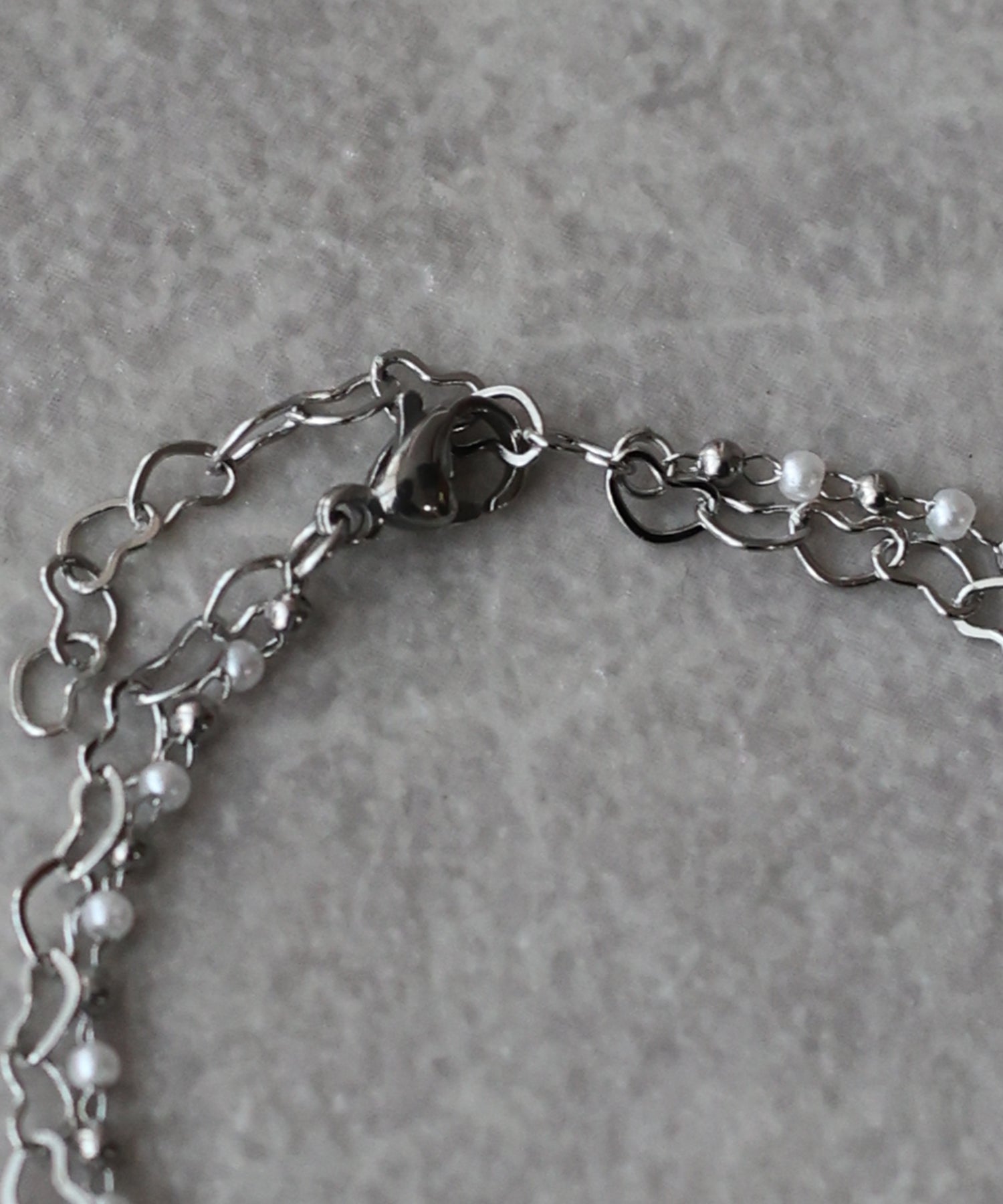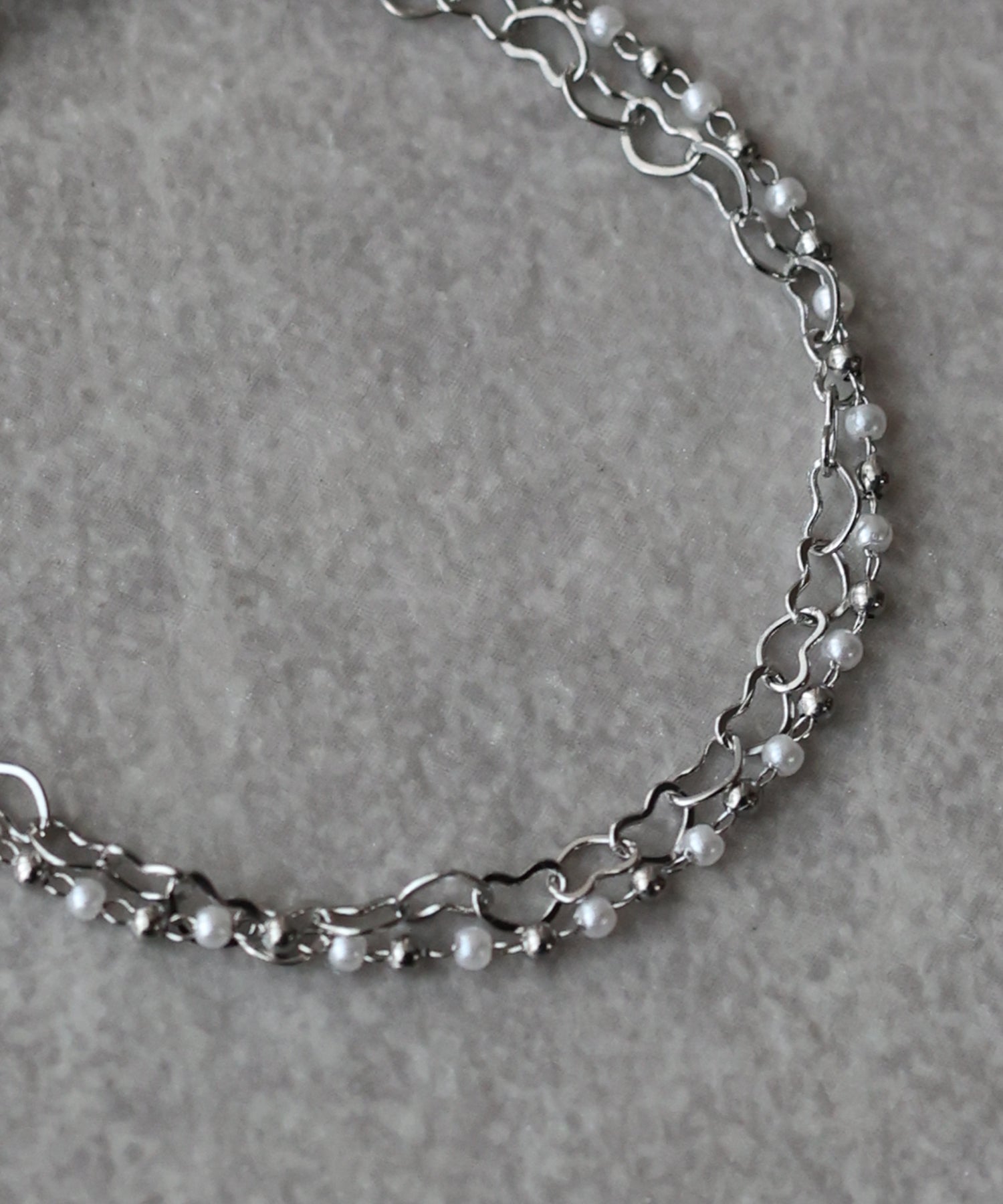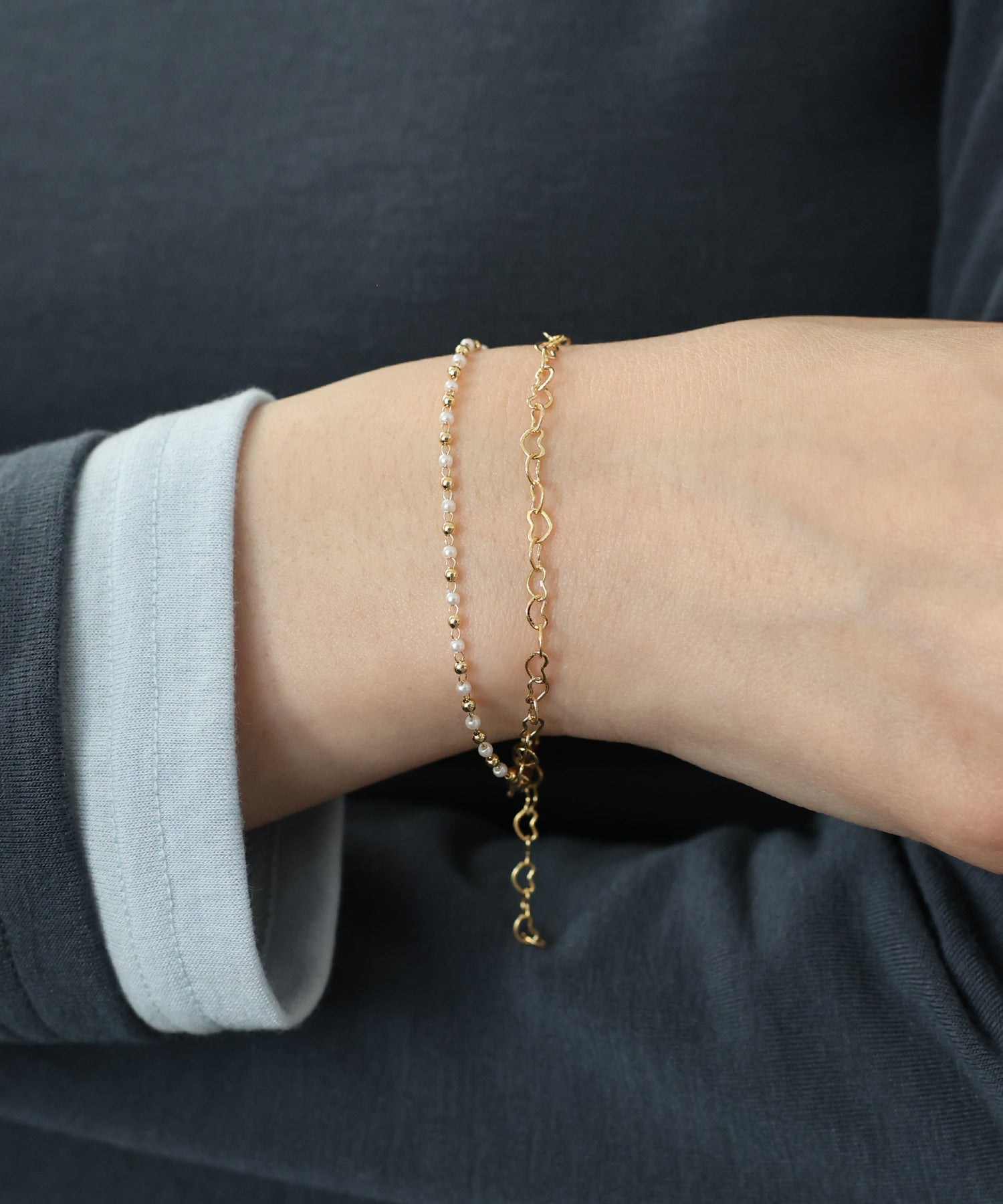 光の反射できらきらと輝くハートチェーン×パールの2連ブレスレット。