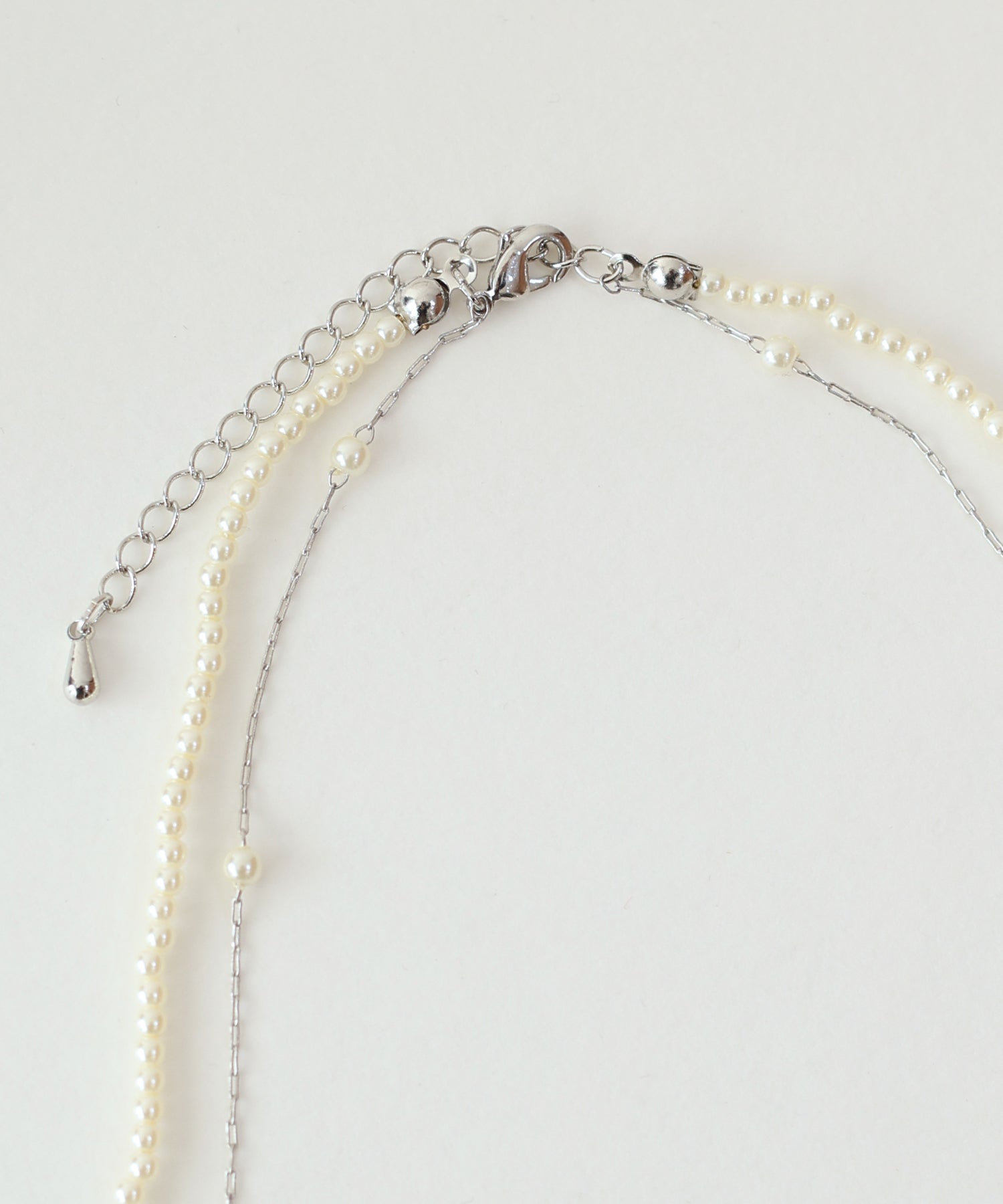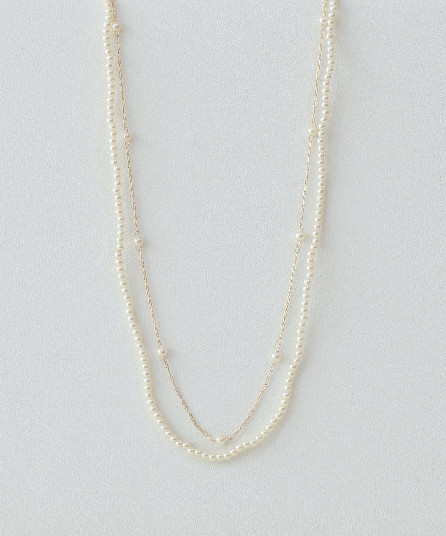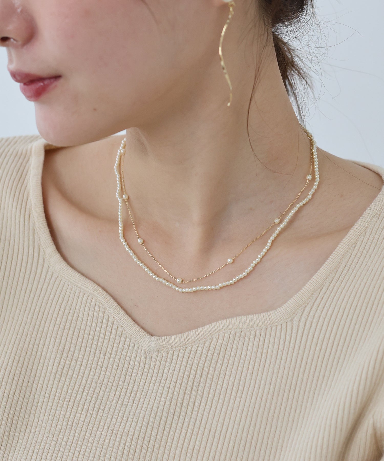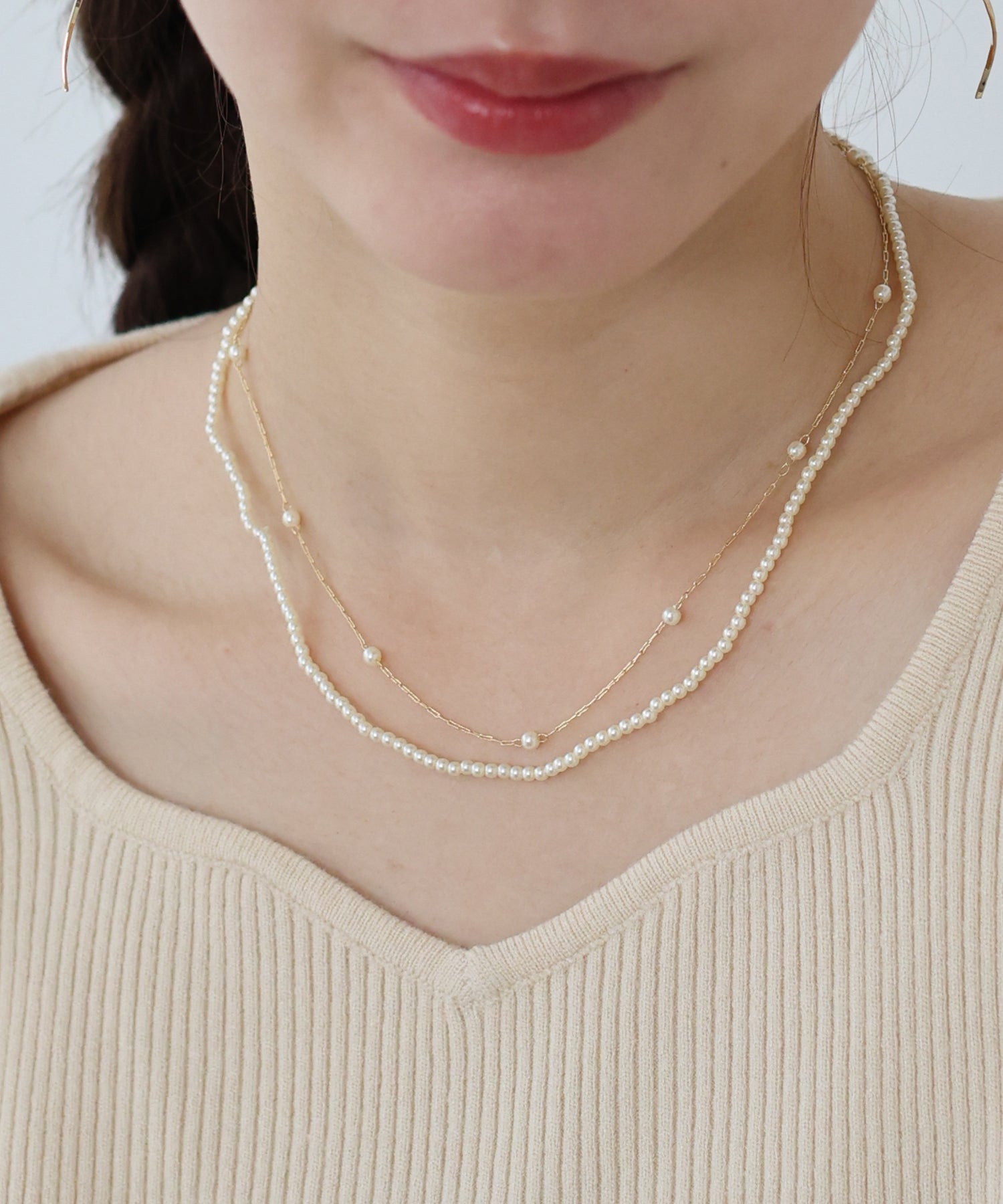 パールビーズネックレスと華奢なチェーンとパールのネックレスが連なったデザイン。