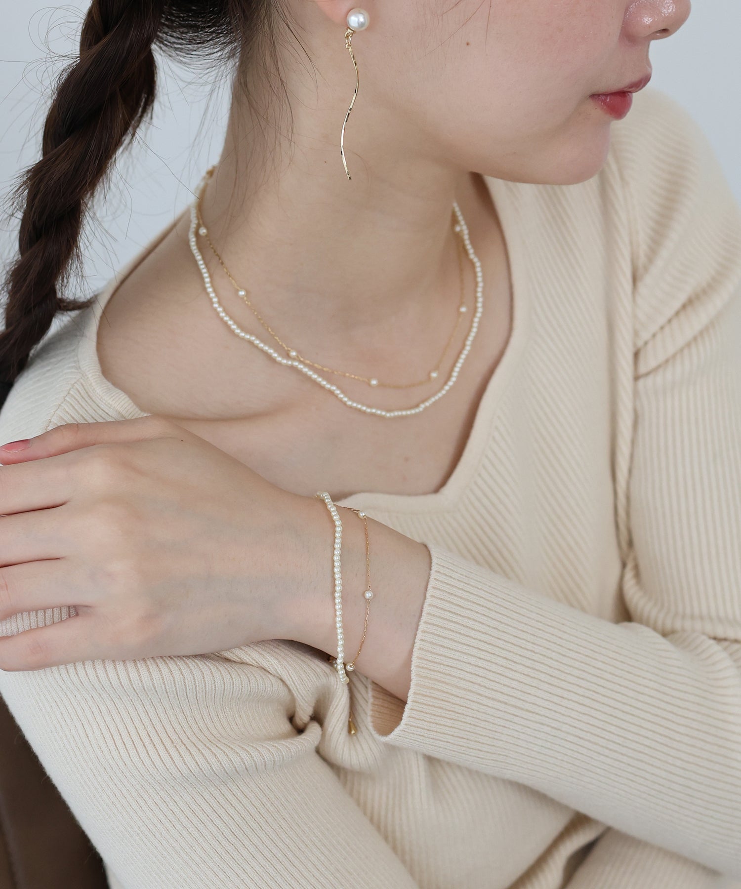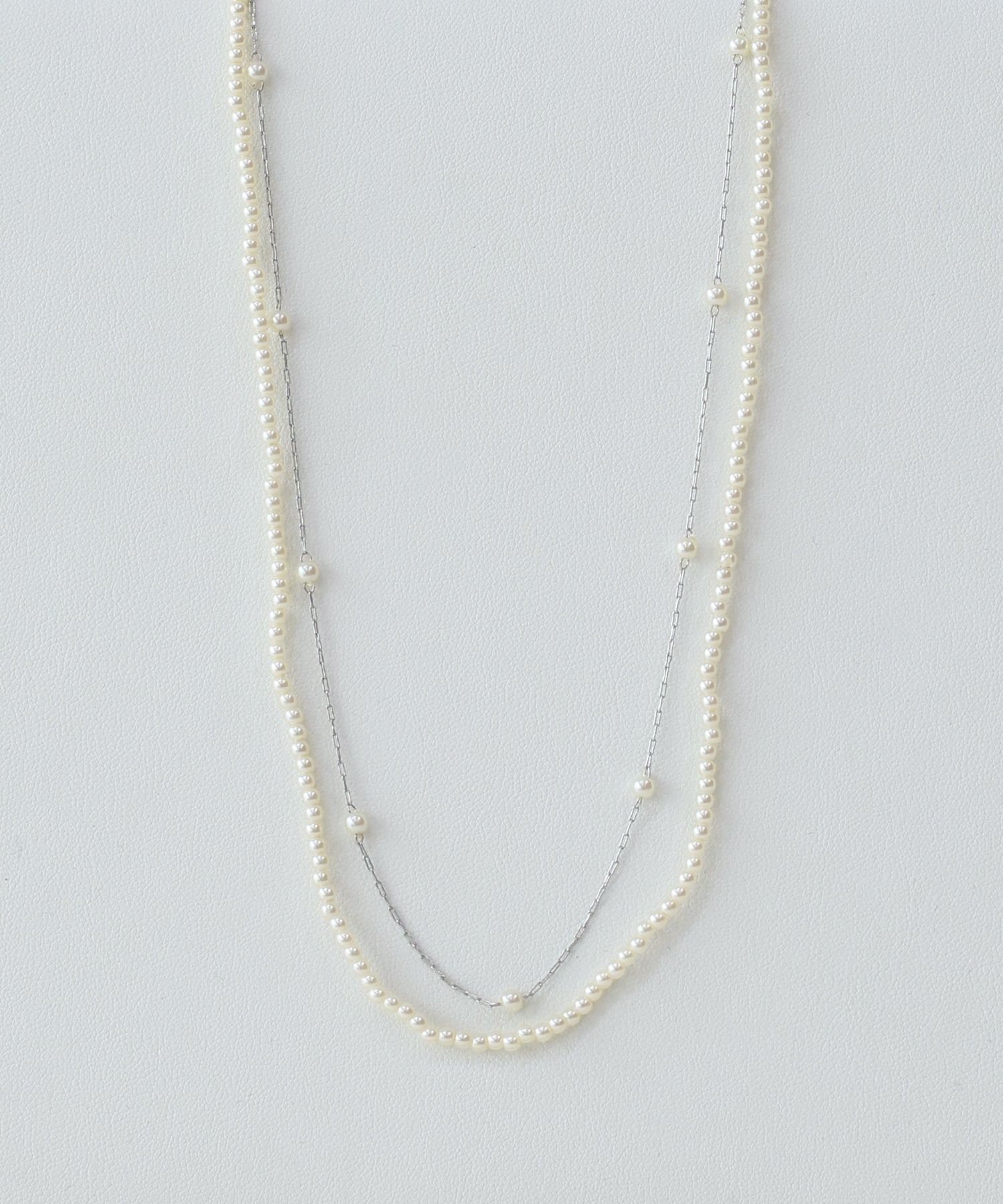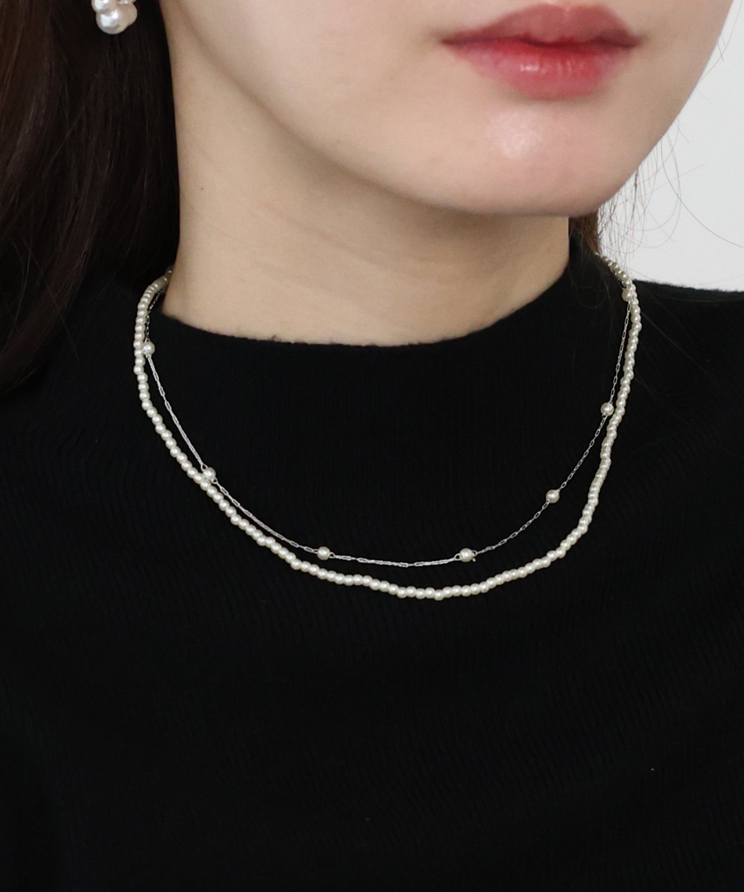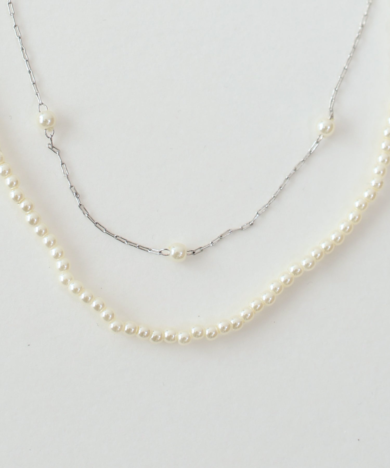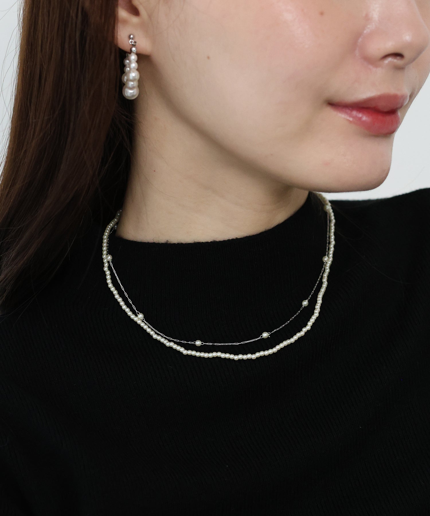 パールビーズネックレスと華奢なチェーンとパールのネックレスが連なったデザイン。