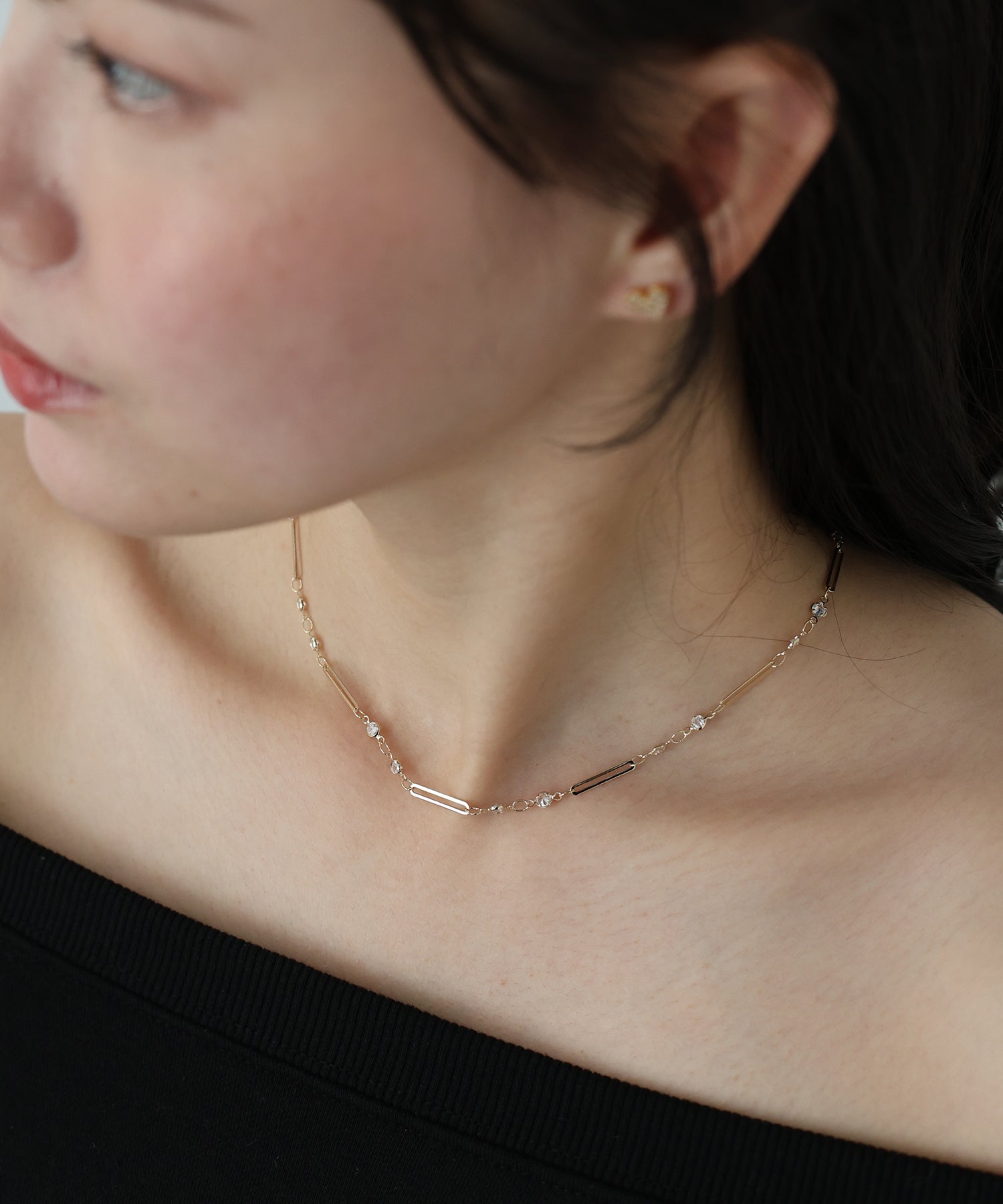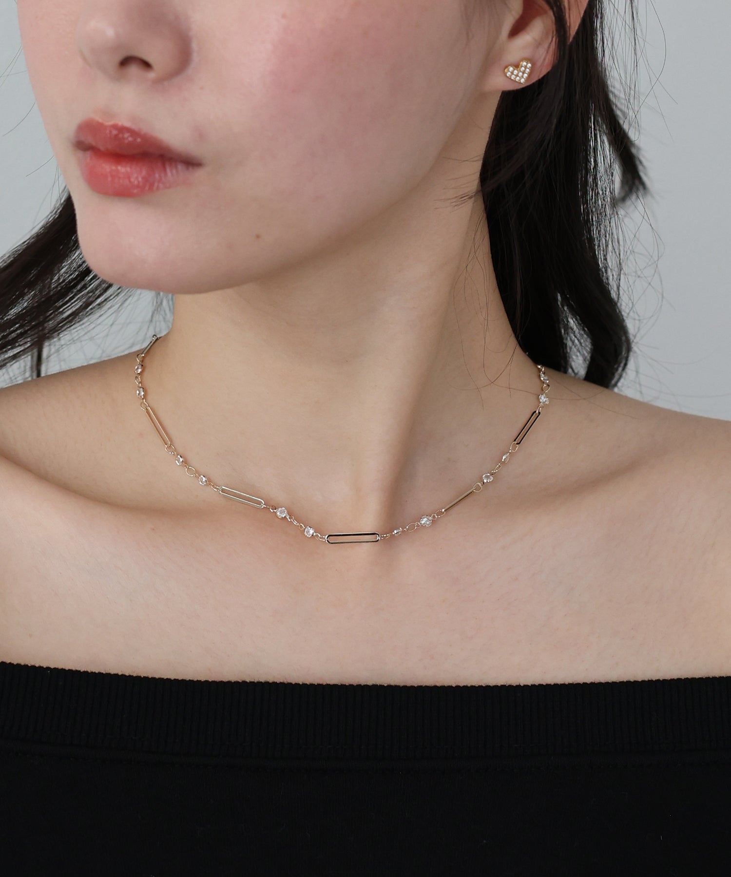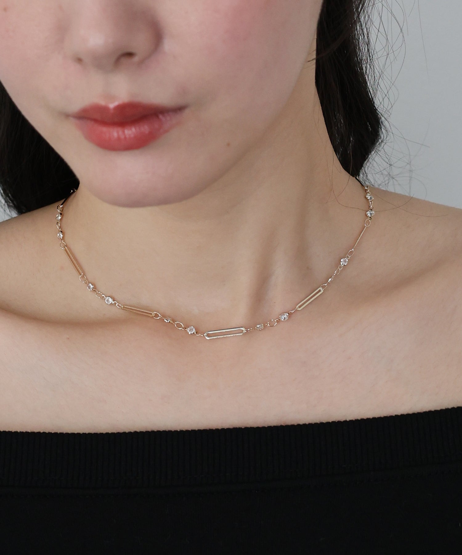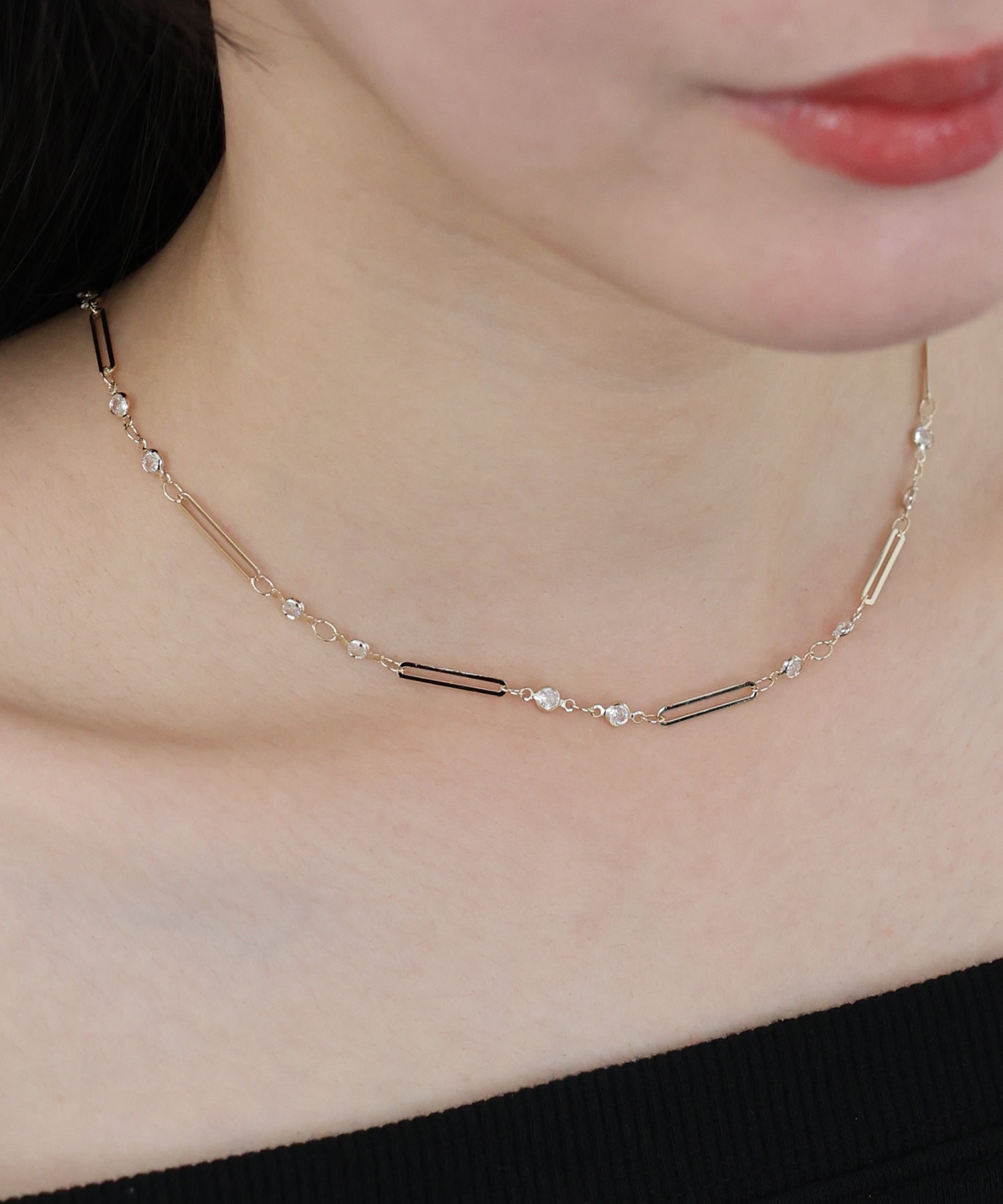 チェーンに等間隔に連なったビジューとメタルバーが繊細なデザインで、首元を綺麗に見せてくれます。