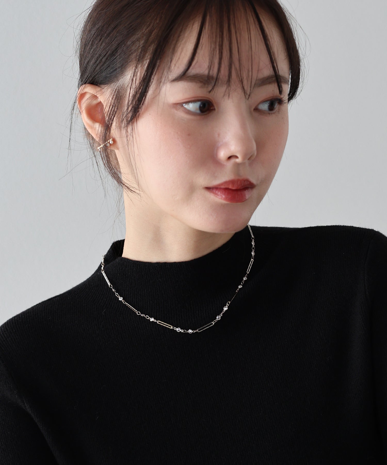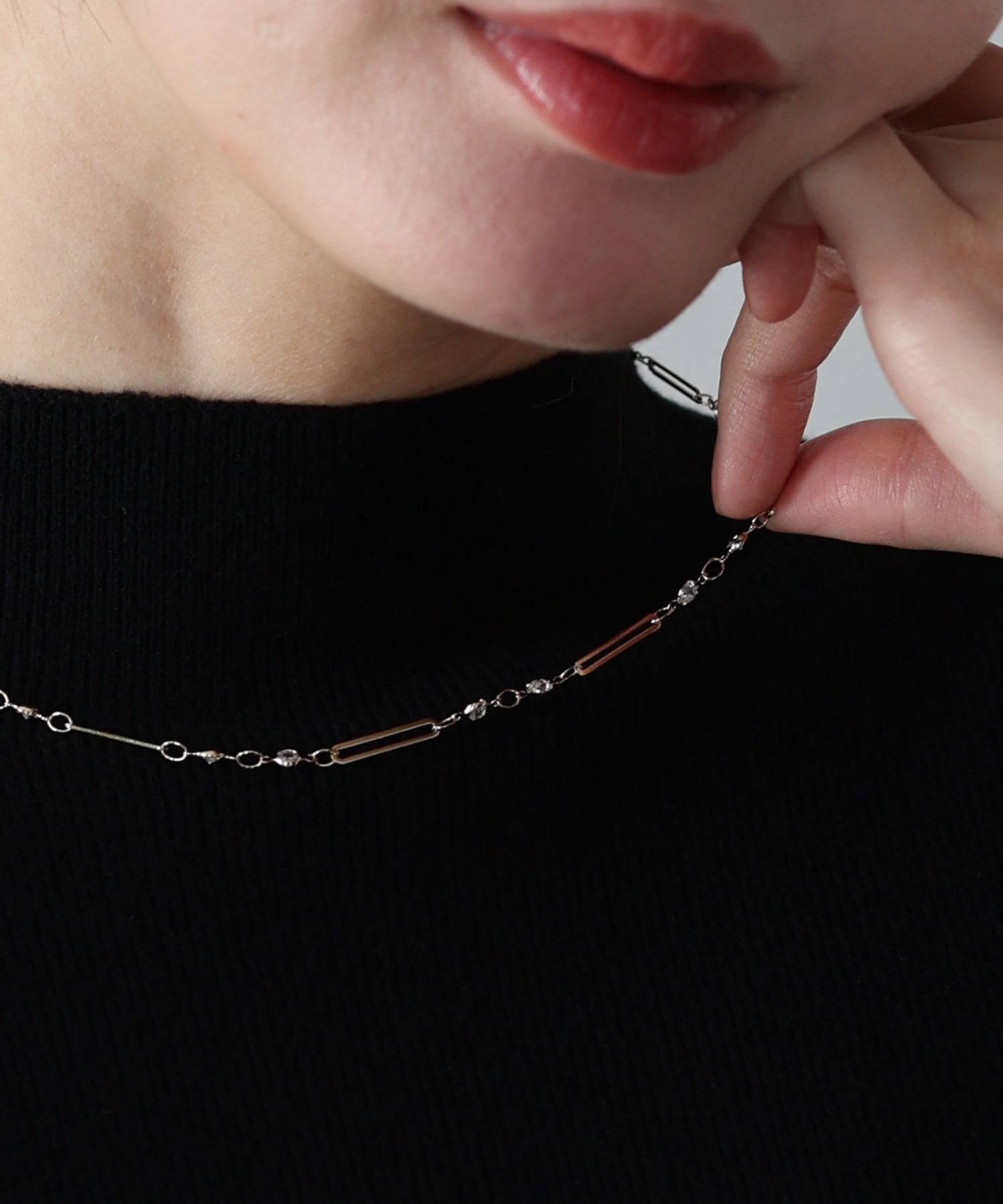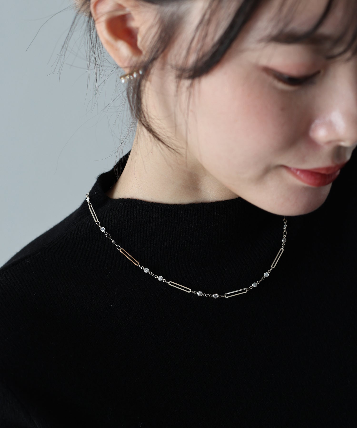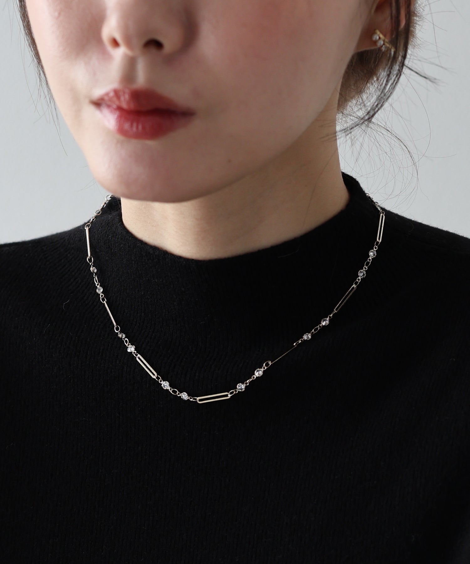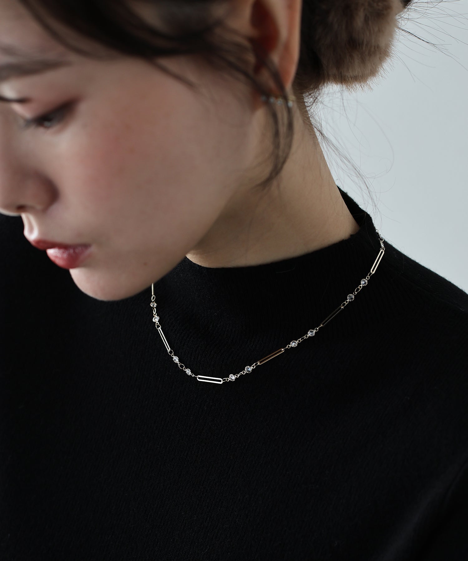 チェーンに等間隔に連なったビジューとメタルバーが繊細なデザインで、首元を綺麗に見せてくれます。