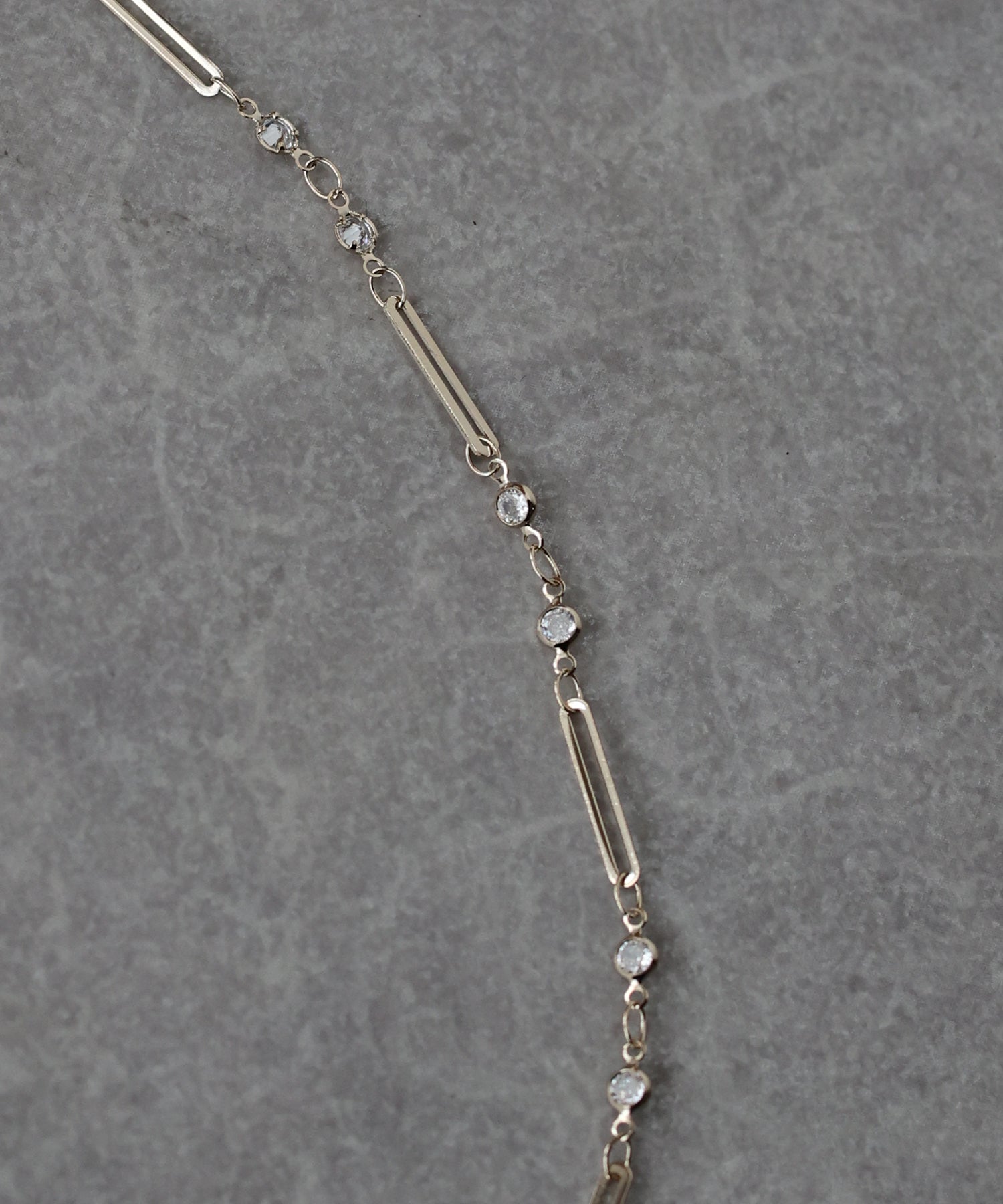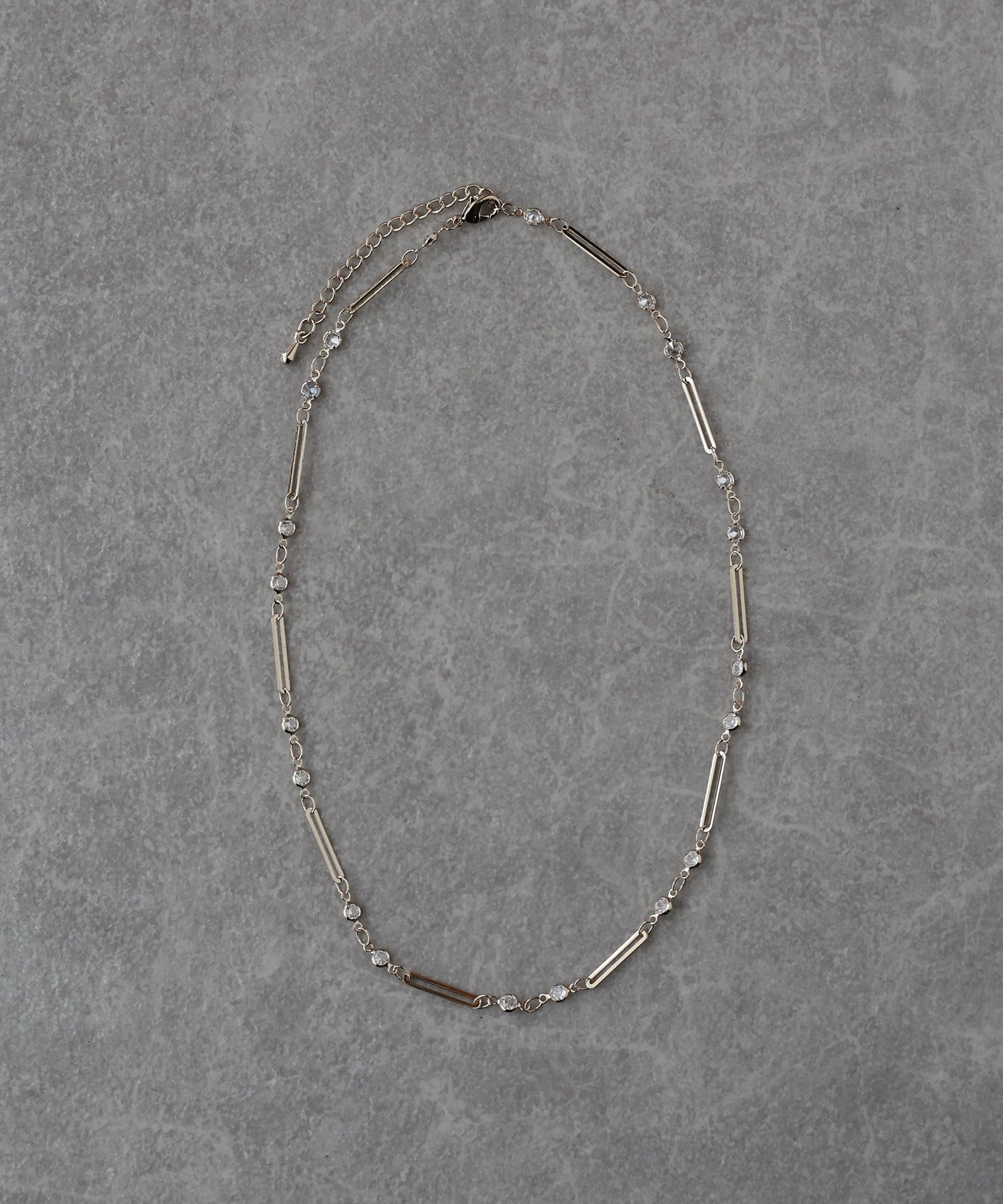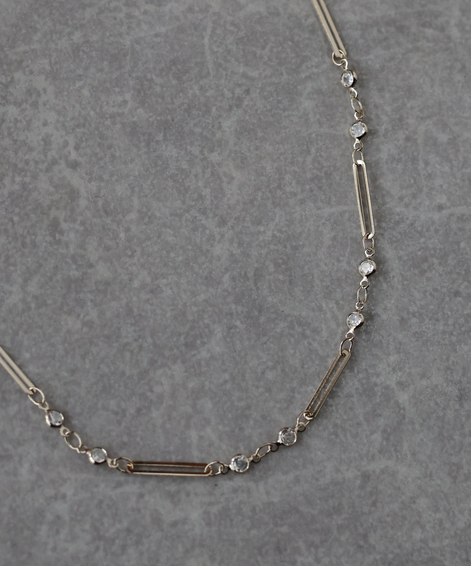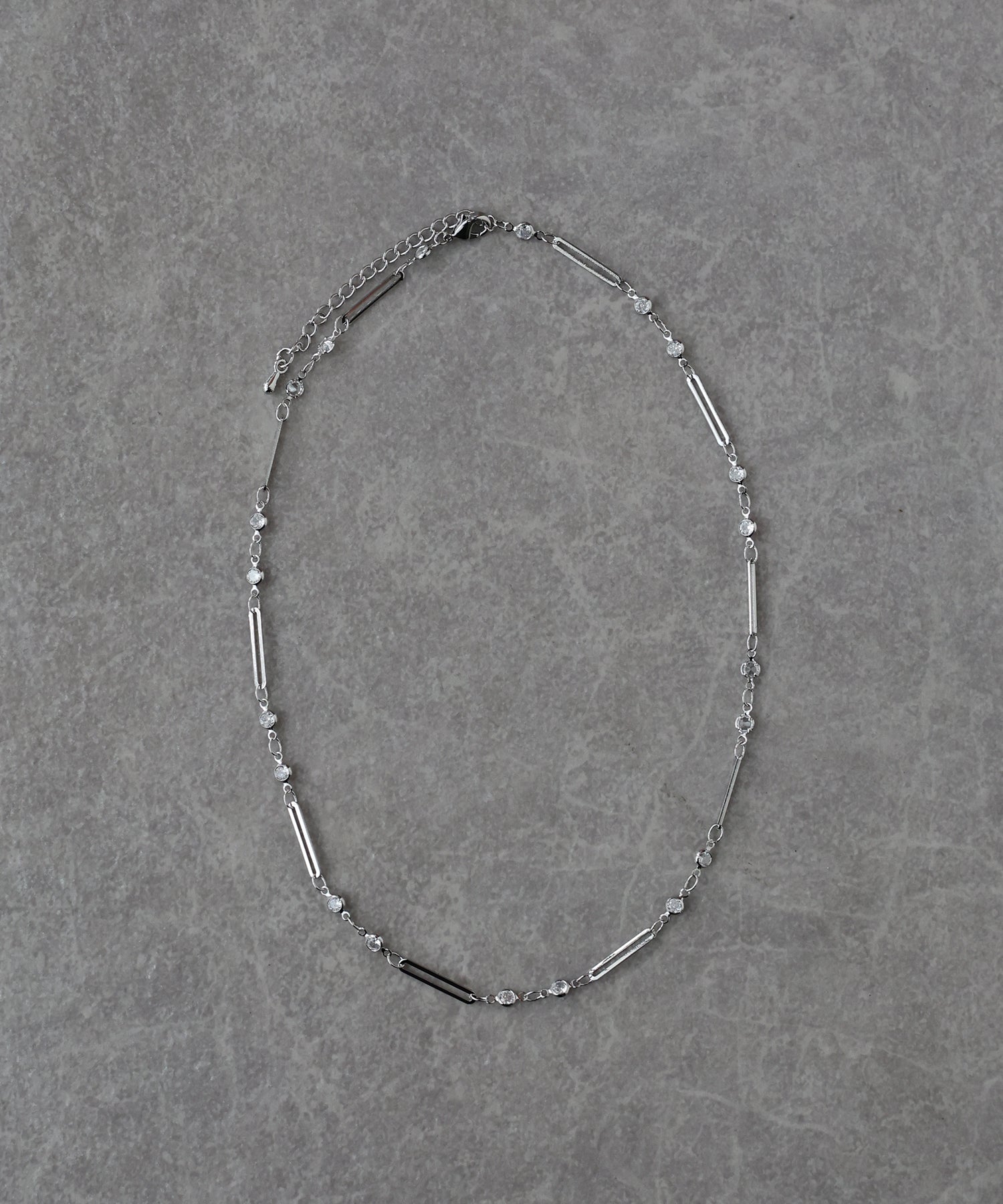 小ぶりなキュービックジルコニアとメタルバーが連なったチェーンネックレス。