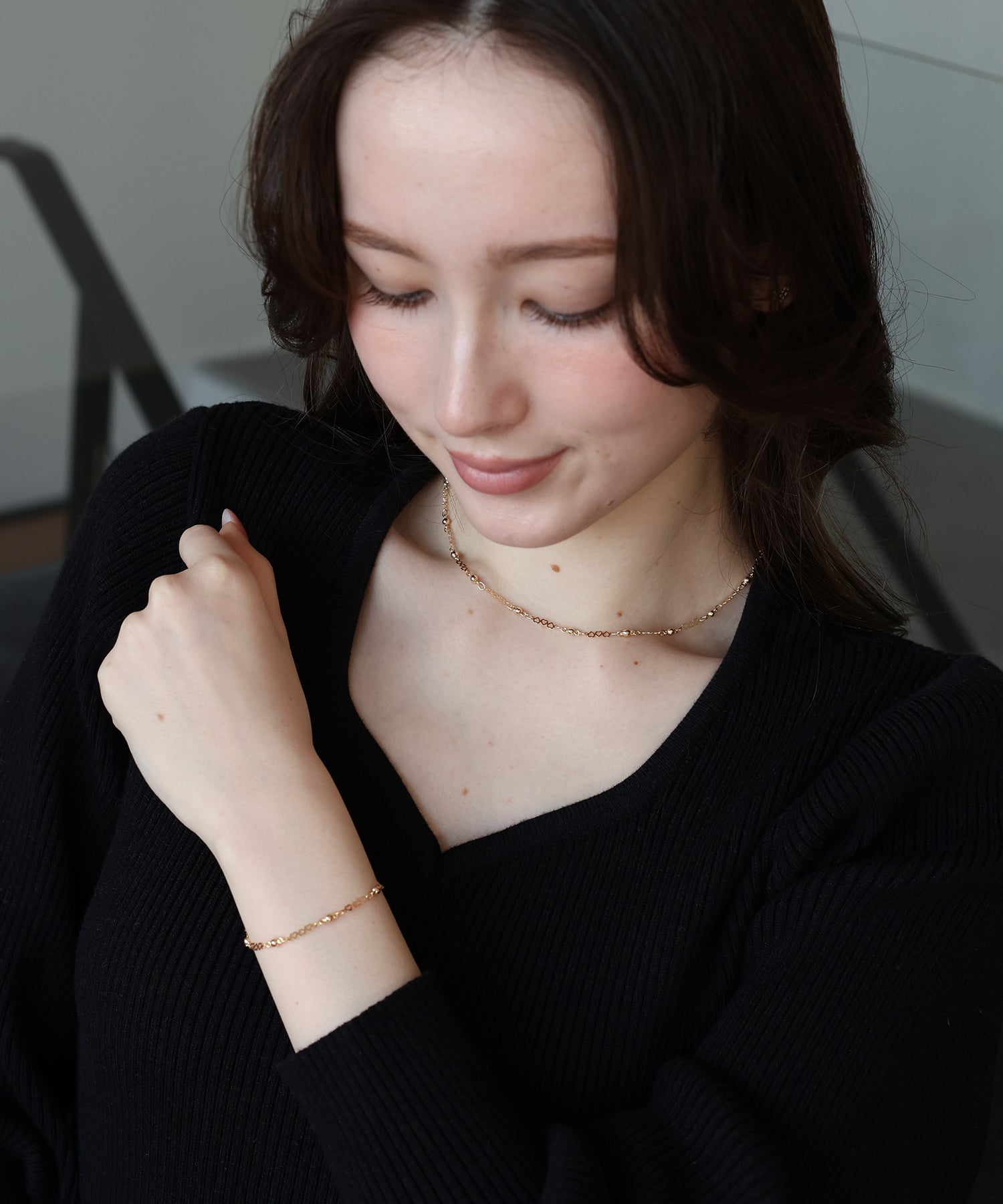 華奢でありながらも存在感のあるネックレスなので1つ付けるだけでコーディネートのさりげないワンポイントに。
