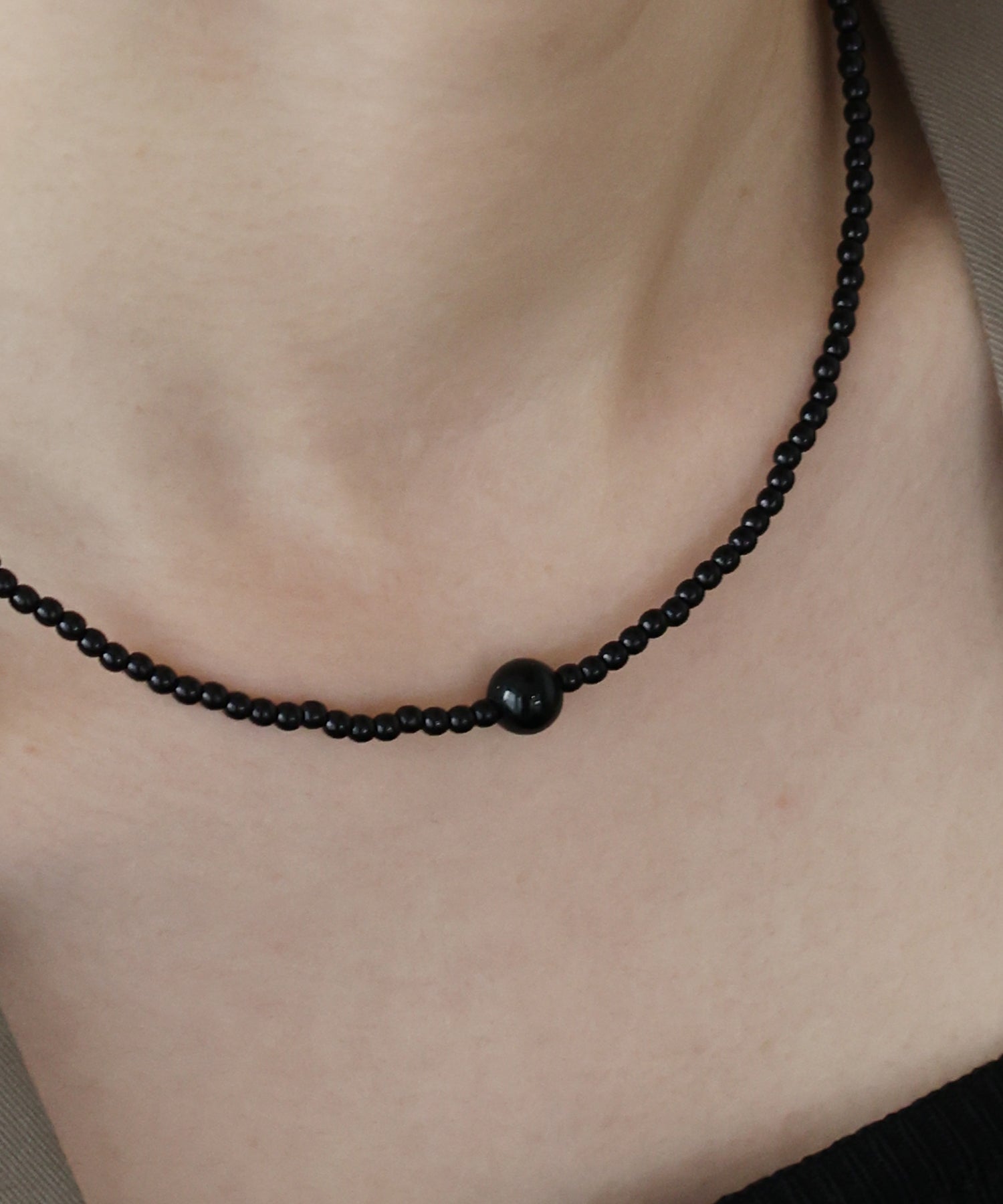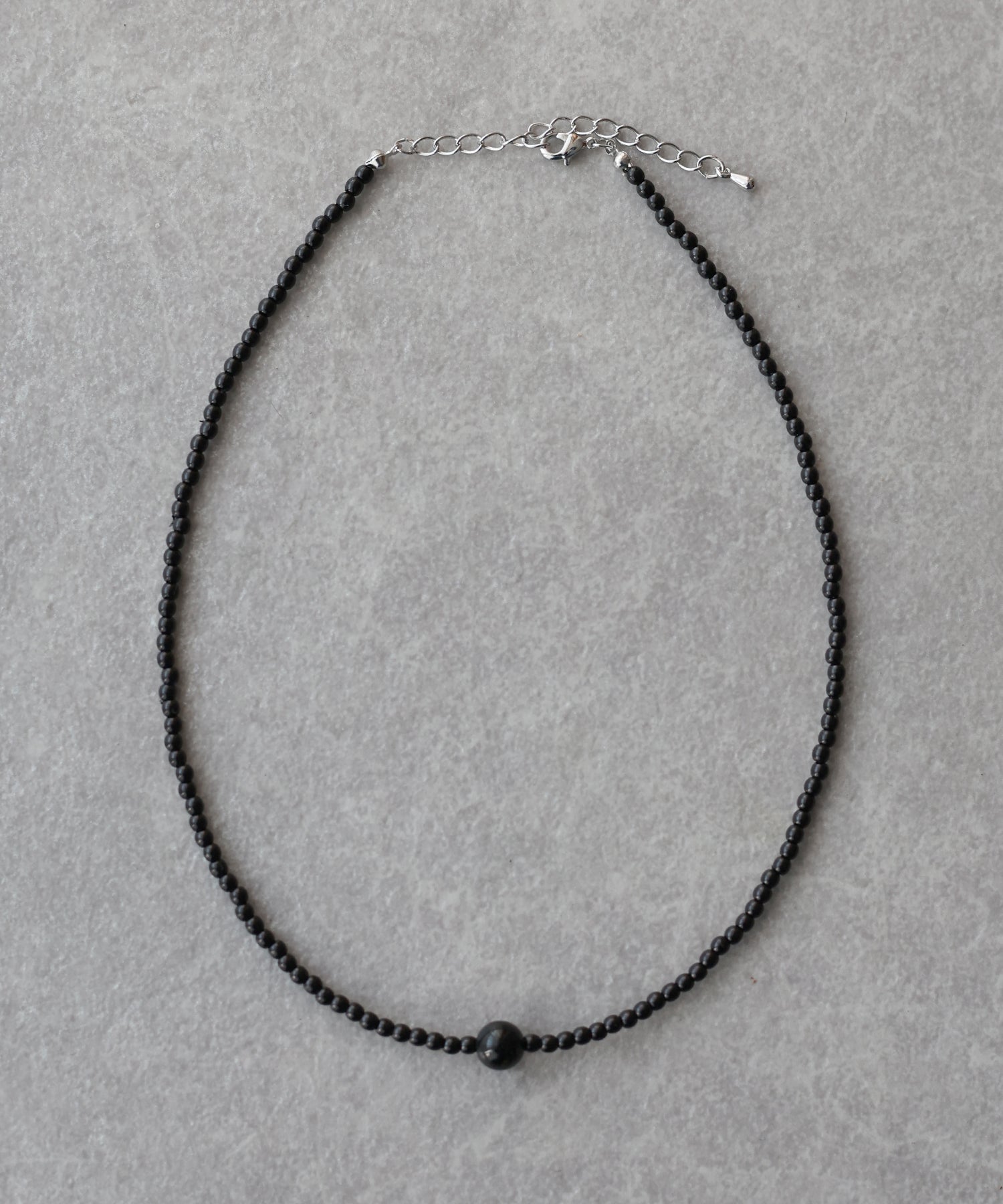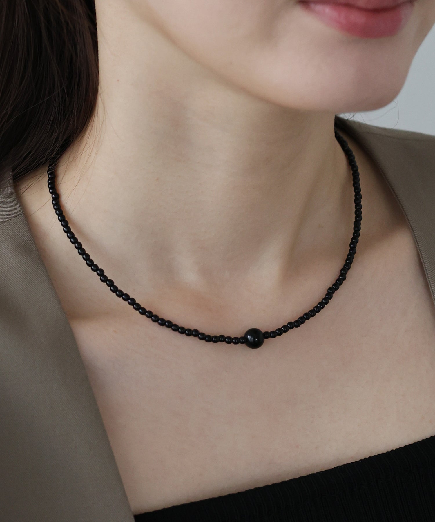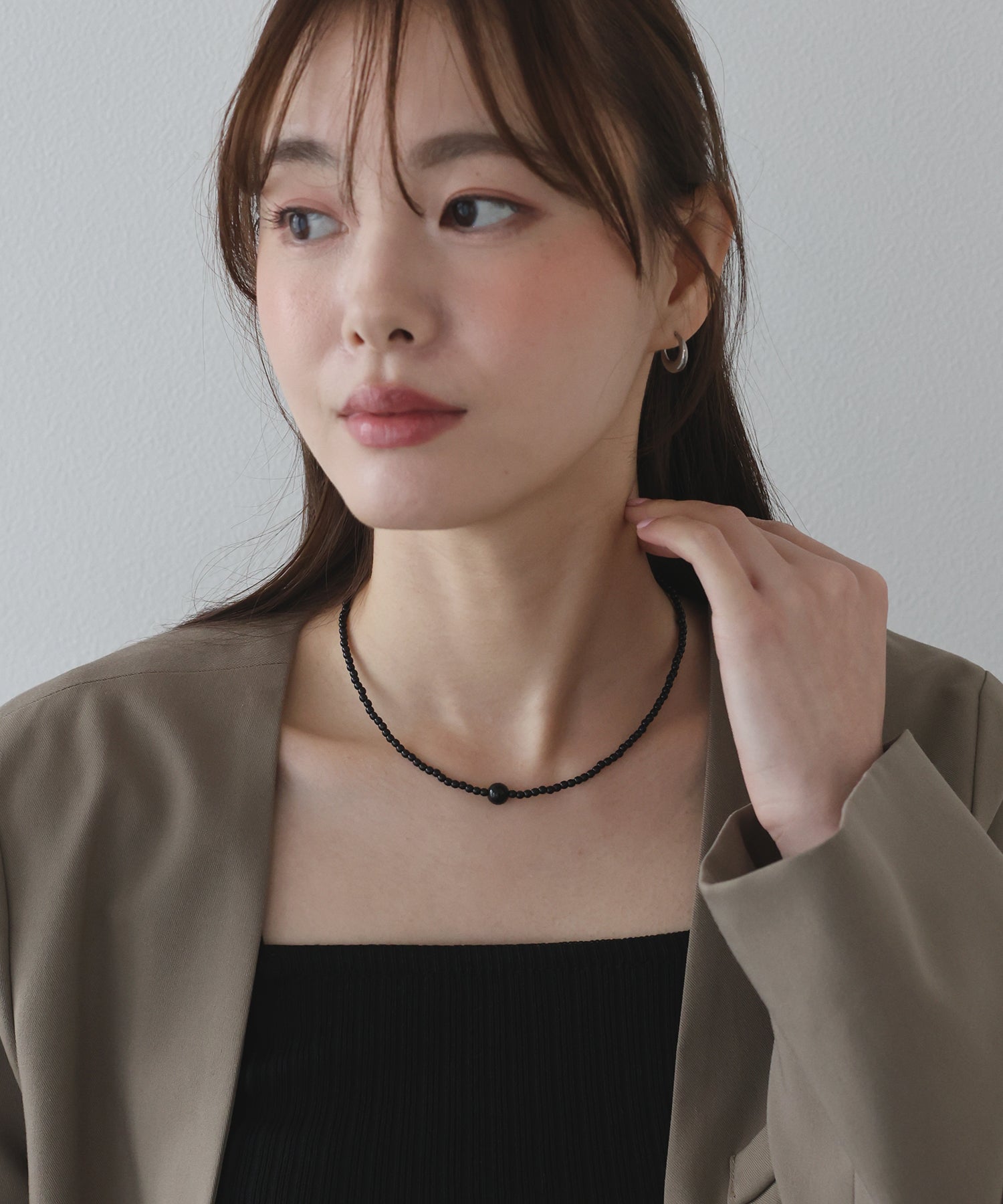 華奢な3mm玉のビーズネックレスのセンターモチーフにはオニキスや淡水パールを配置しメリハリ感をつけました。