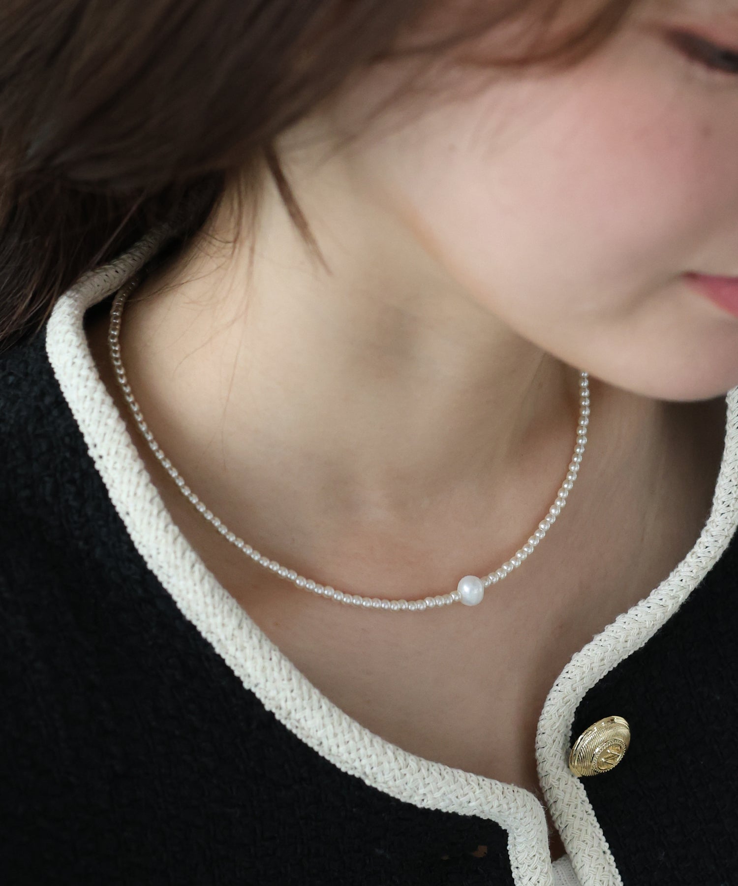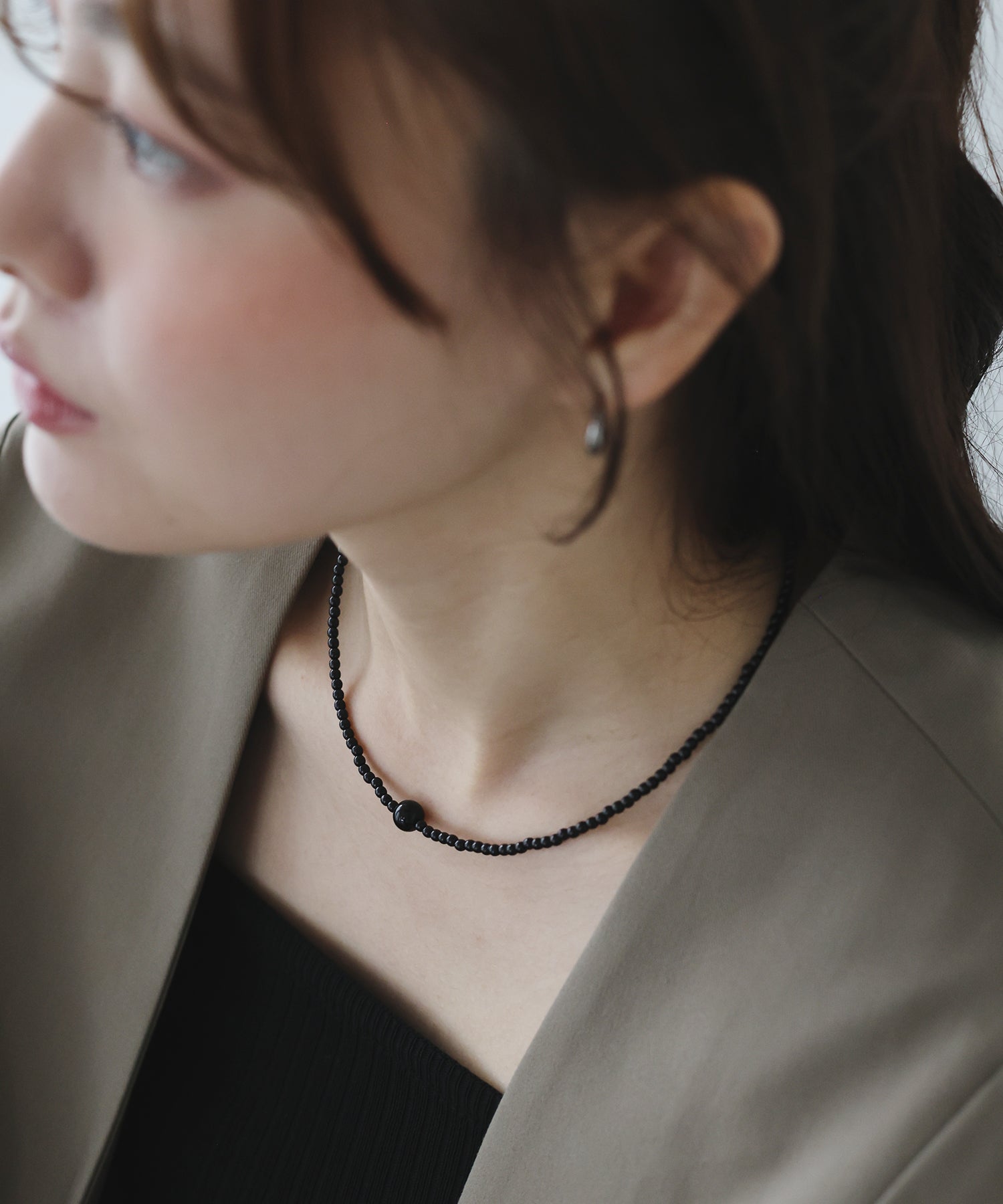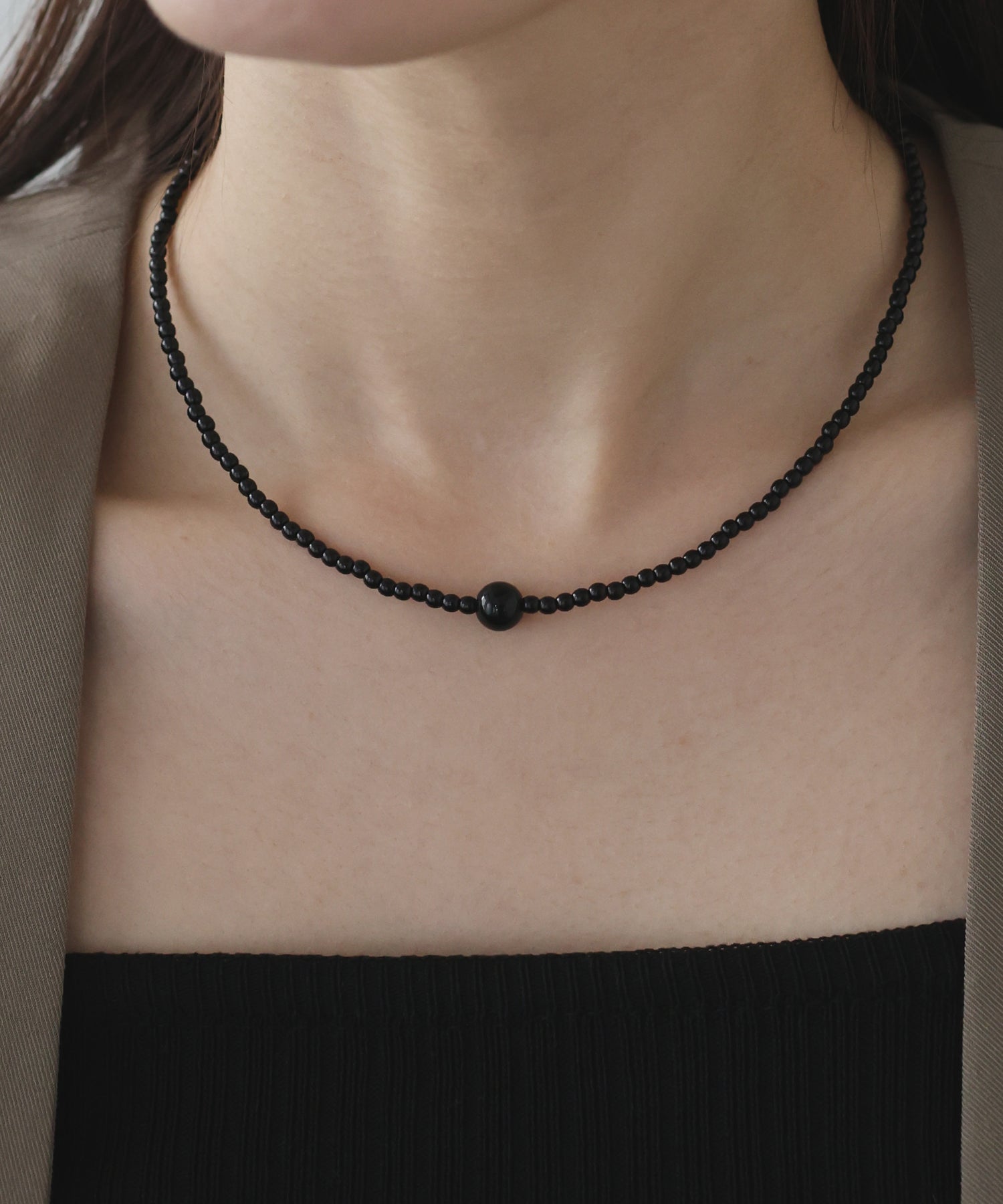 華奢な3mm玉のビーズネックレスのセンターモチーフにはオニキスや淡水パールを配置しメリハリ感をつけました。