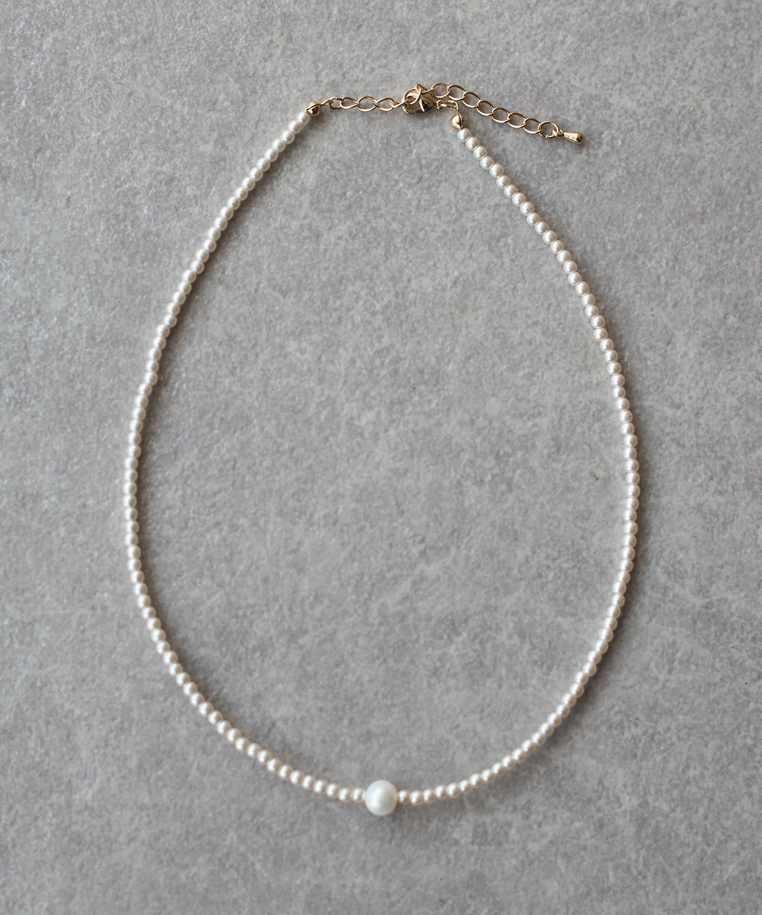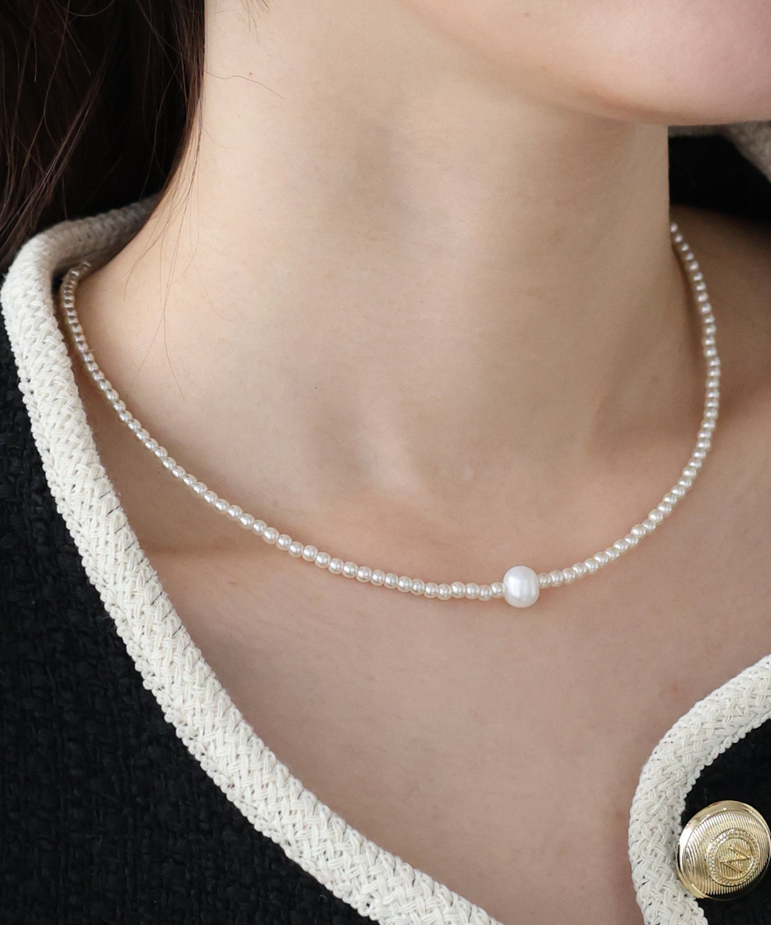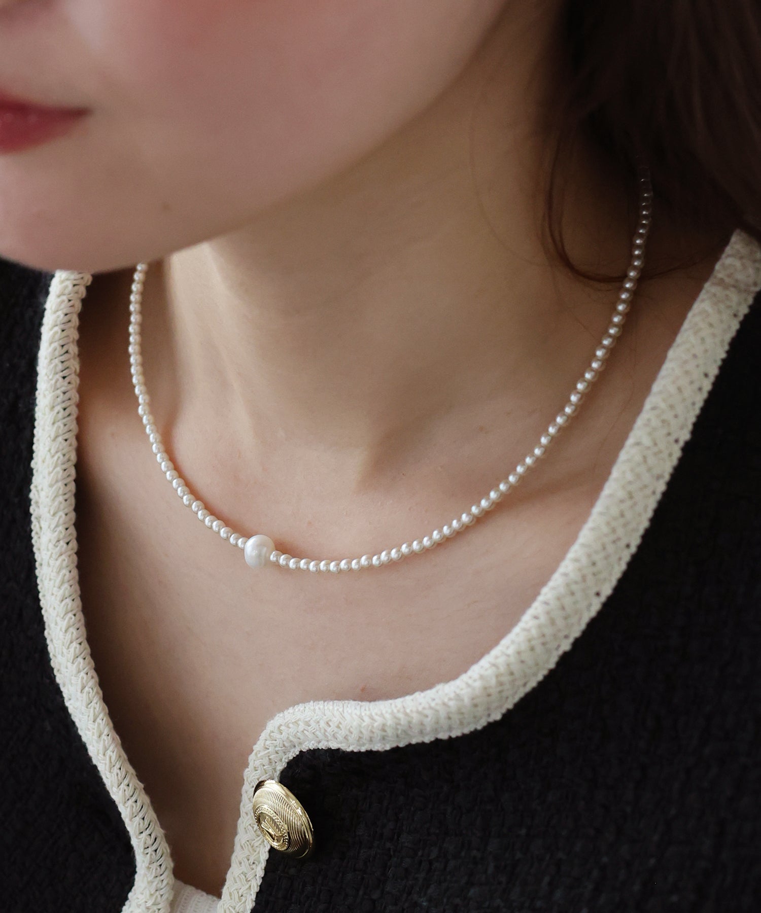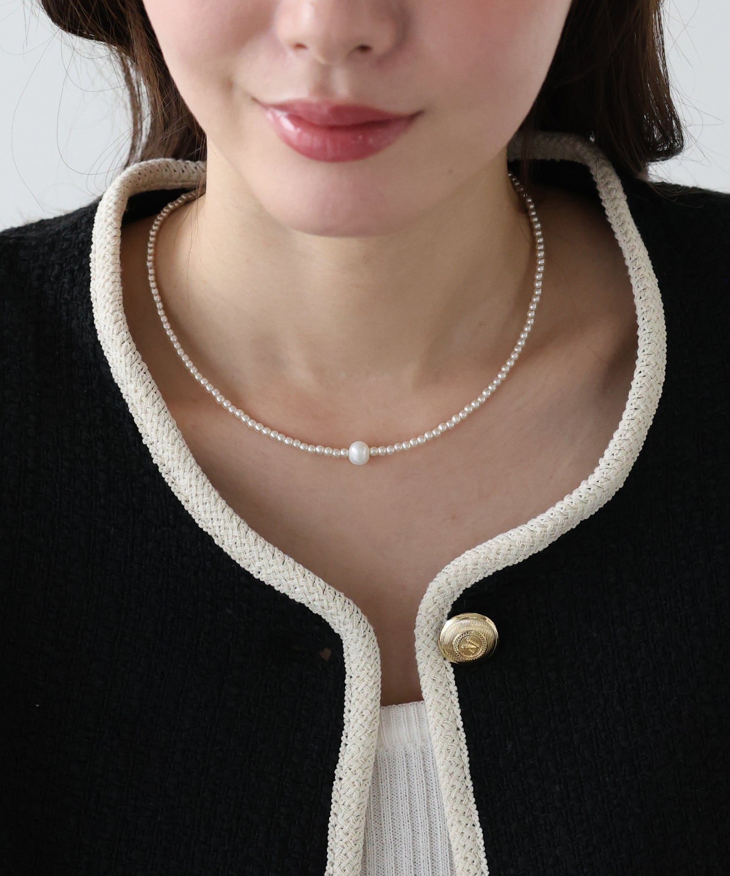 華奢な3mm玉のビーズネックレスのセンターモチーフにはオニキスや淡水パールを配置しメリハリ感をつけました。