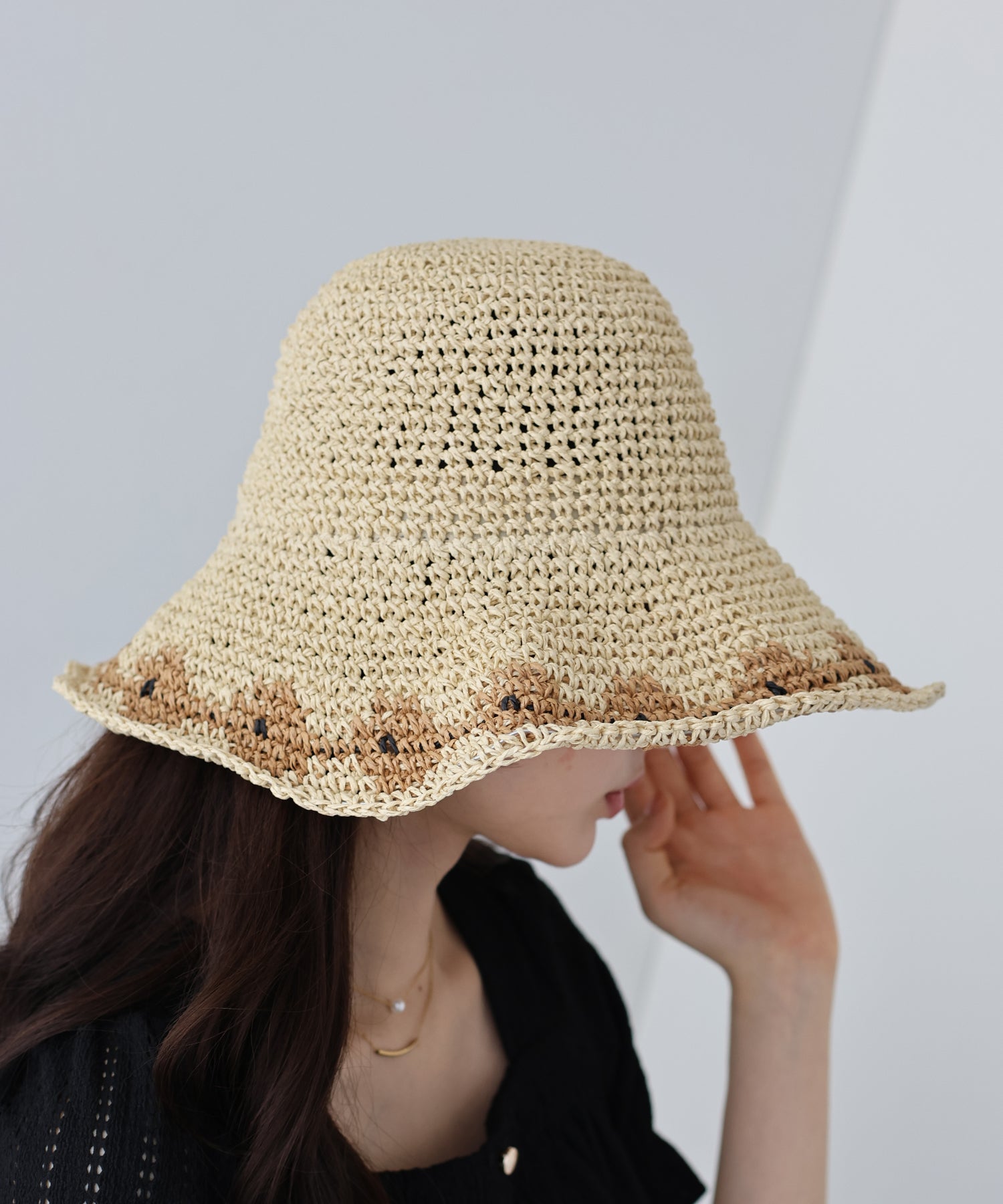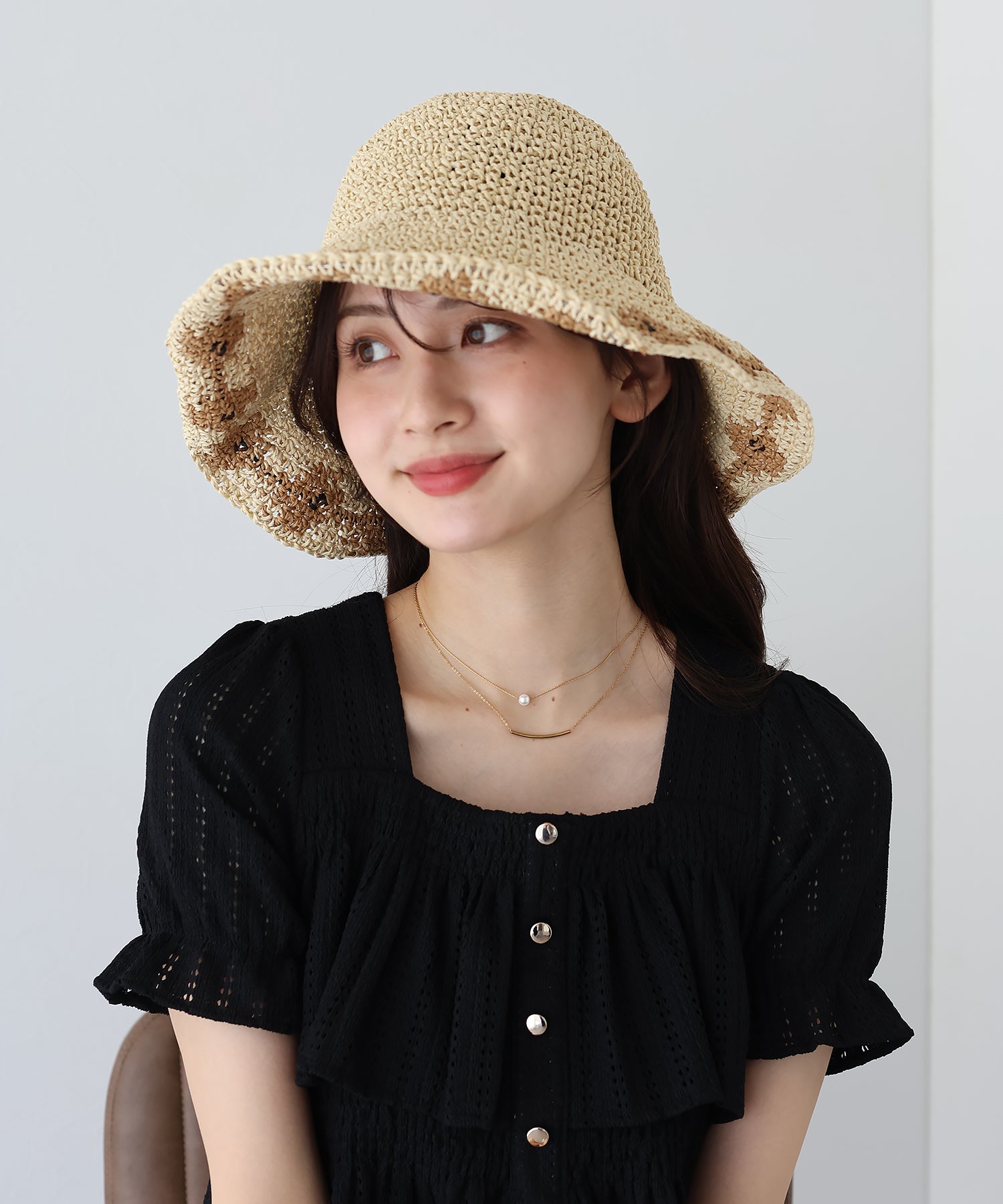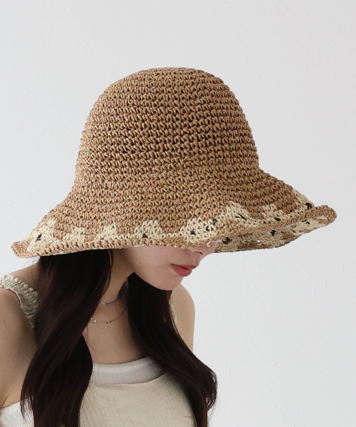 つばにあしらわれたバイカラーのフラワーモチーフが、遊び心のあるデザイン。