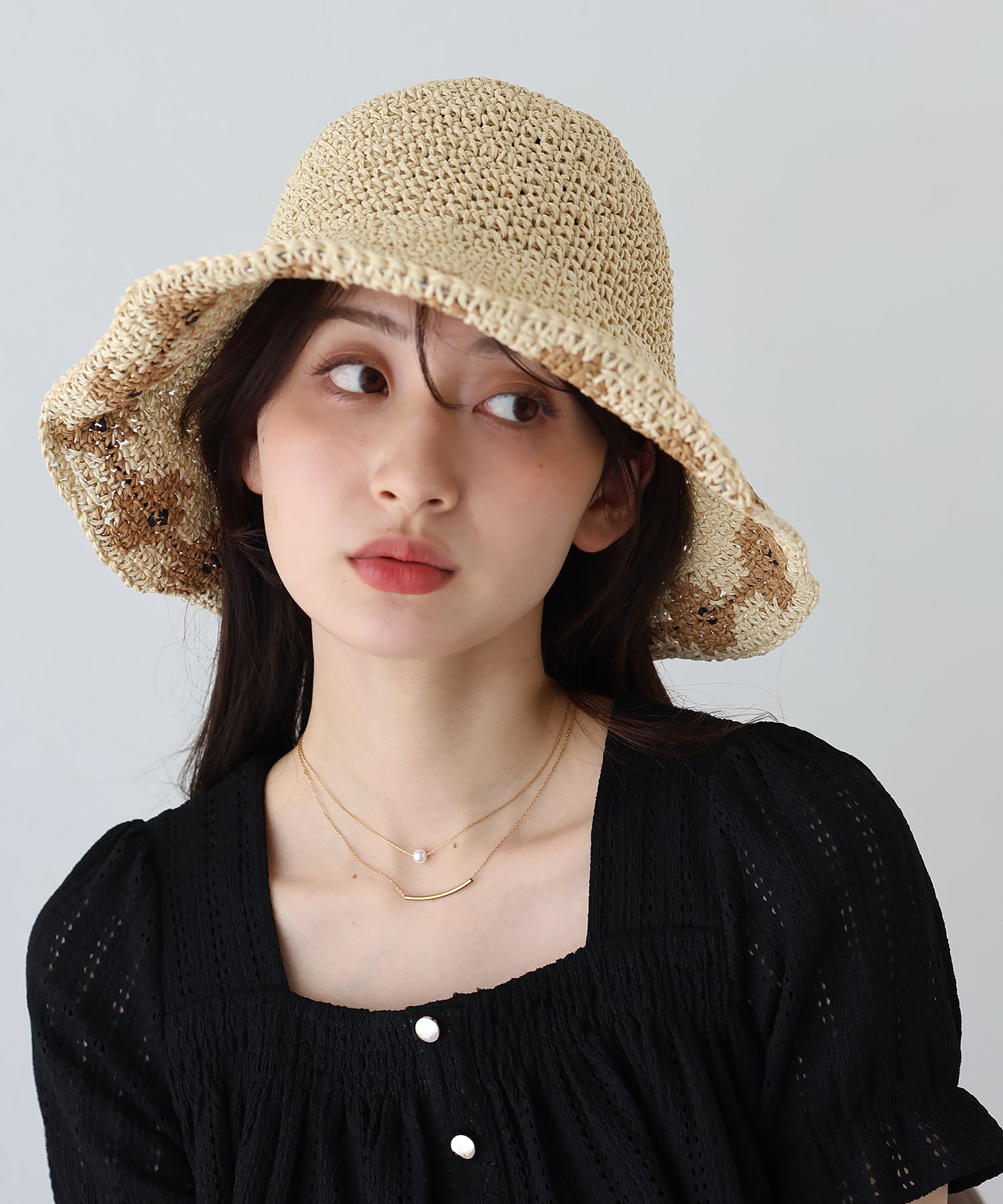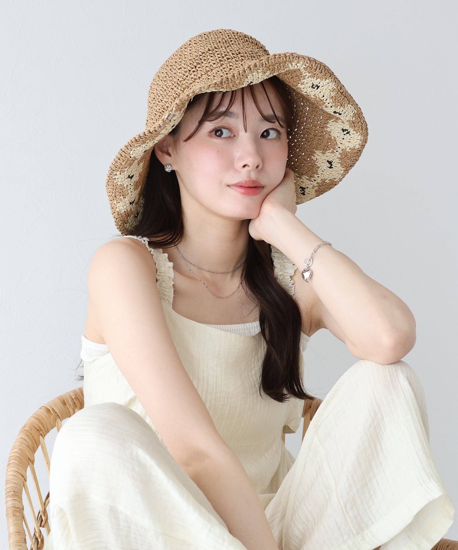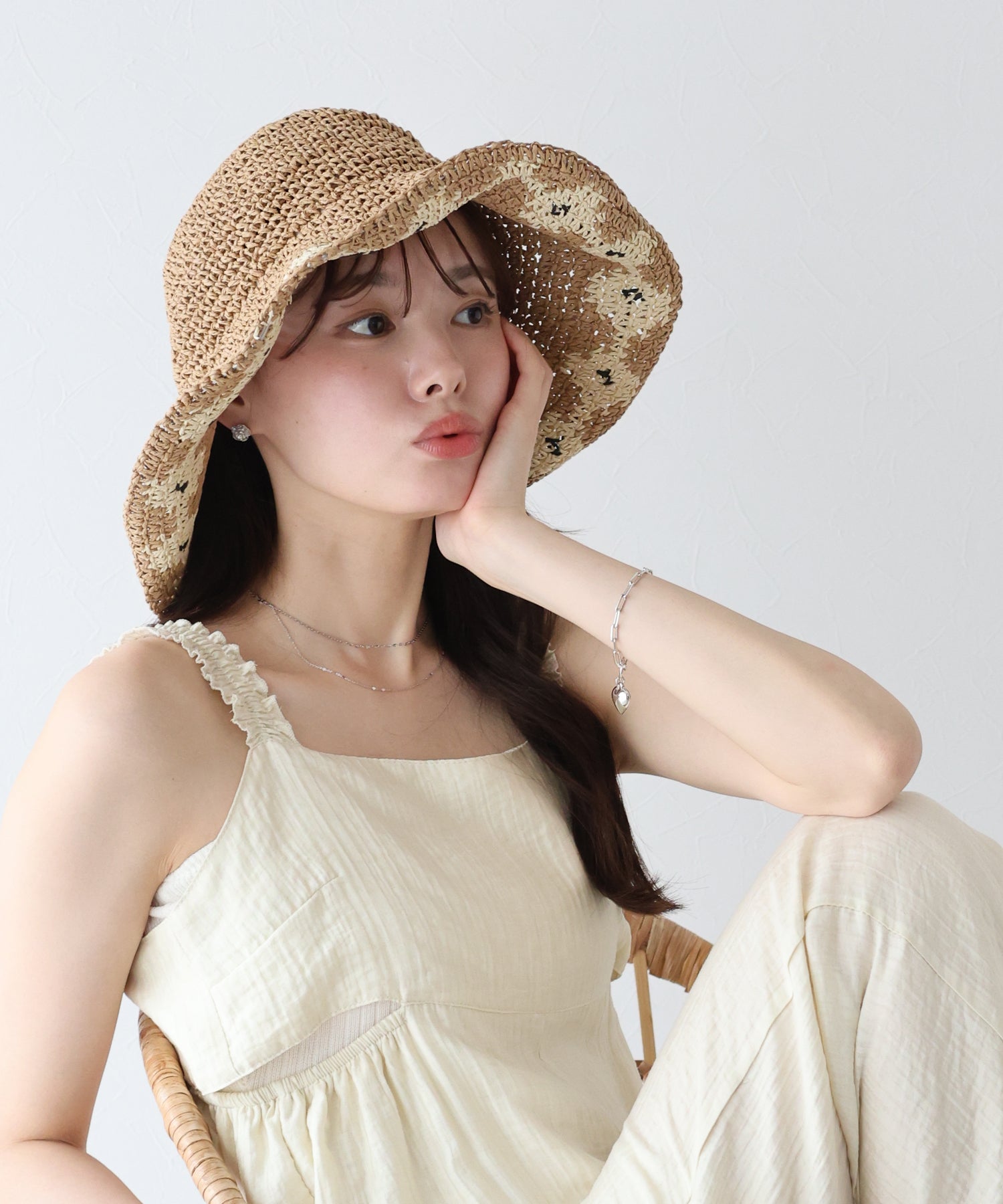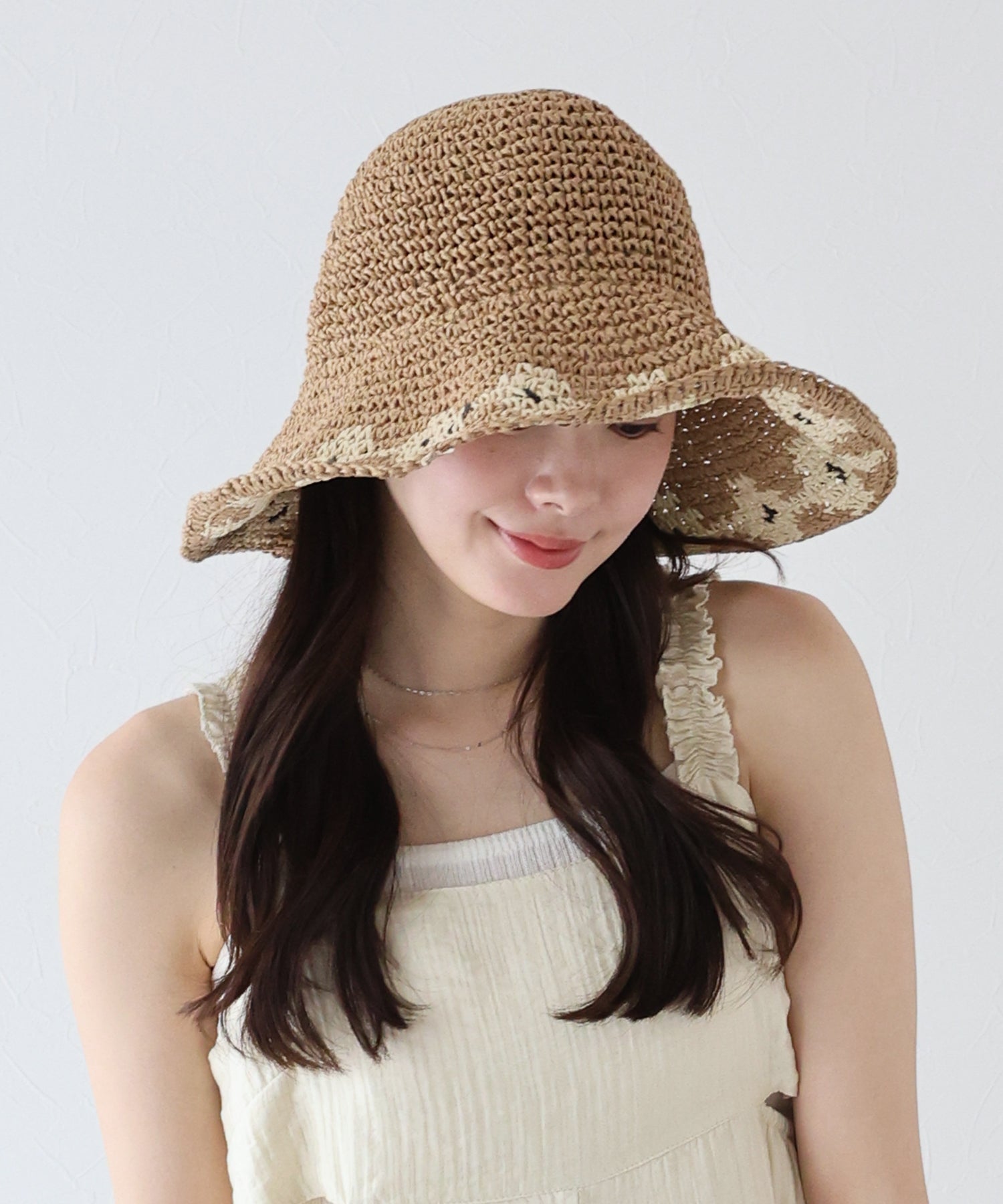 つばにあしらわれたバイカラーのフラワーモチーフが、遊び心のあるデザイン。