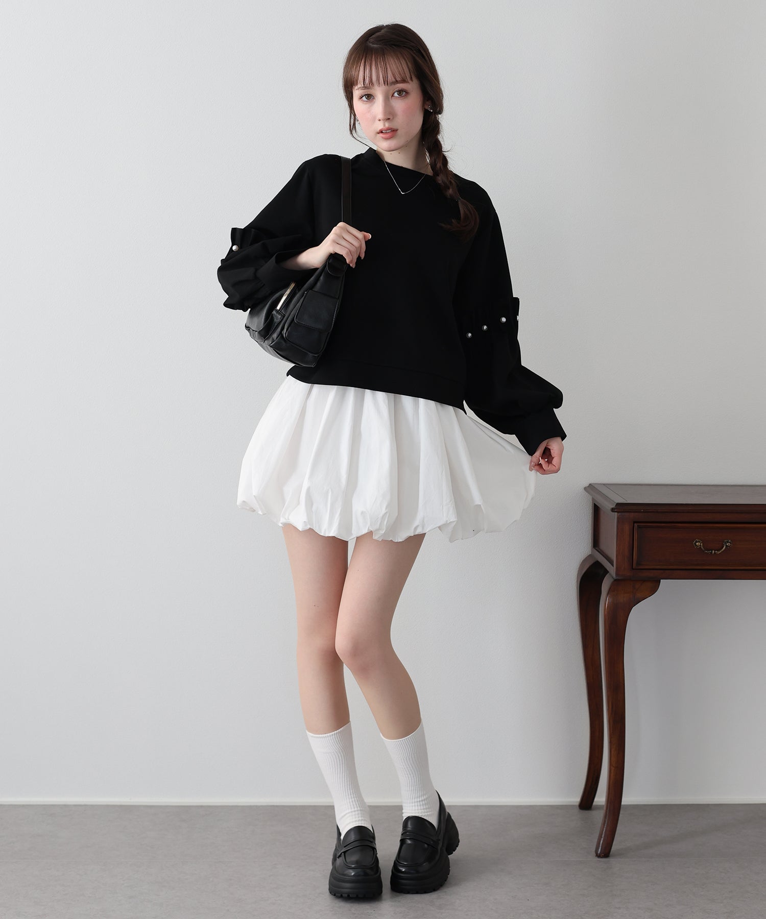 袖にたっぷりと寄せたギャザーが立体的なボリュームシルエットを生み出し、パールが上品な華やかさをプラスします。