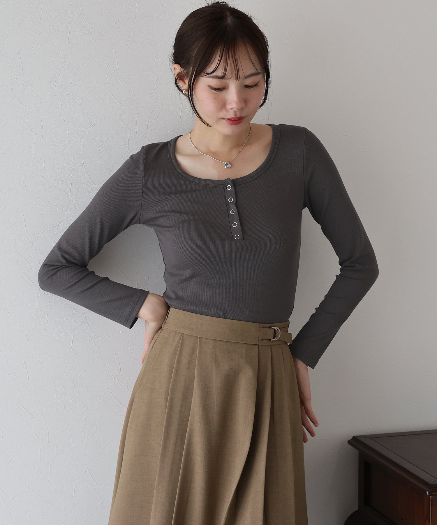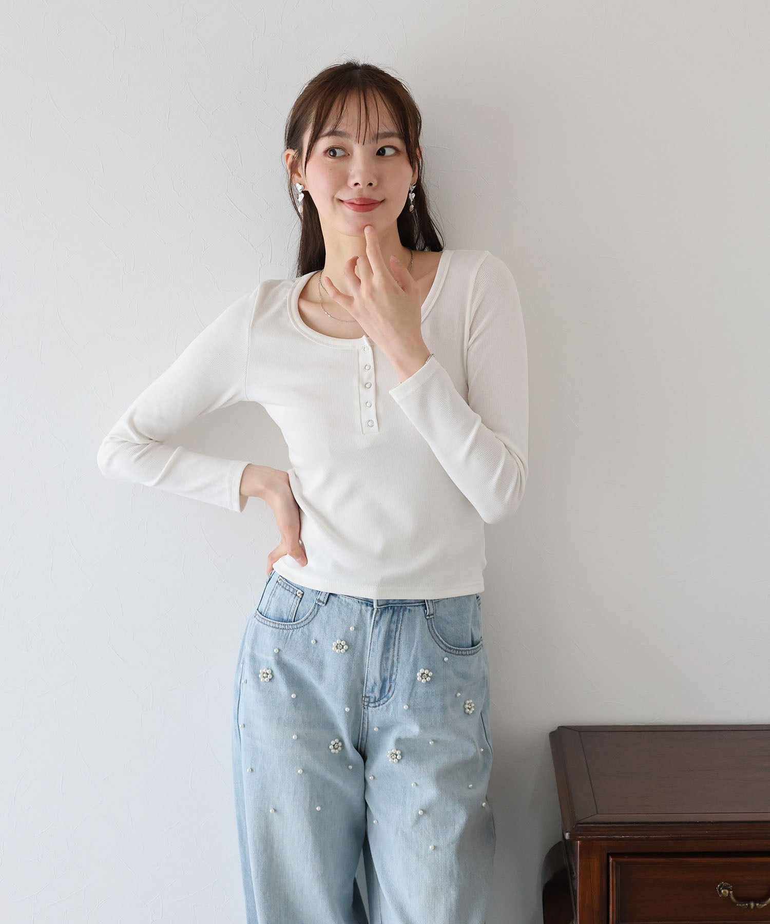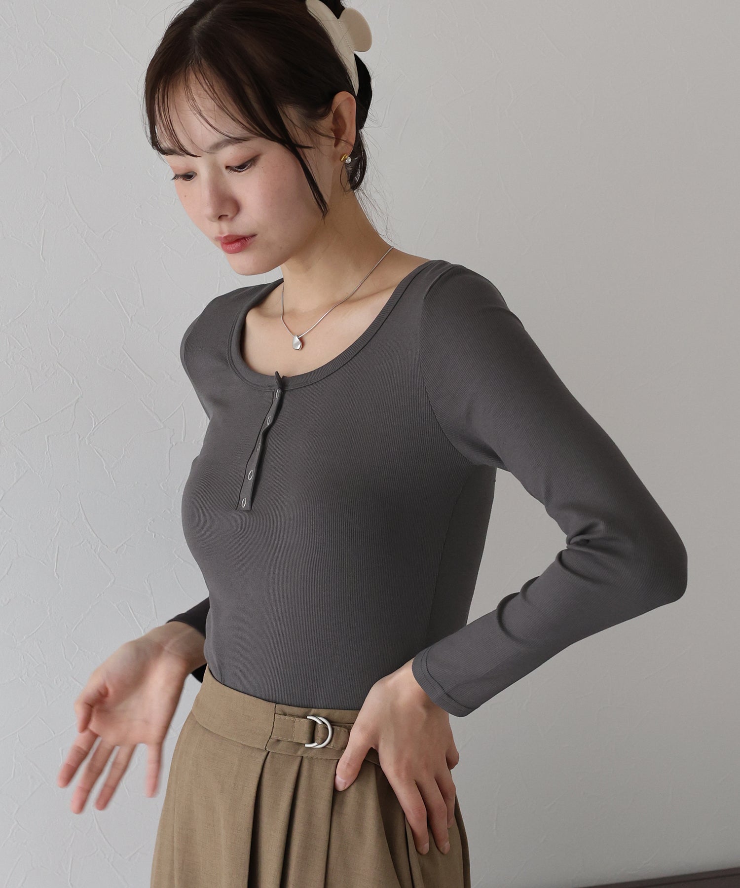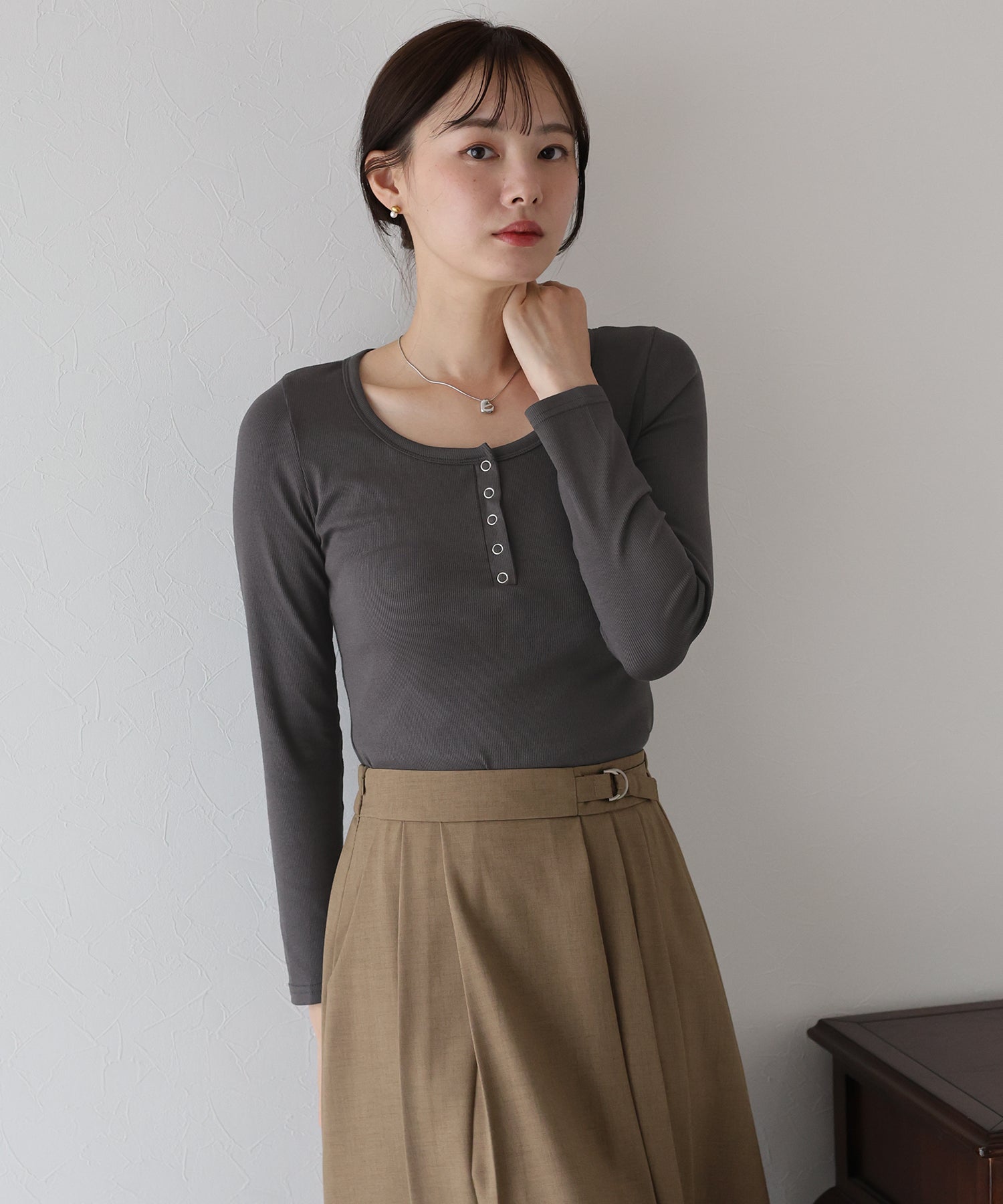 女性らしさと程よいカジュアル感を両立した、ヘンリーネックTシャツ