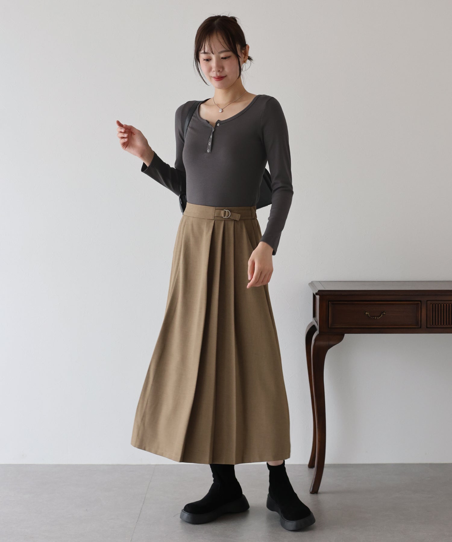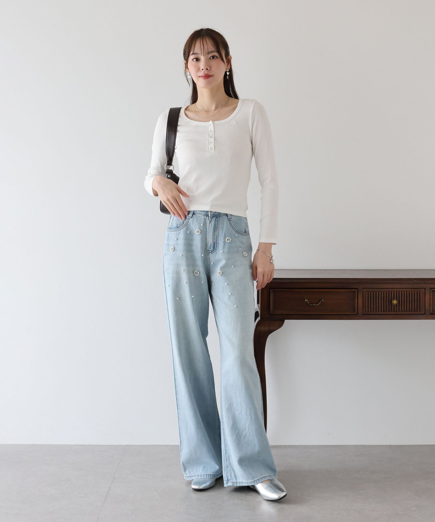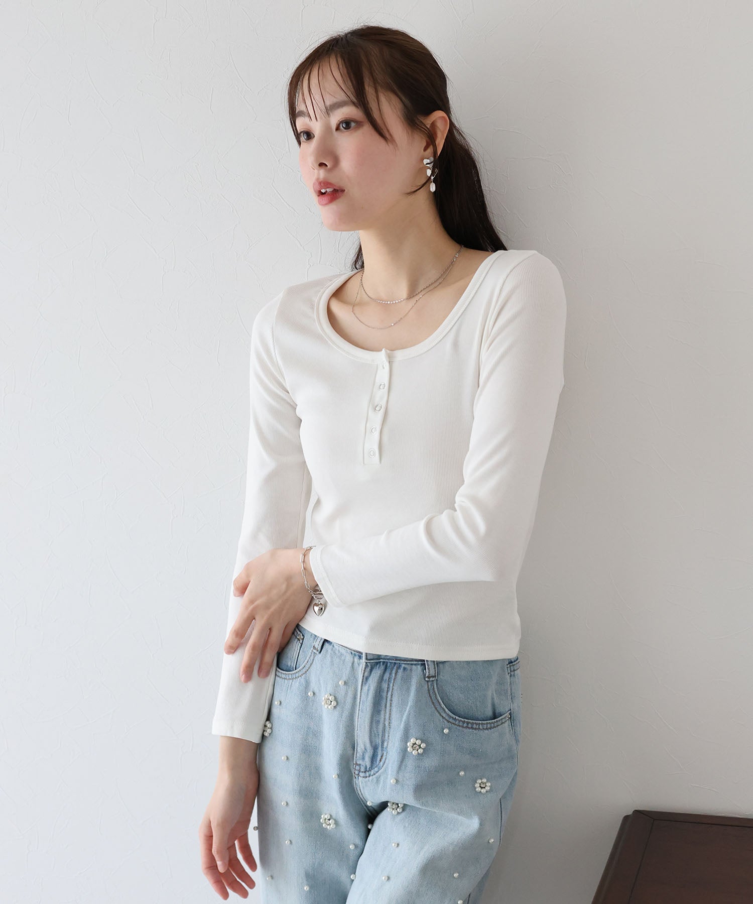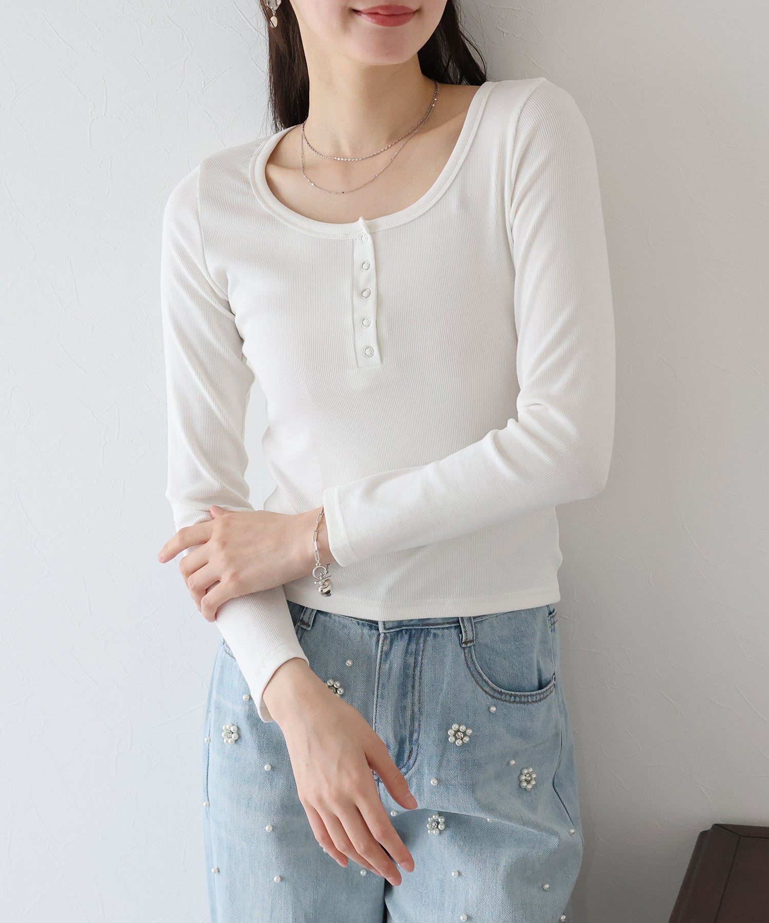 女性らしさと程よいカジュアル感を両立した、ヘンリーネックTシャツ