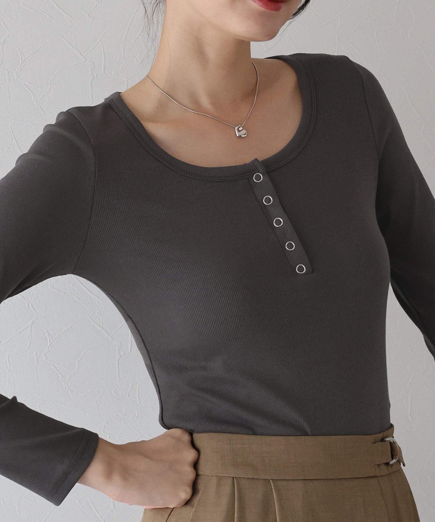 上からジャケットやカーディガンを羽織っても、スナップボタンがアクセントになってスタイリングの幅を広げてくれます。