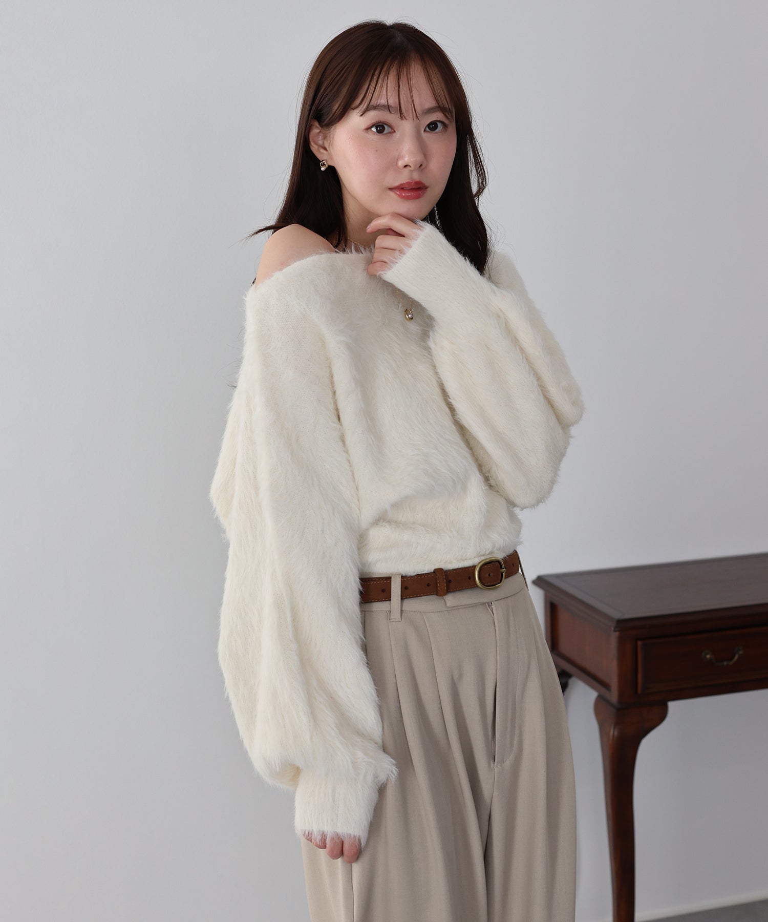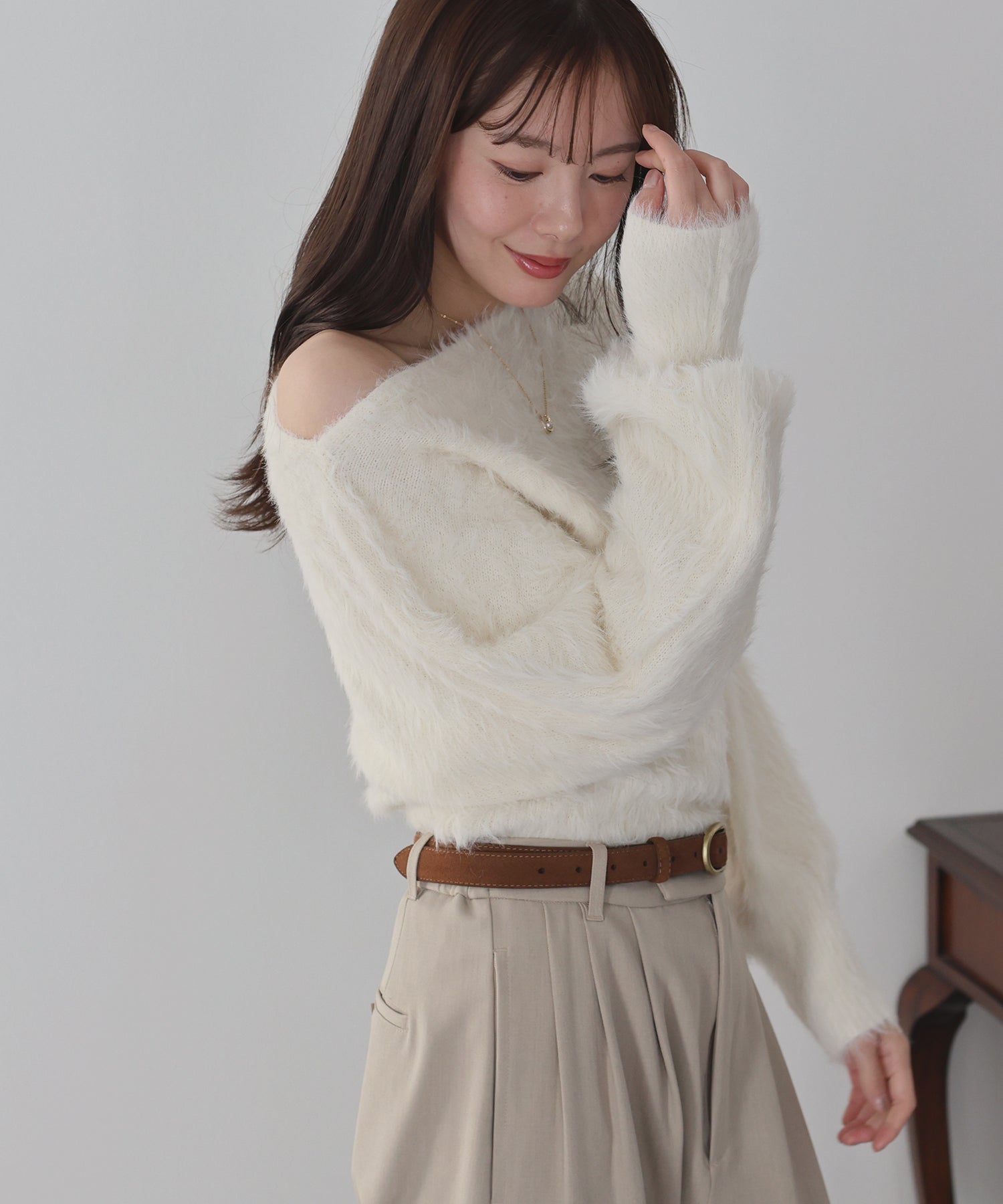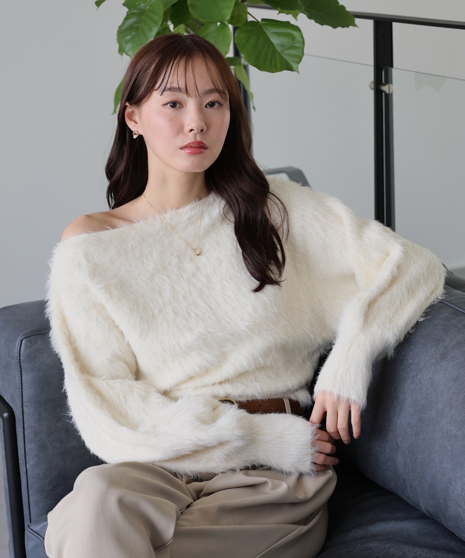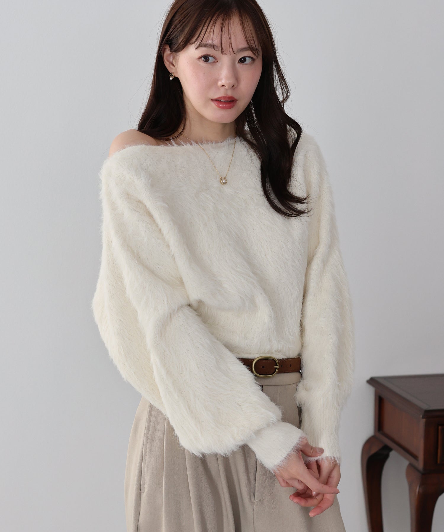 ふんわりとした起毛感が冬らしいオフショルダーシャギーニット。