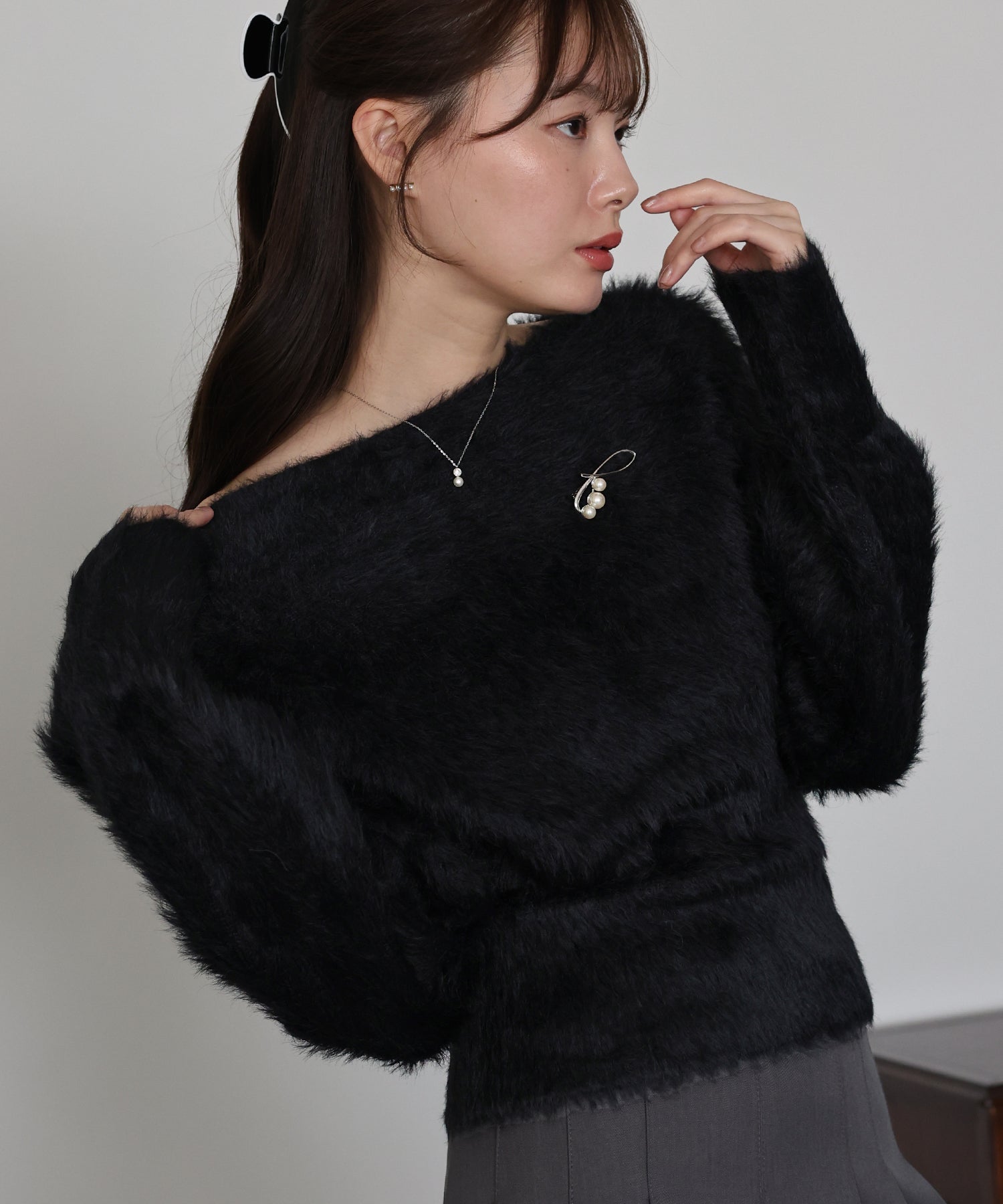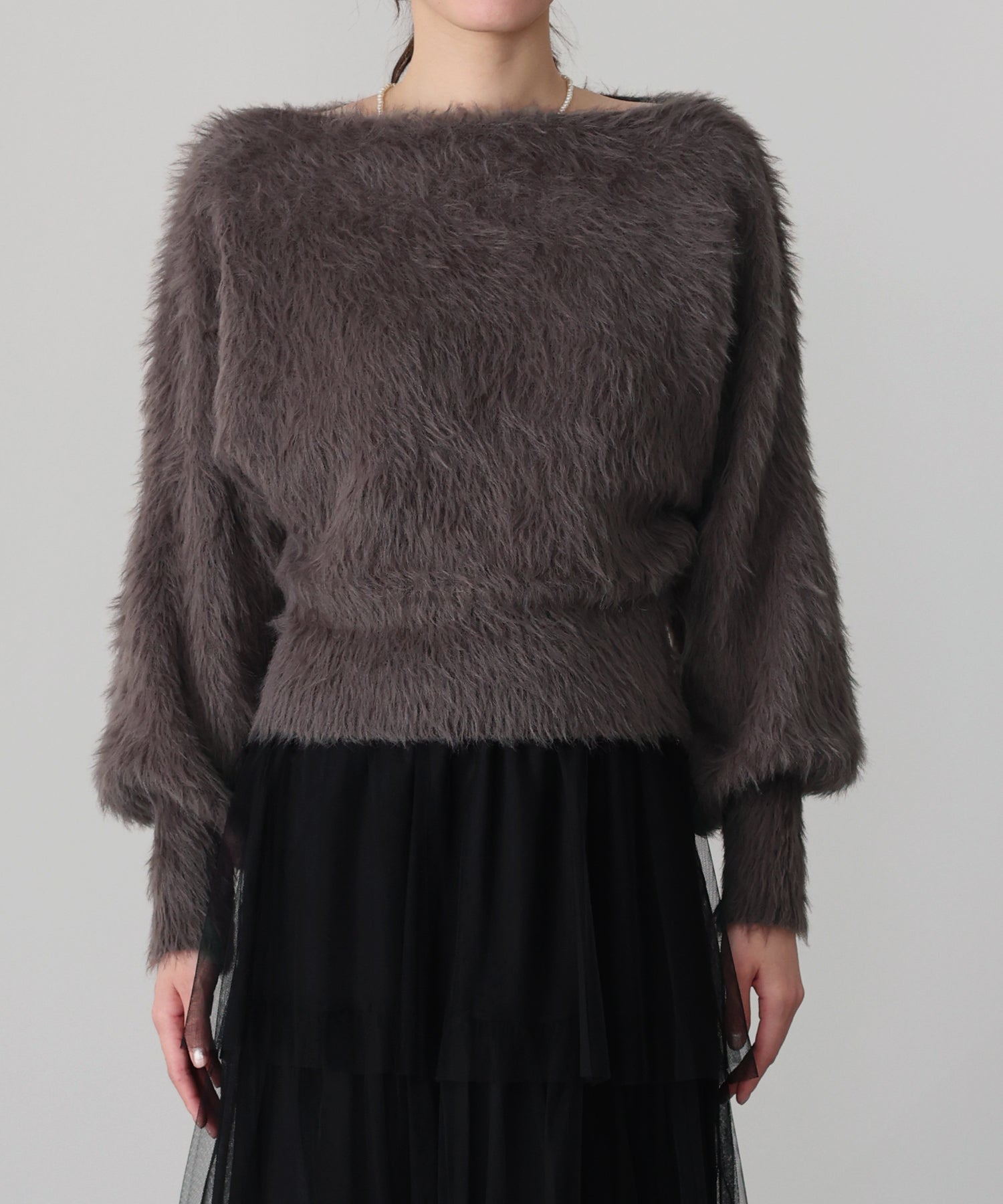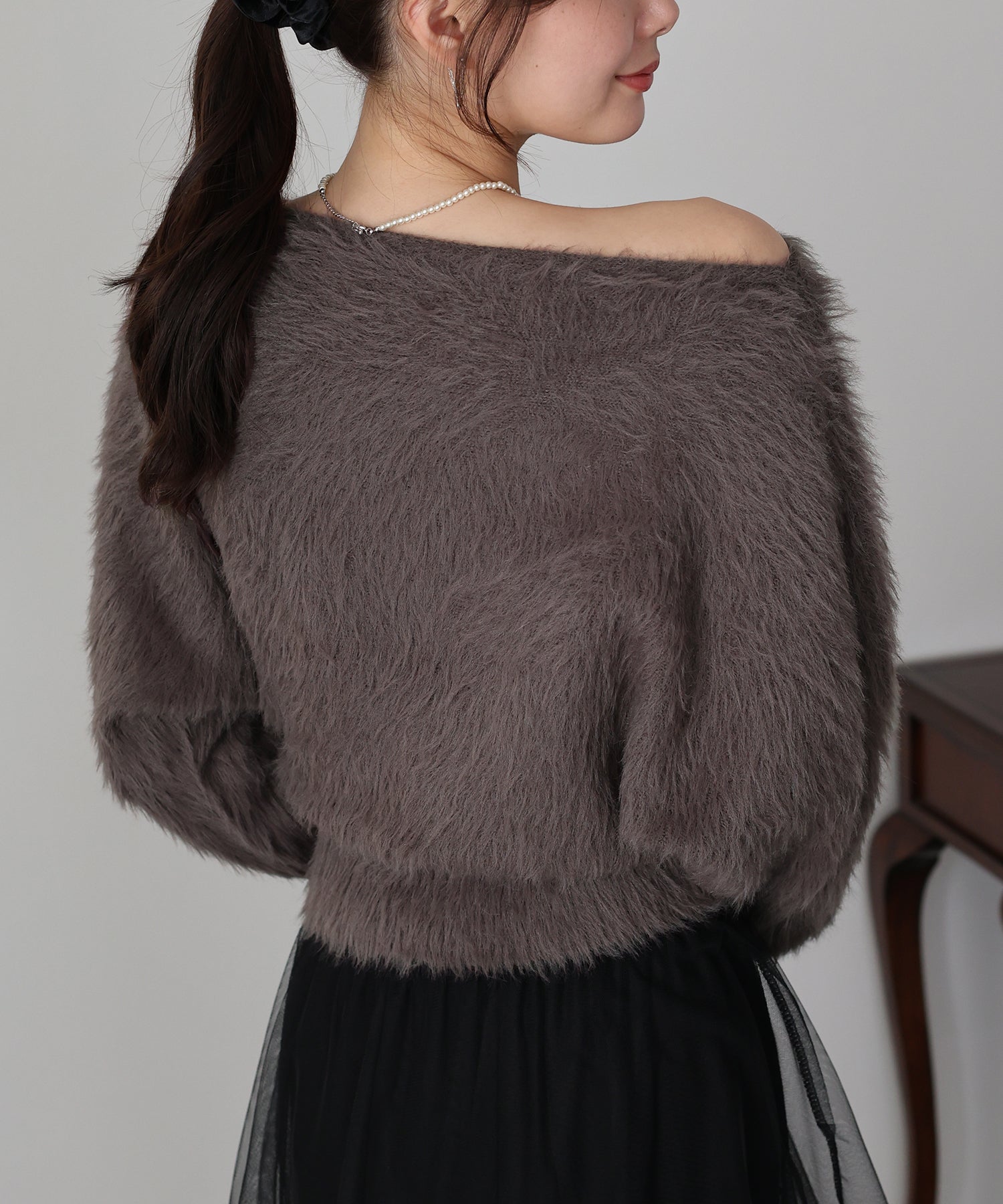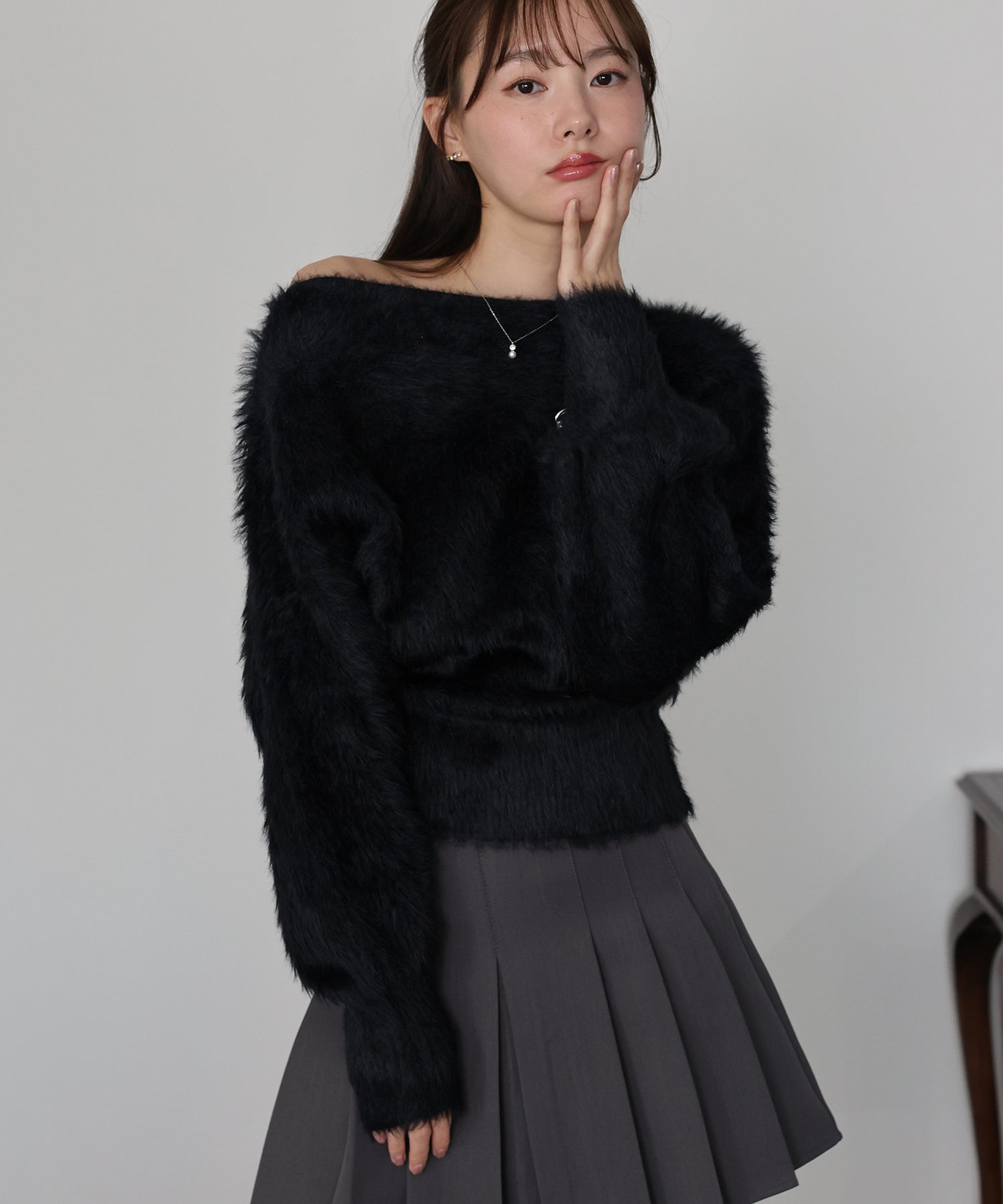 ふんわりとした起毛感が冬らしいオフショルダーシャギーニット。