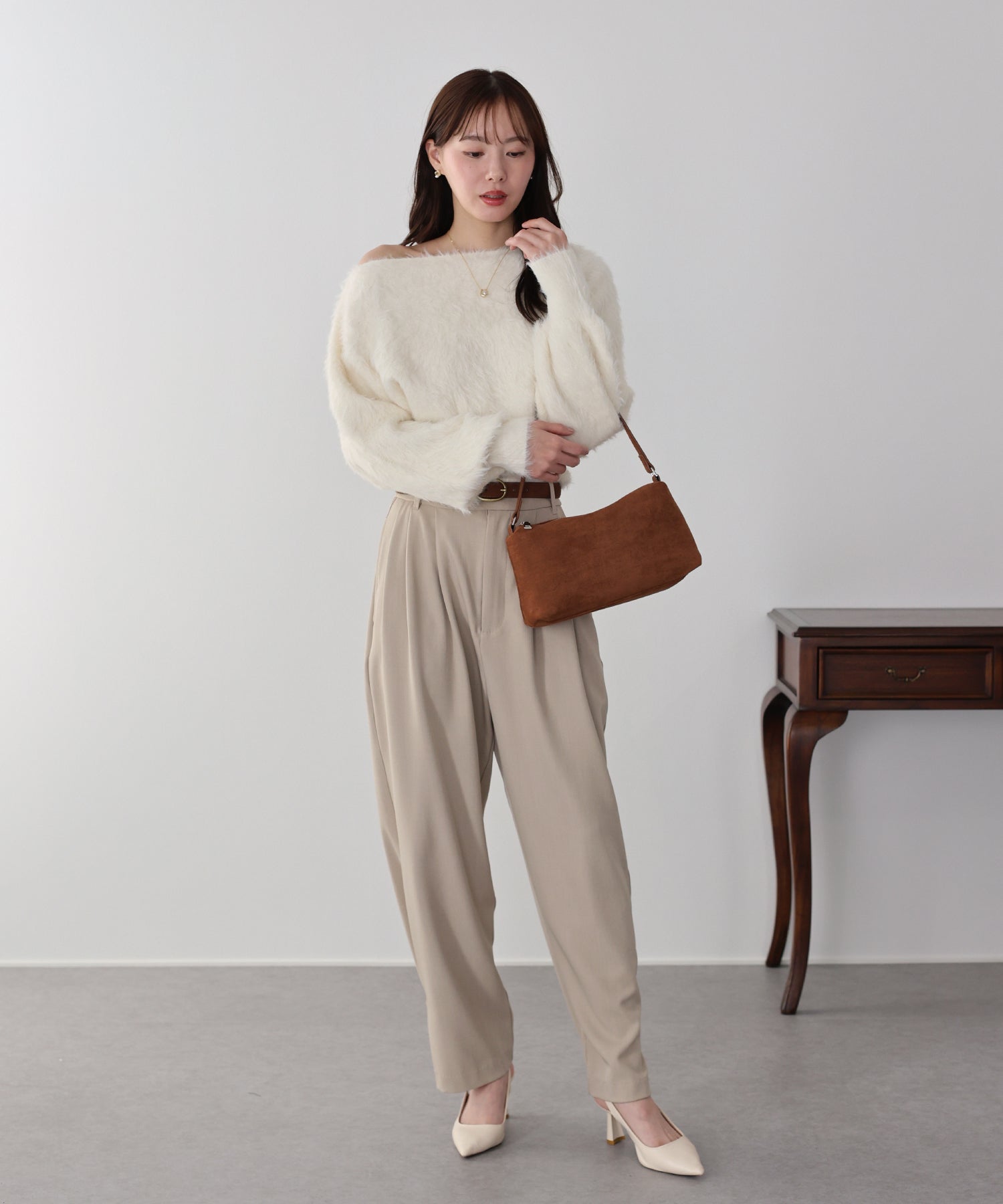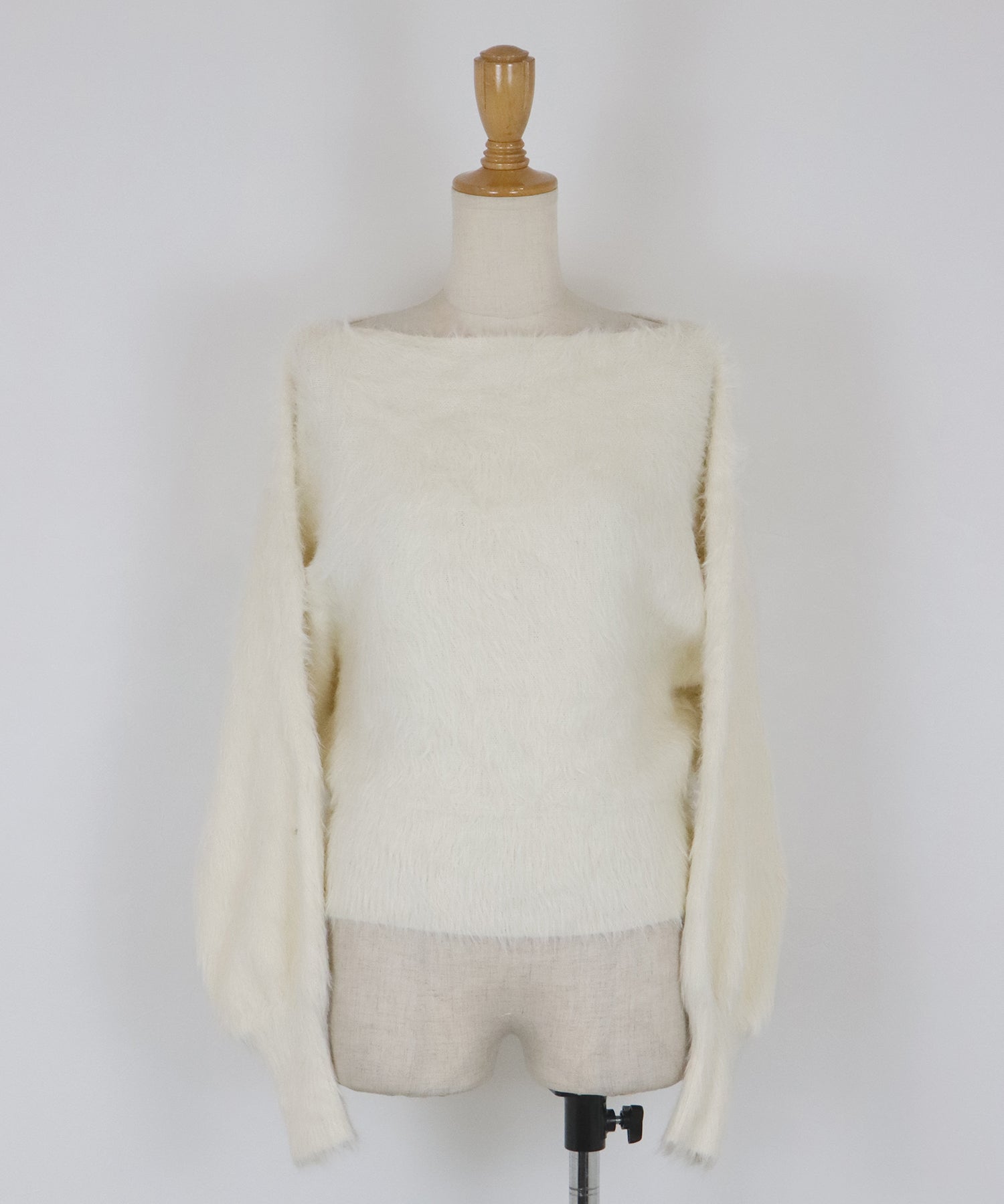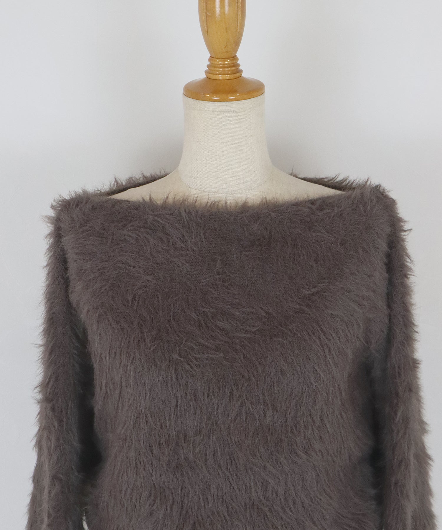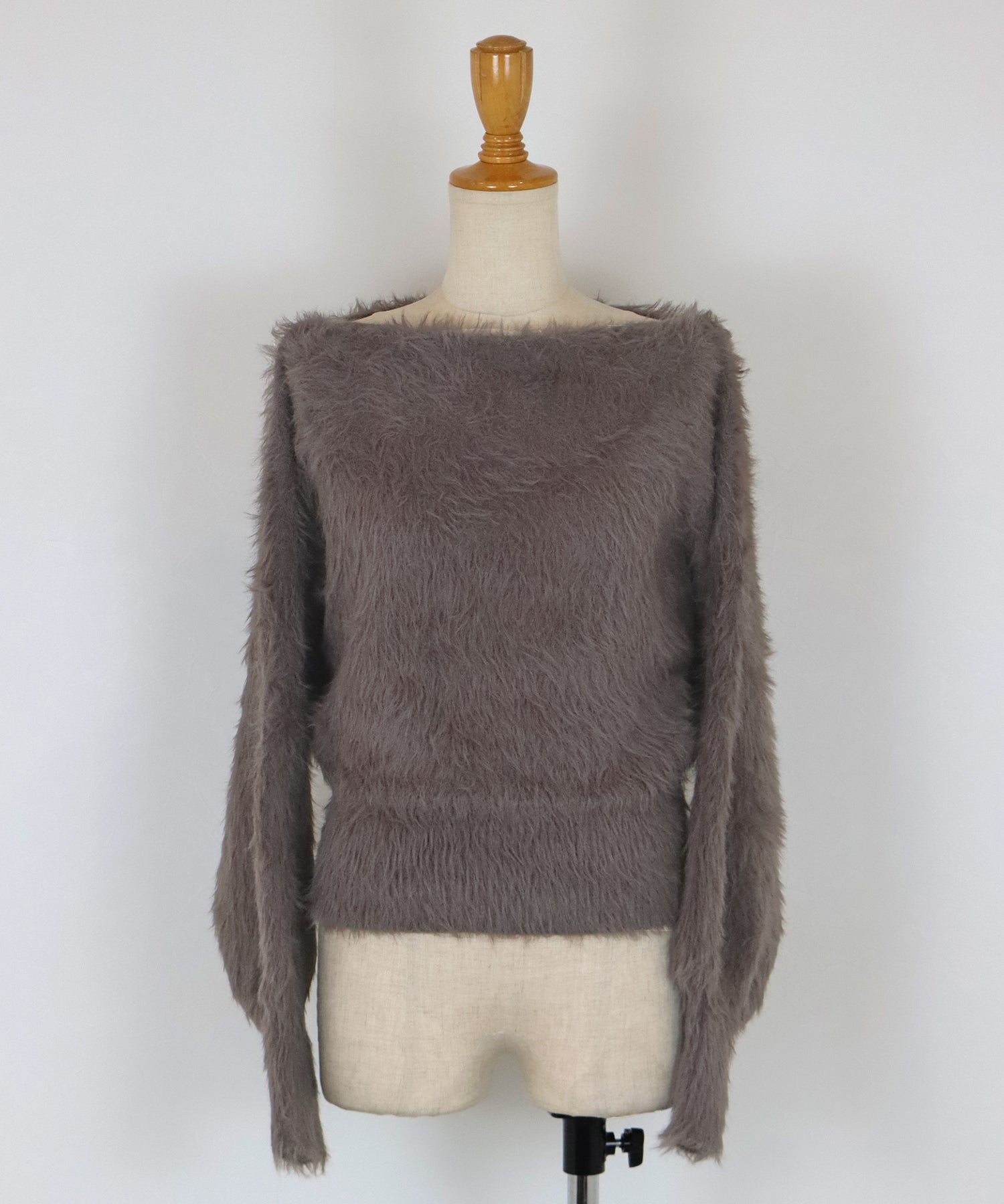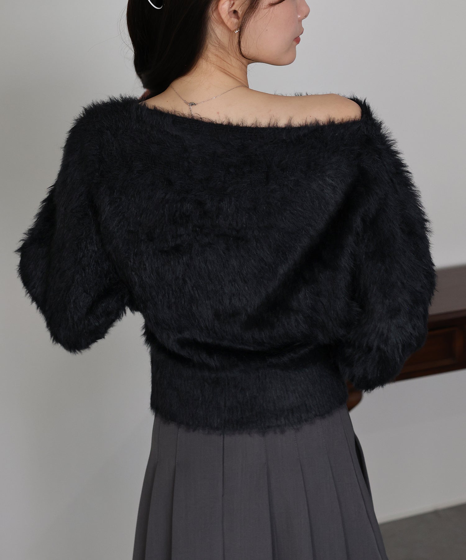 ふんわりとした起毛感が冬らしいオフショルダーシャギーニット。
