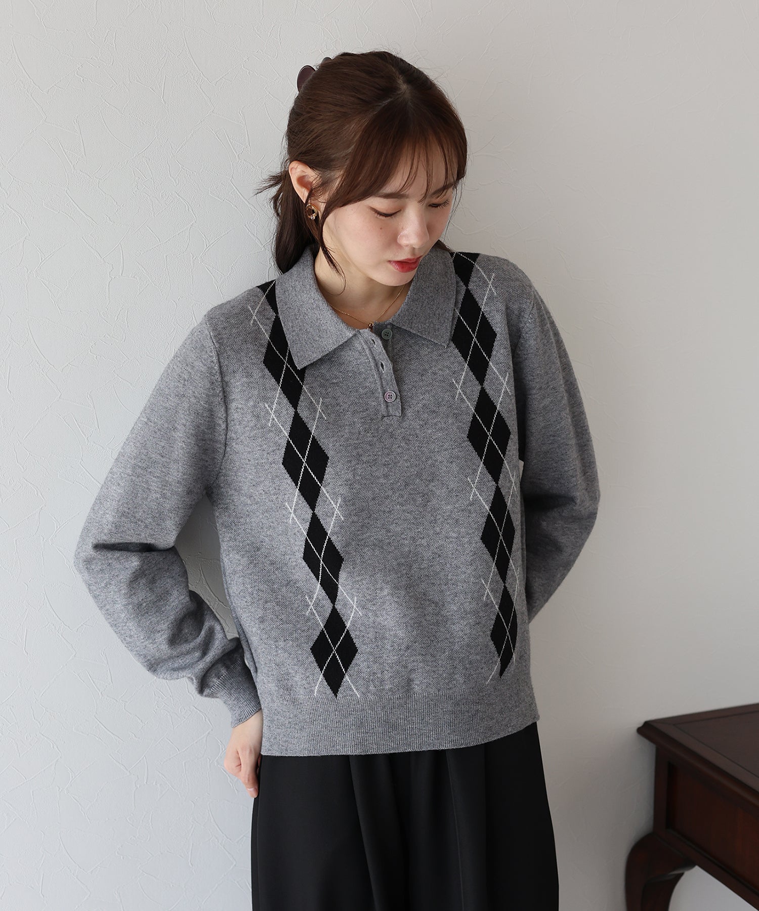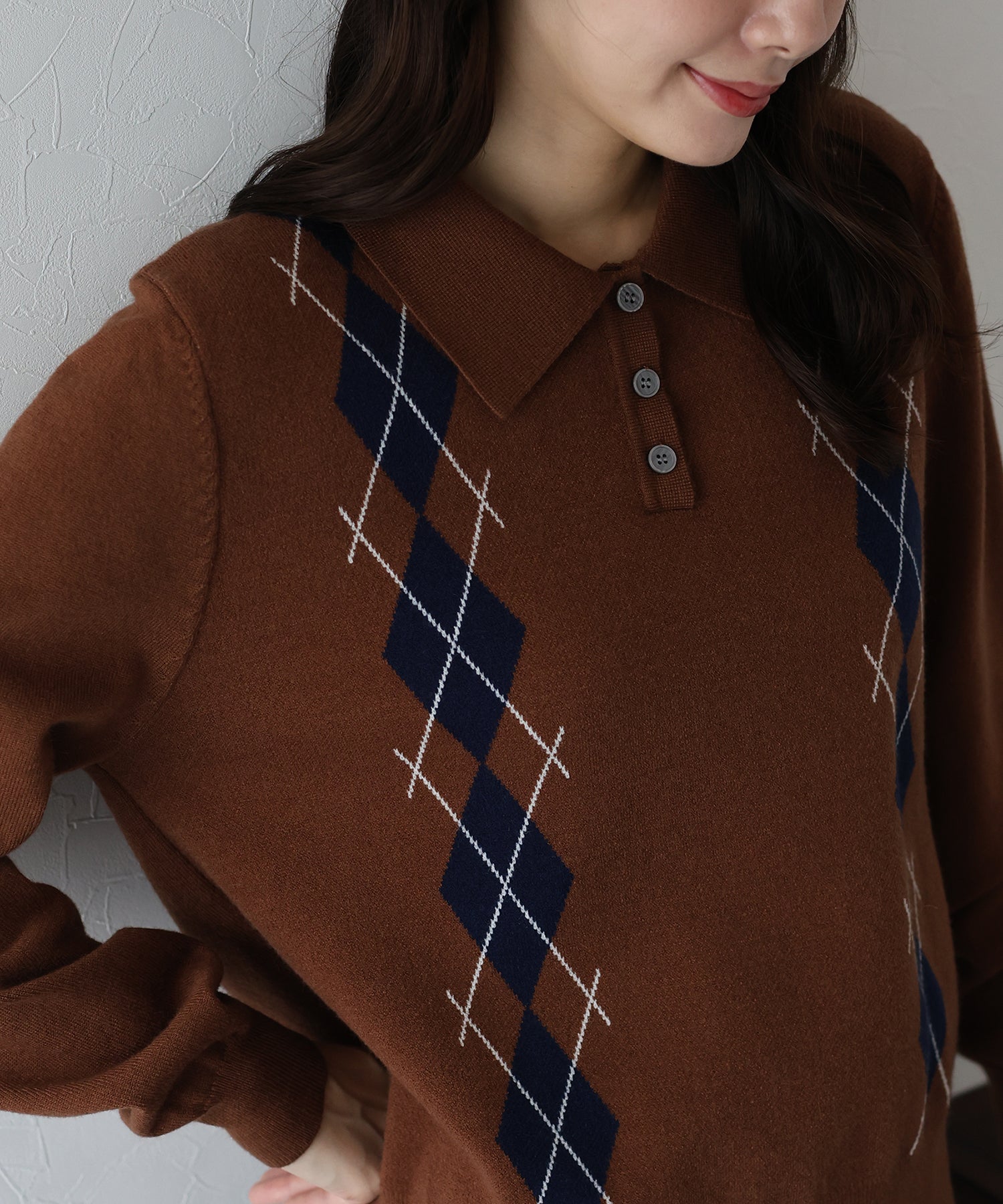 アーガイル柄が秋冬のムードを高めるポロ襟ニット。