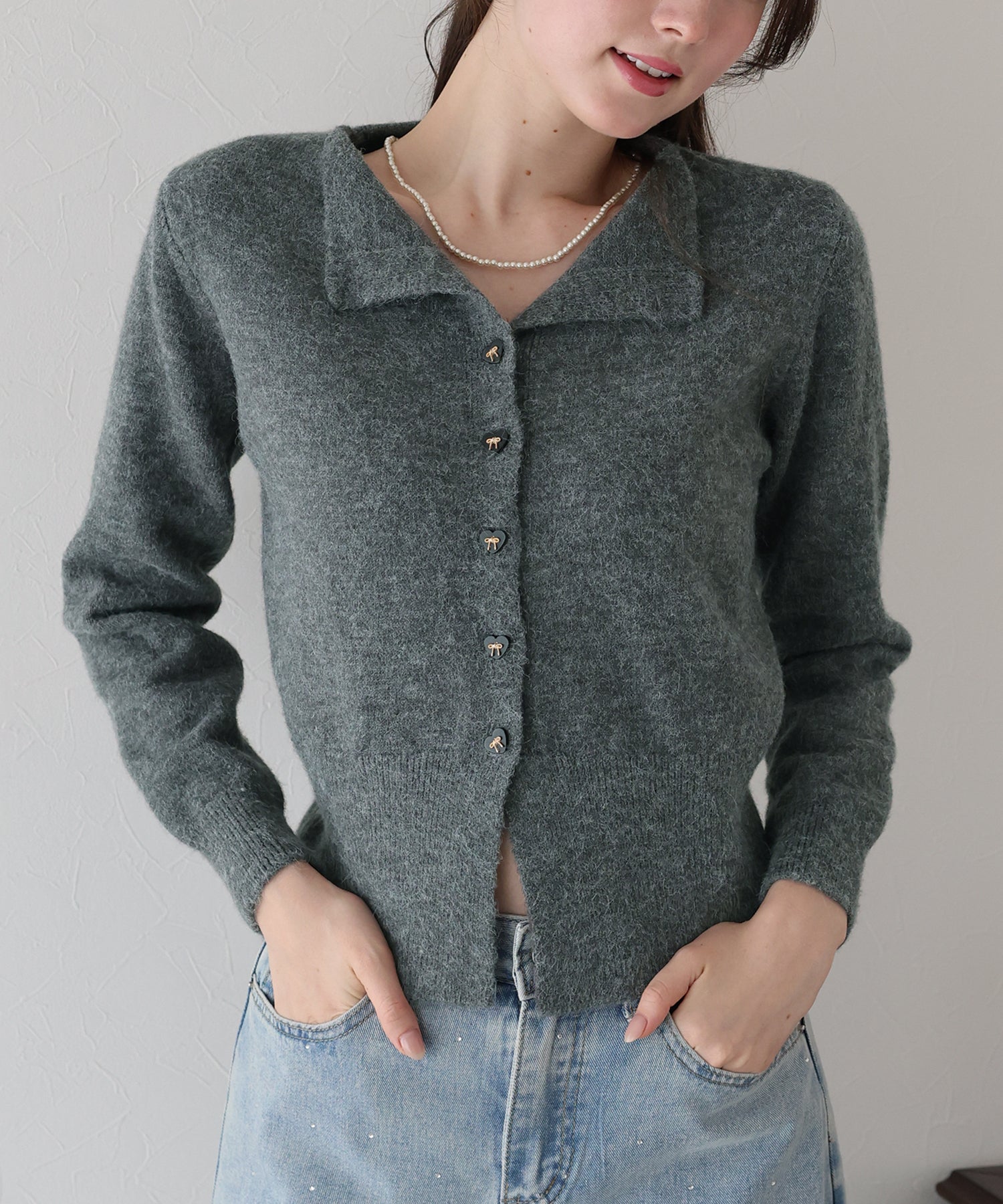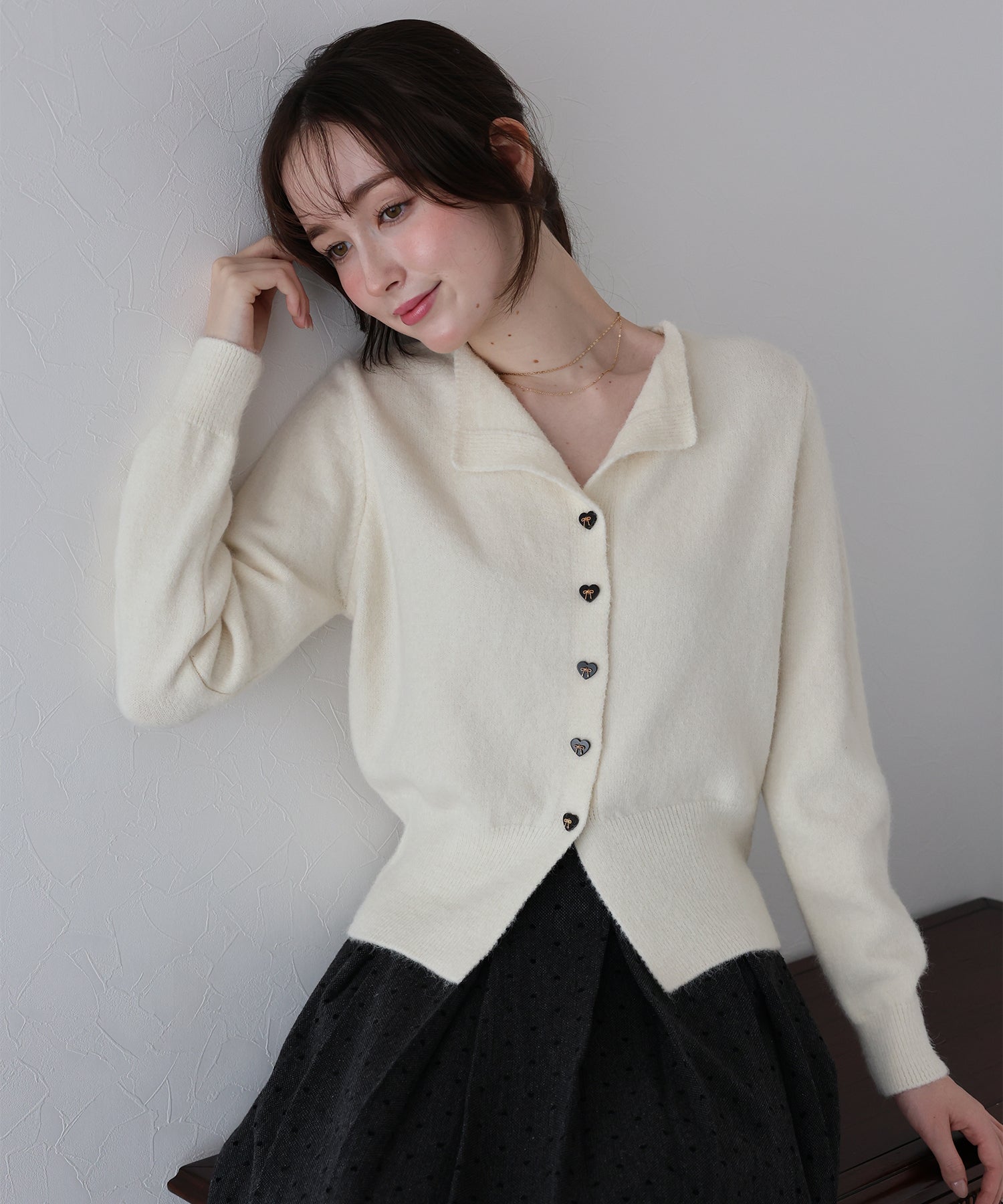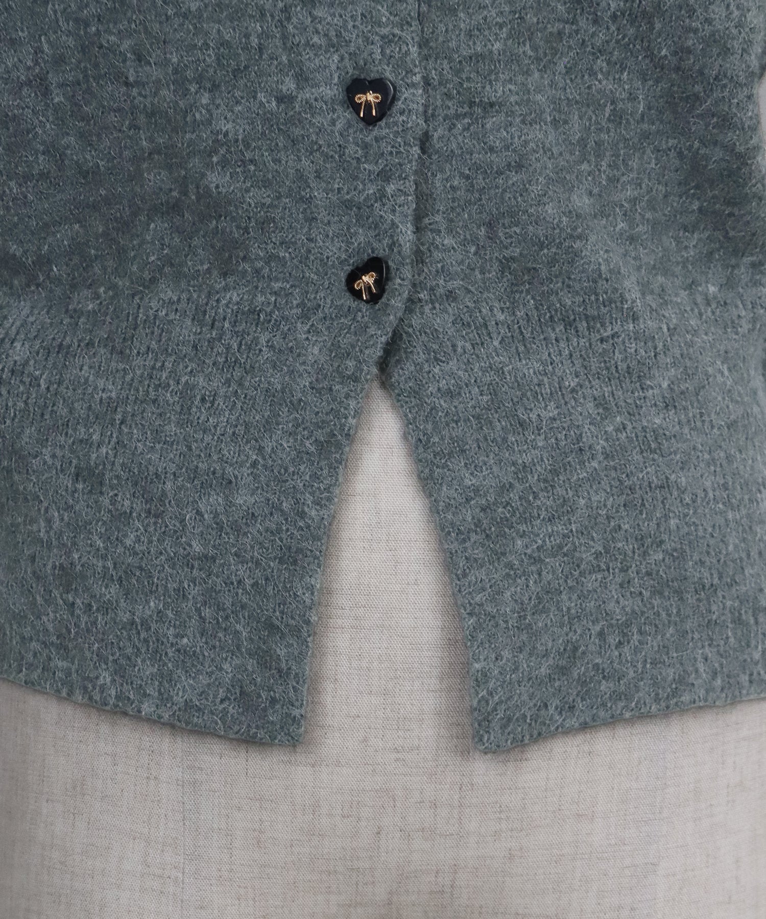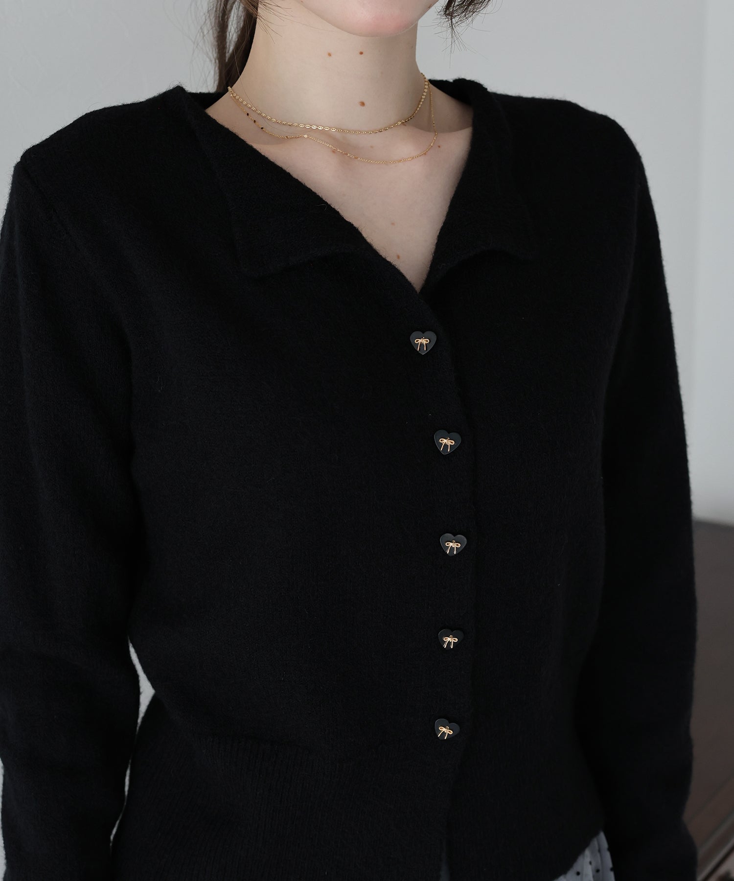 ゴールドのリボン×ハートモチーフのボタンが大人ガーリーな雰囲気を演出するニットカーディガン。