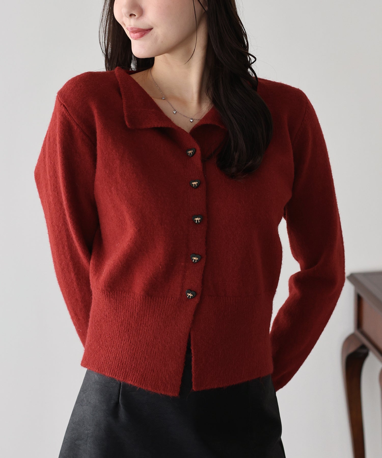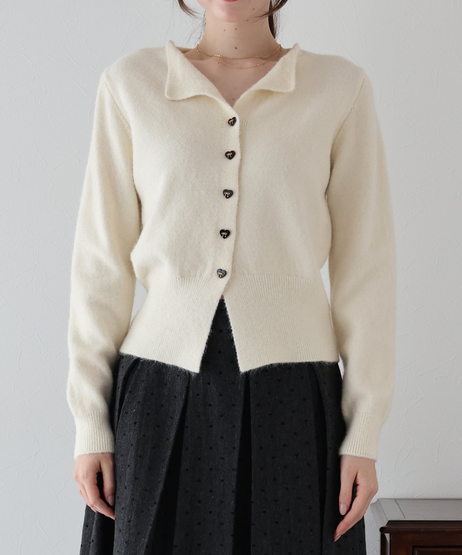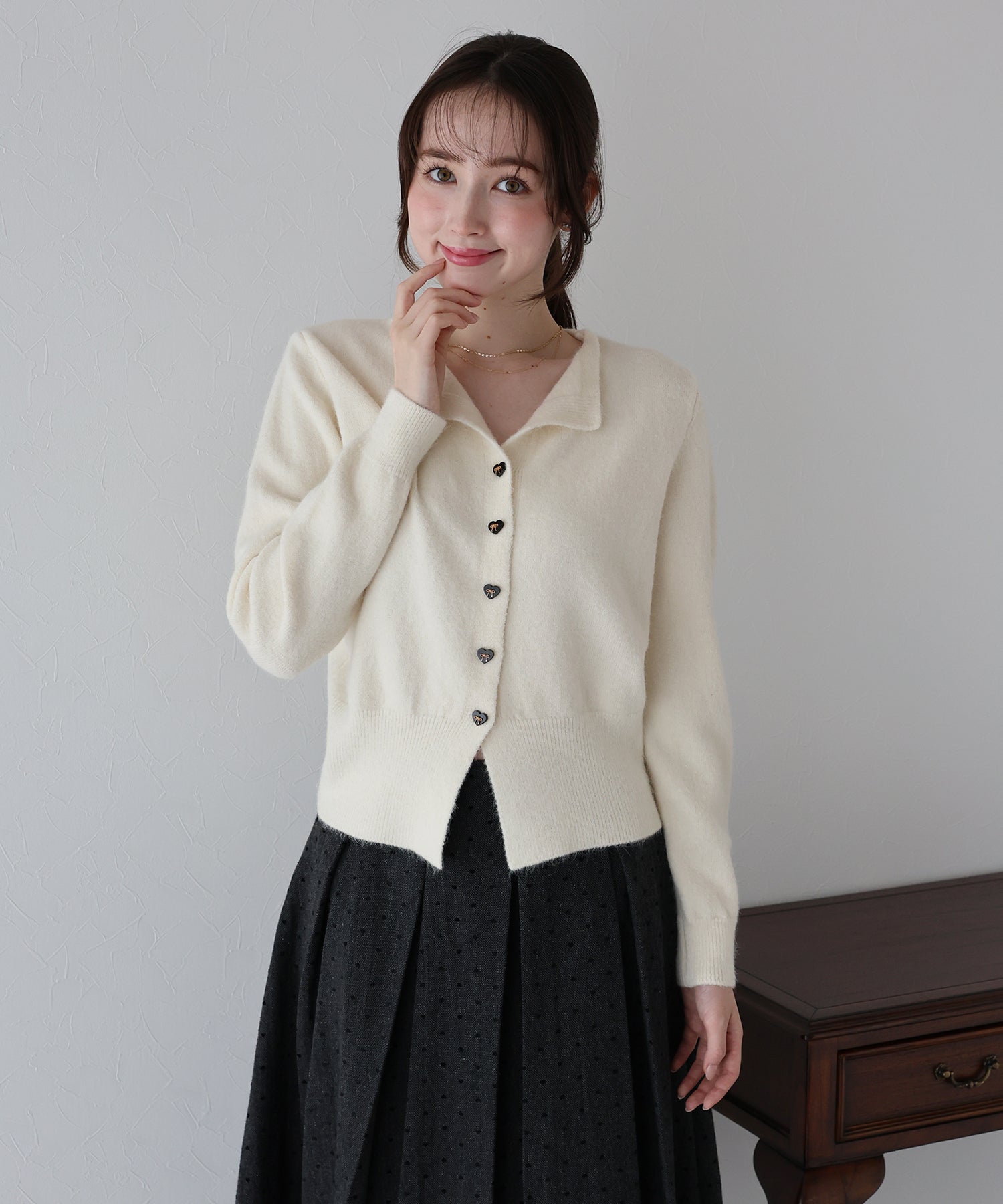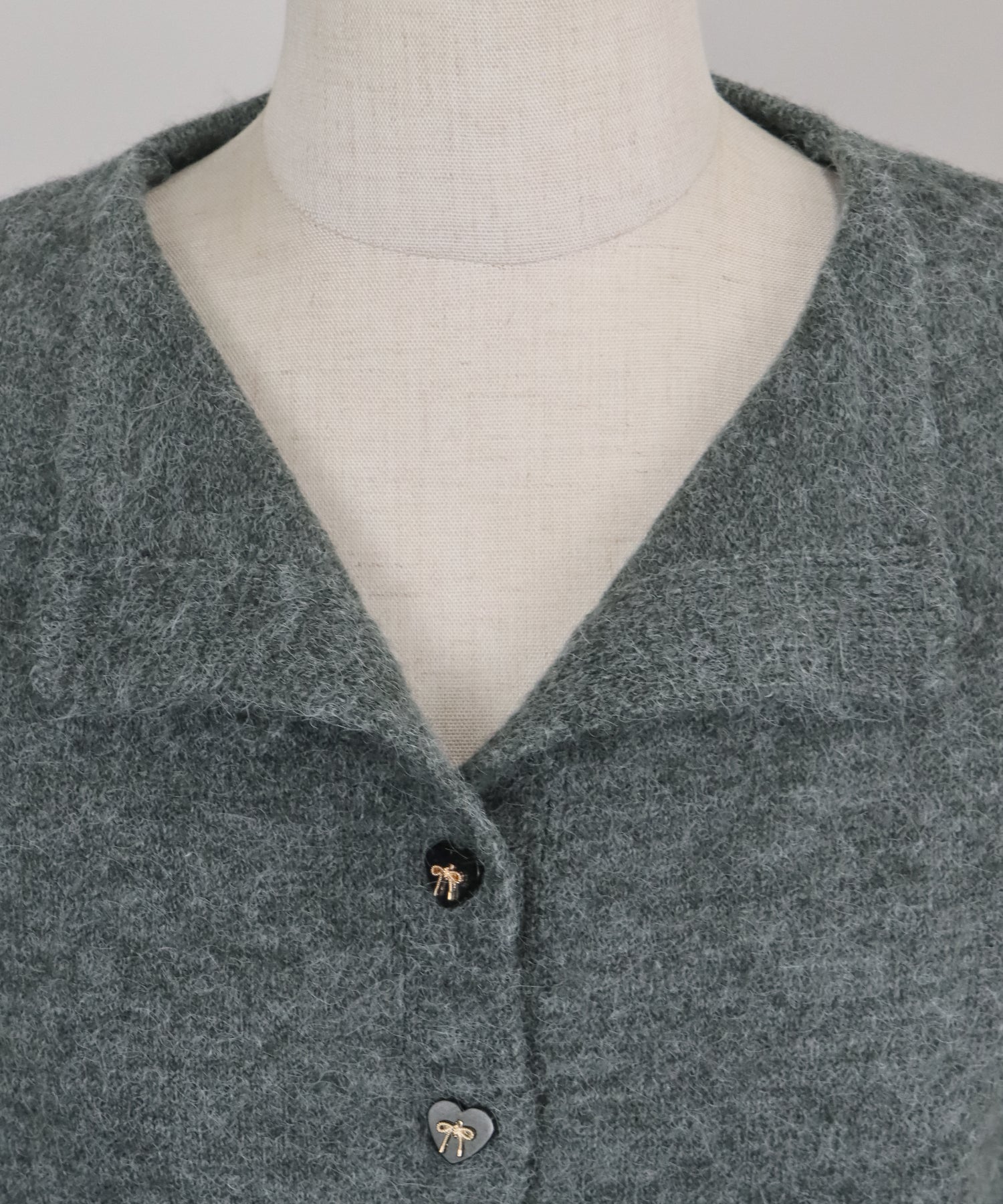 ゴールドのリボン×ハートモチーフのボタンが大人ガーリーな雰囲気を演出するニットカーディガン。