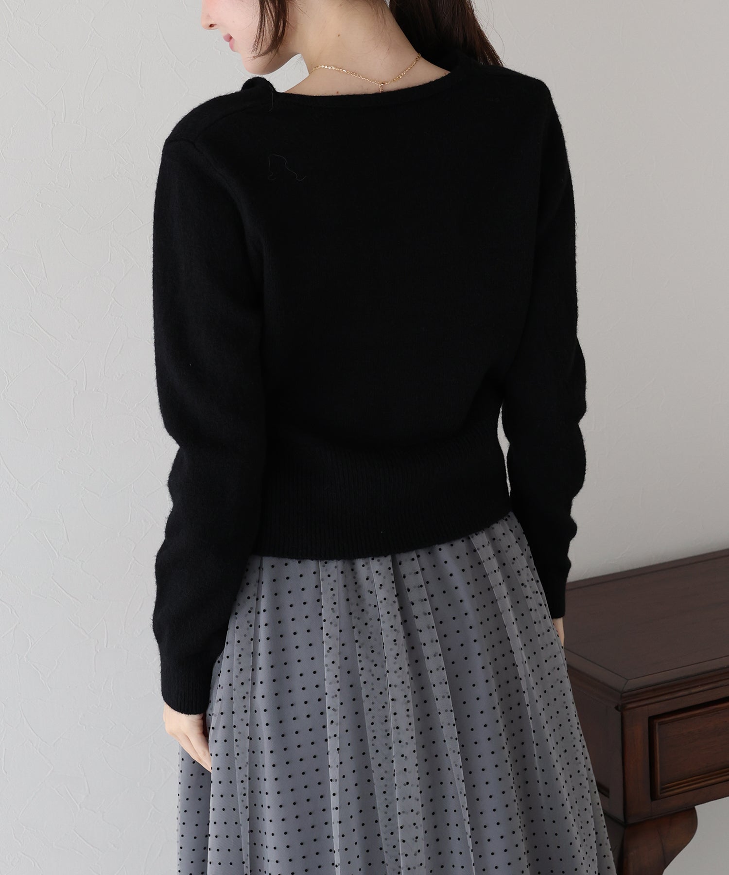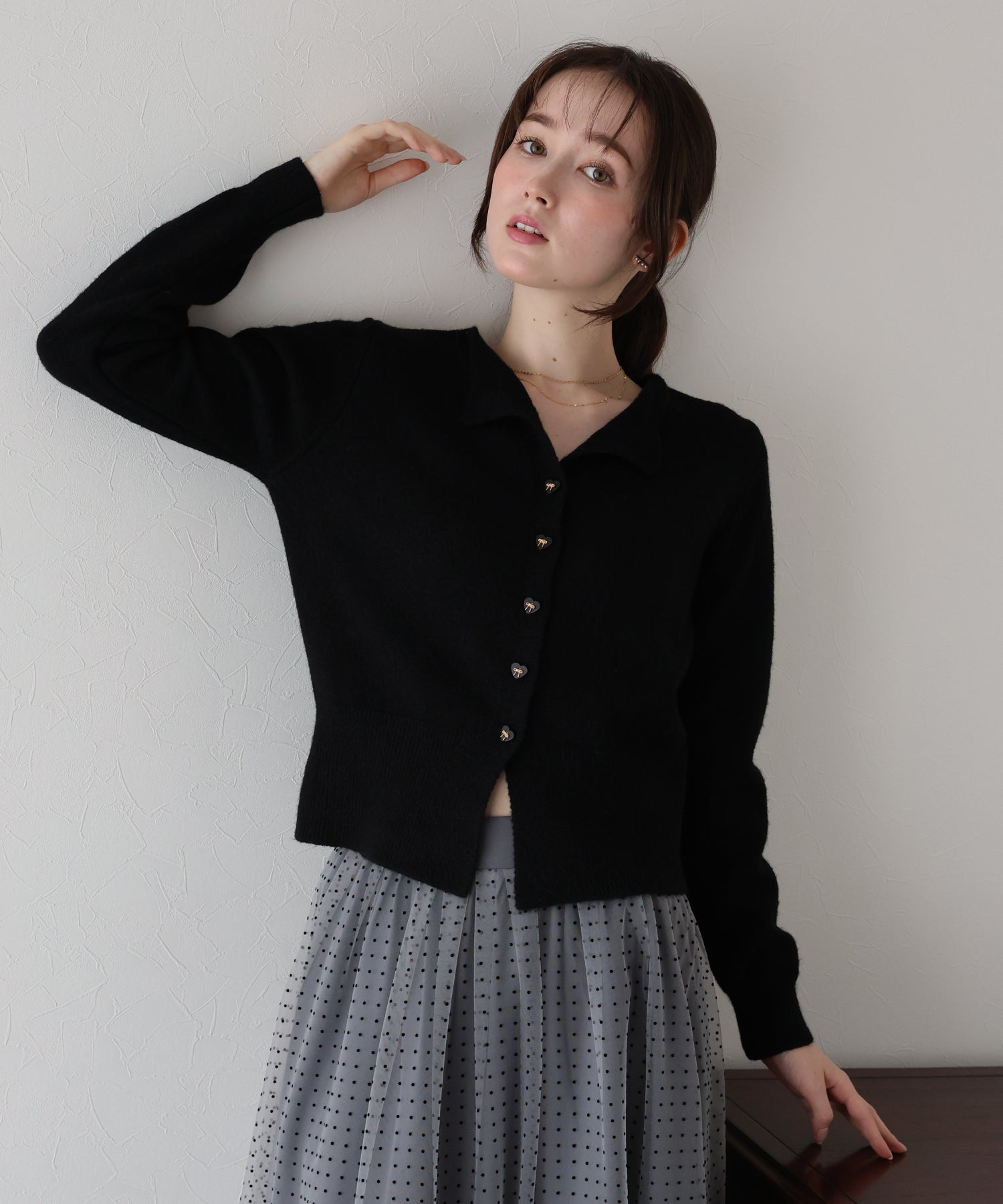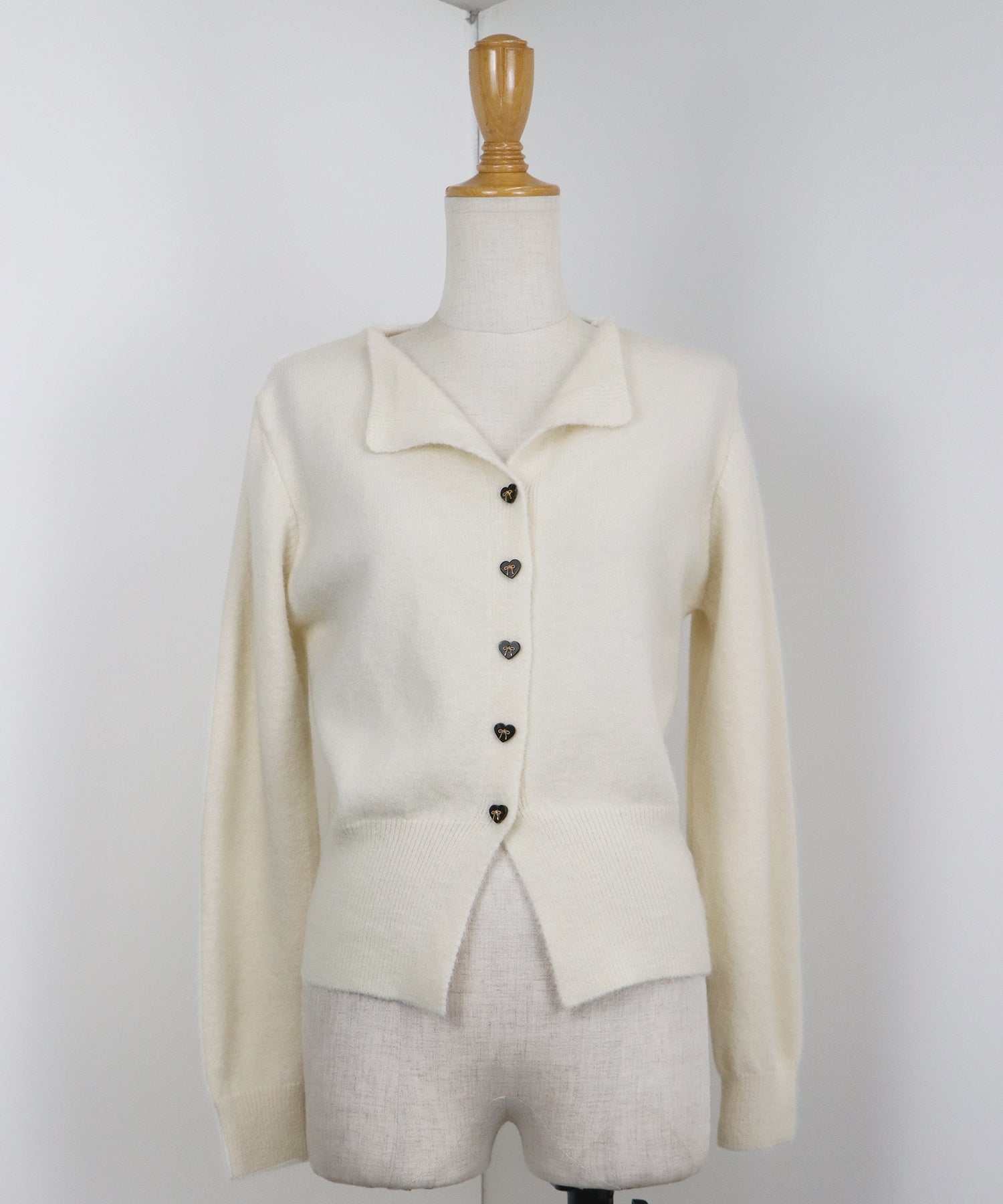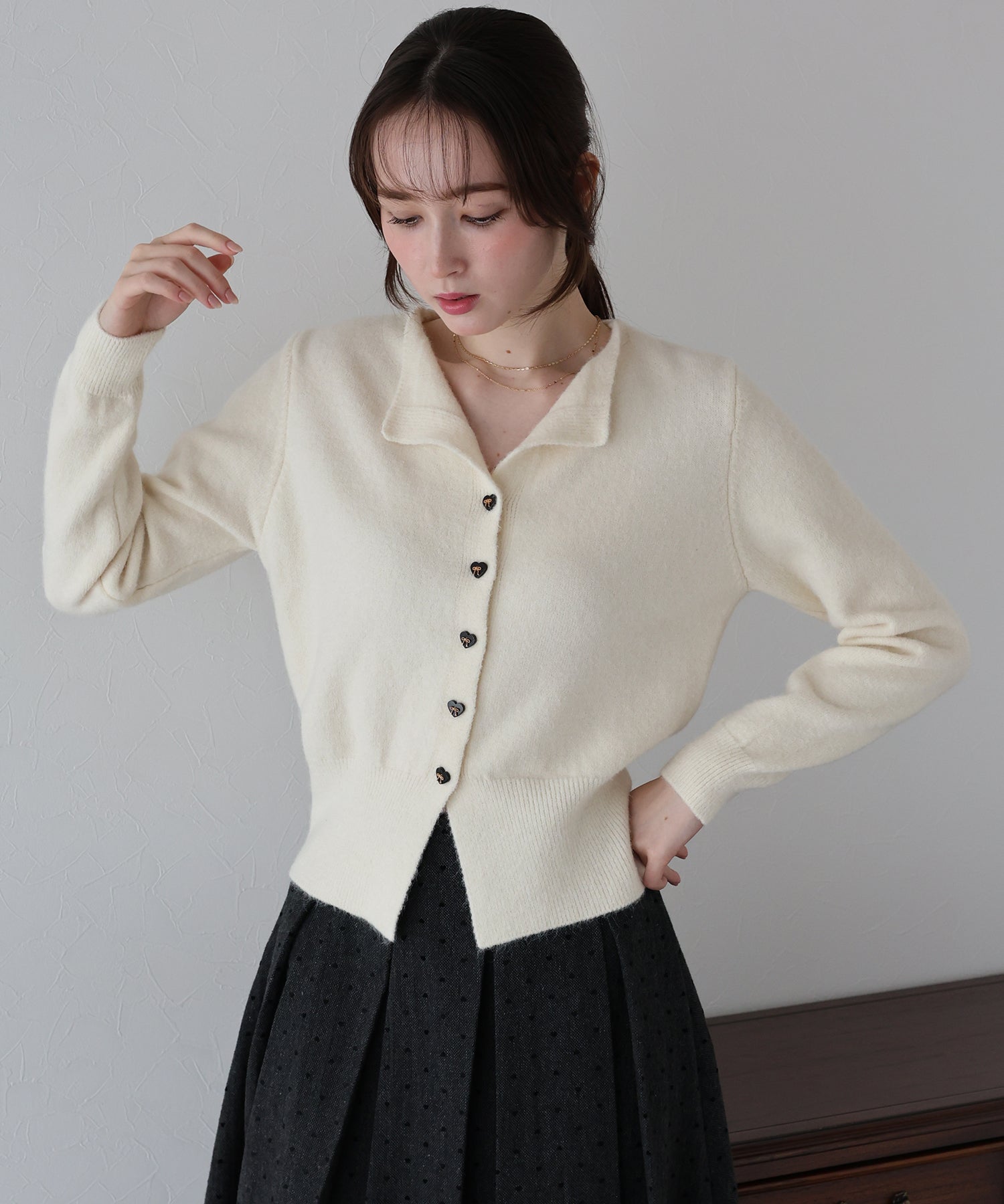 ゴールドのリボン×ハートモチーフのボタンが大人ガーリーな雰囲気を演出するニットカーディガン。