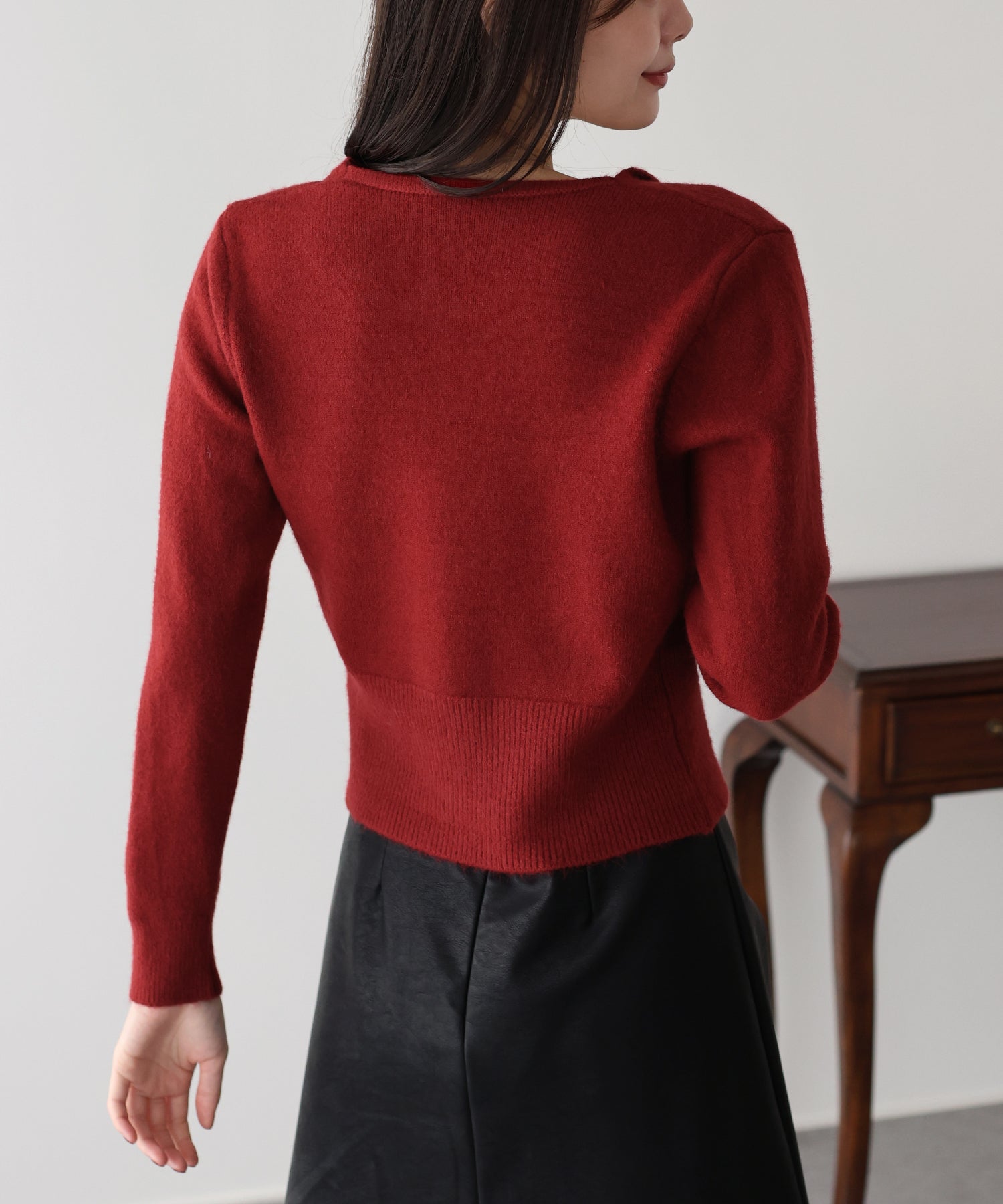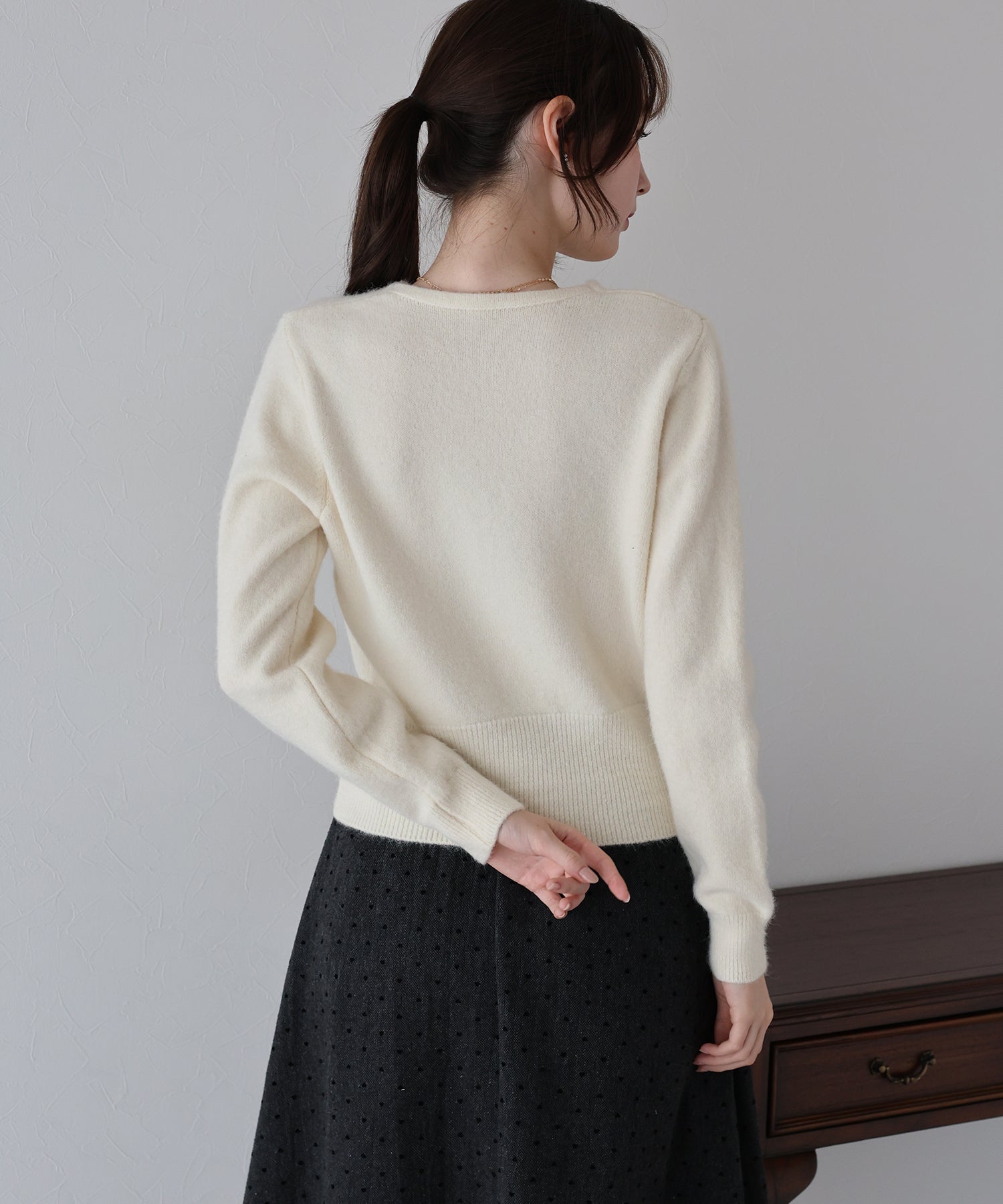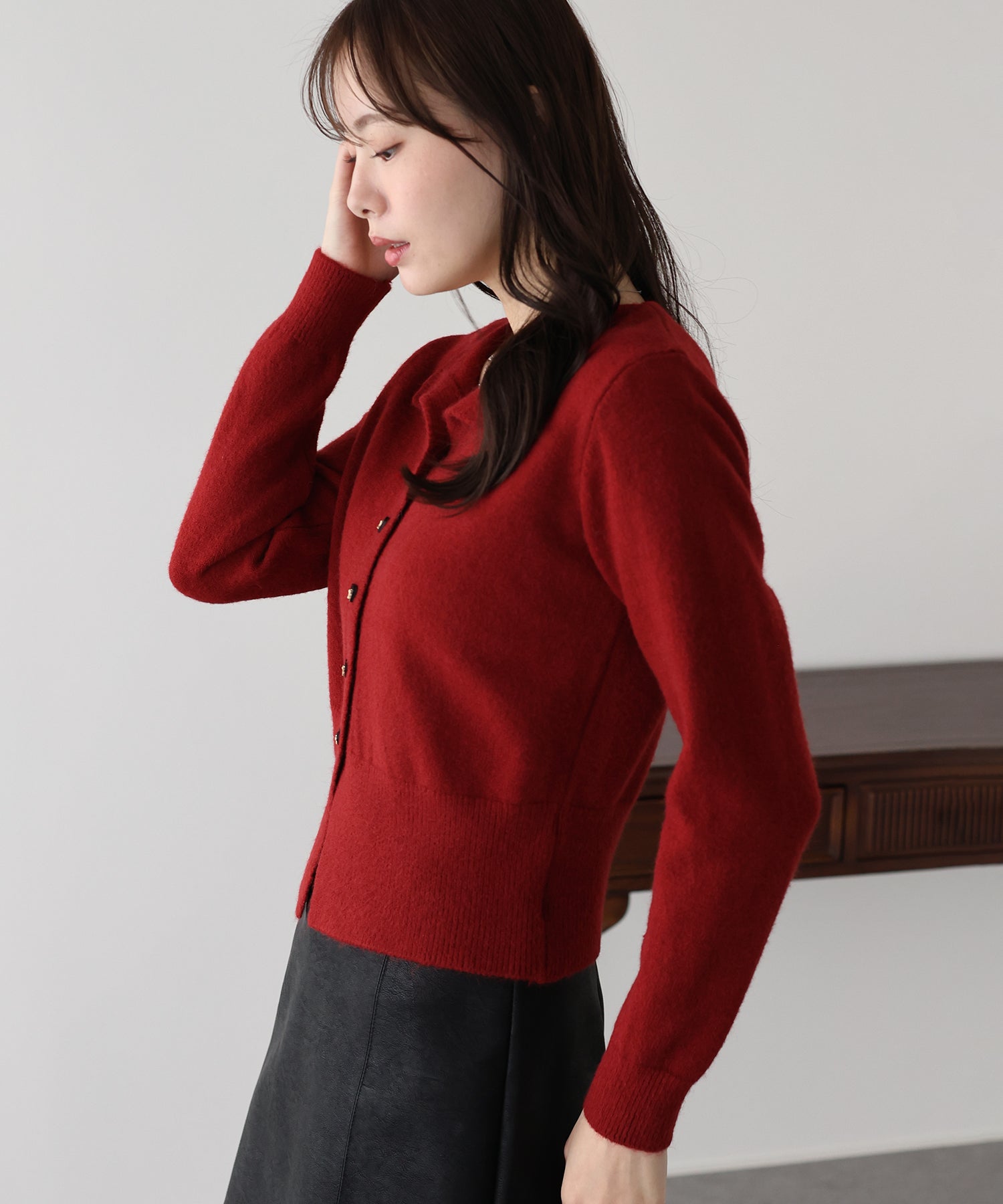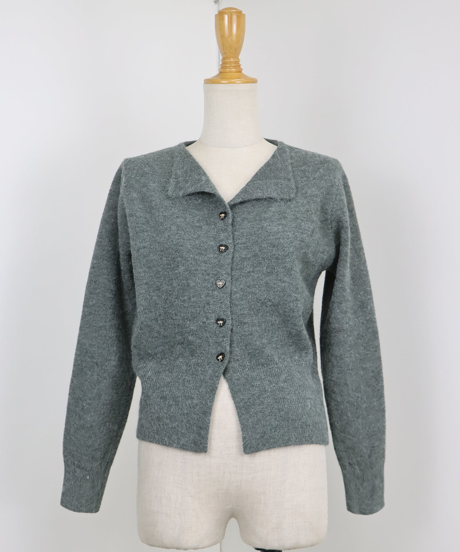 ゴールドのリボン×ハートモチーフのボタンが大人ガーリーな雰囲気を演出するニットカーディガン。