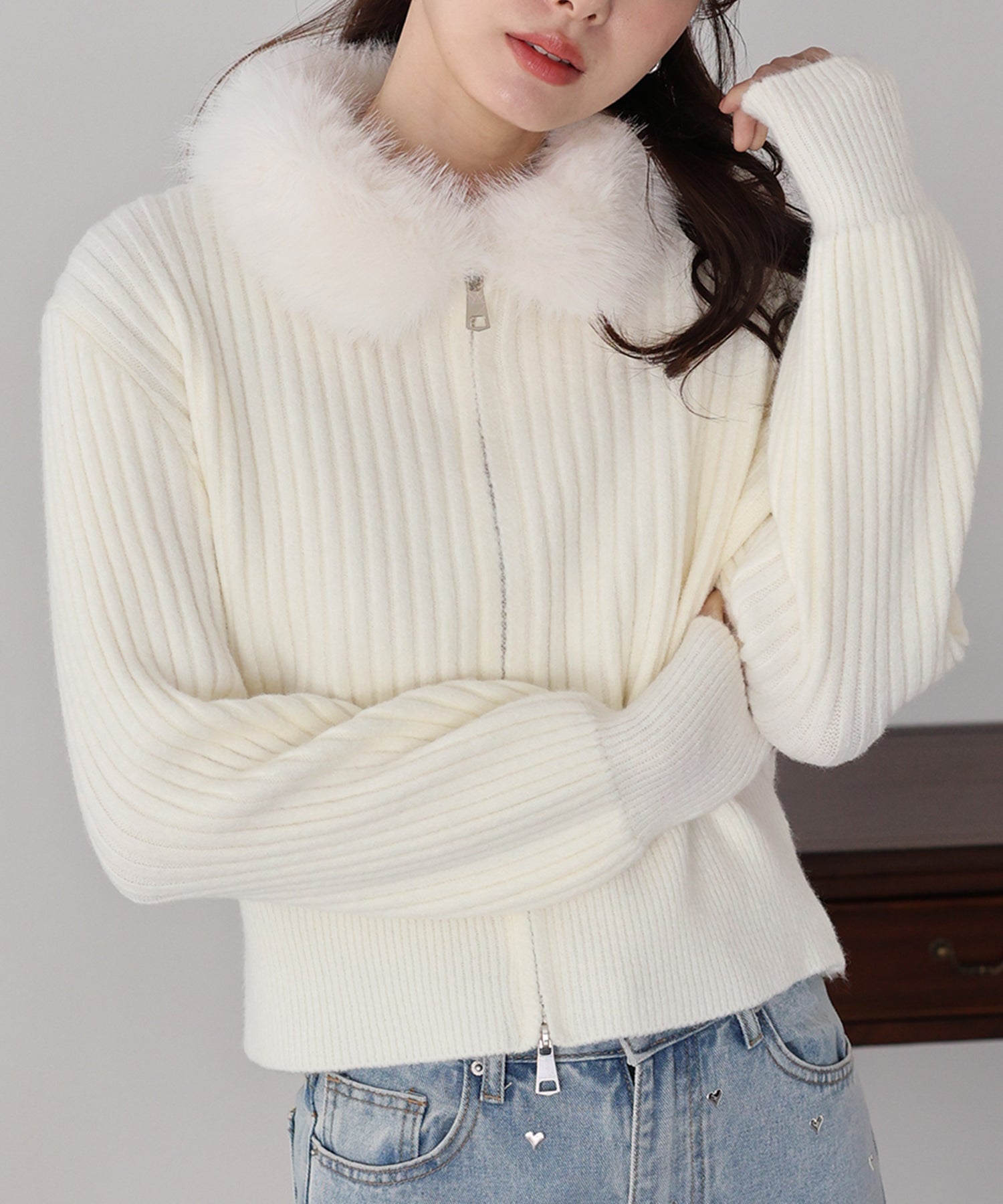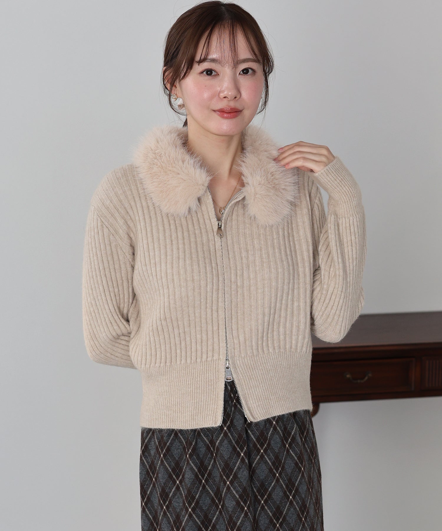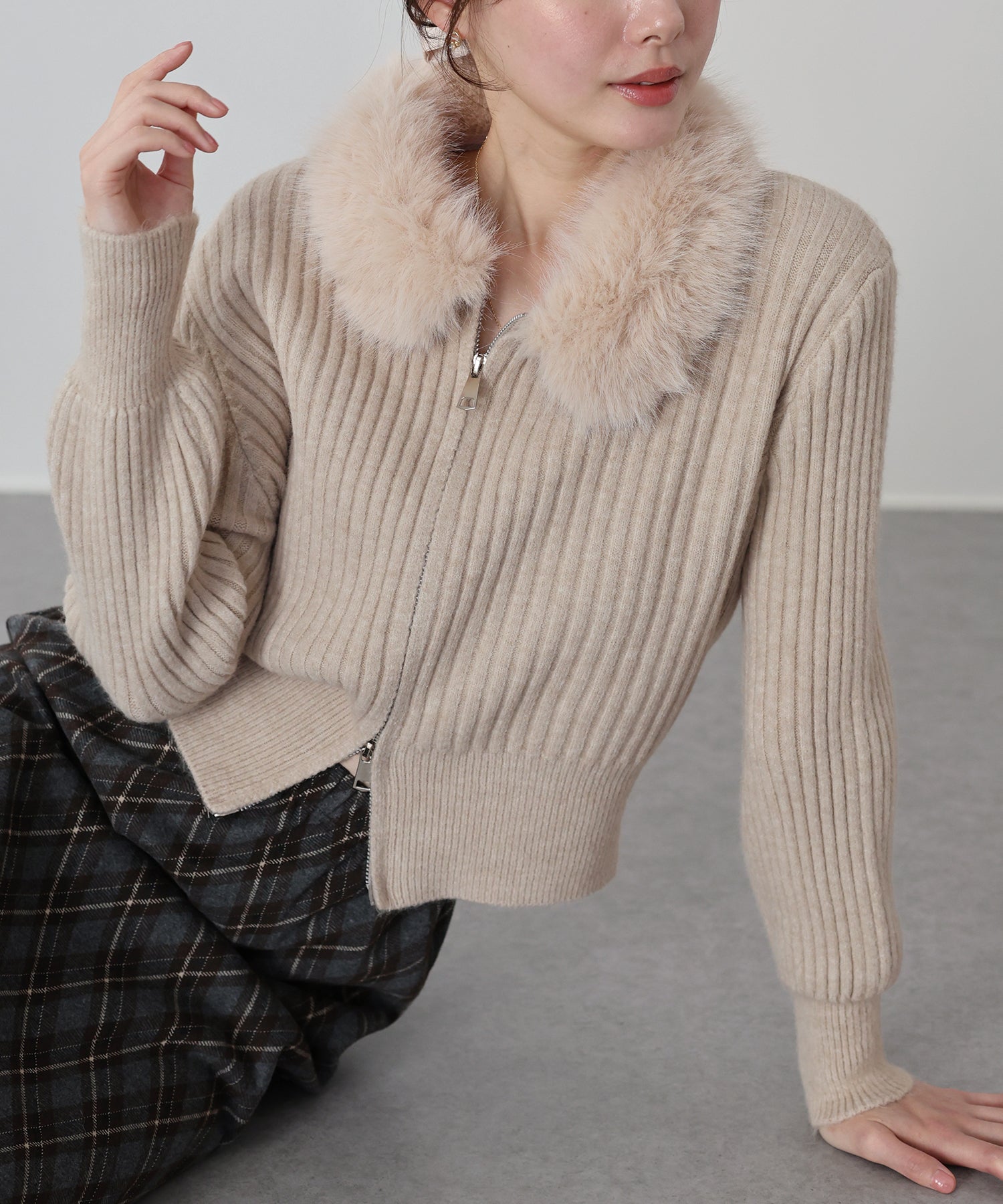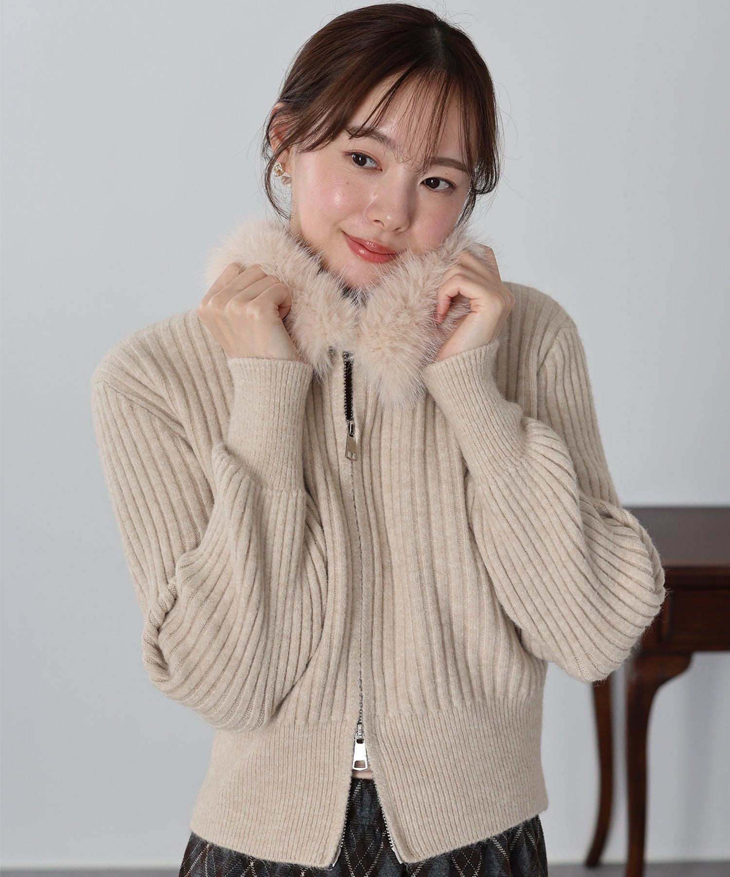 ボリューミーなファー襟が小顔見えを叶えるダブルジップニットカーディガン