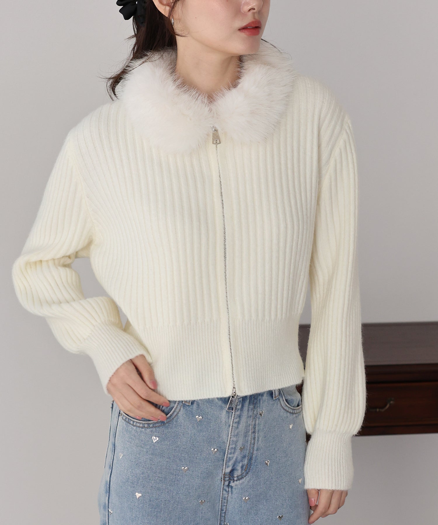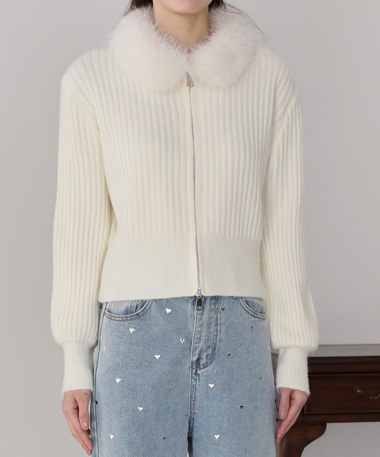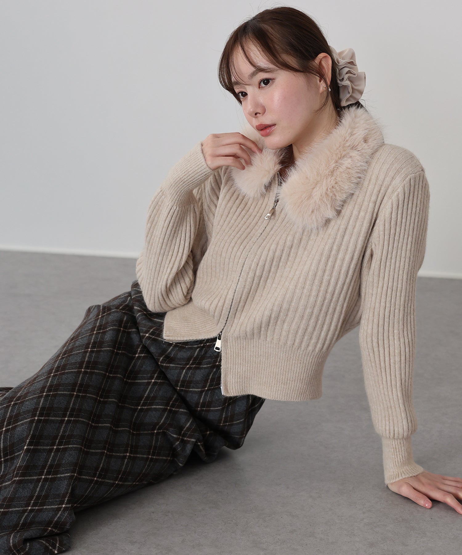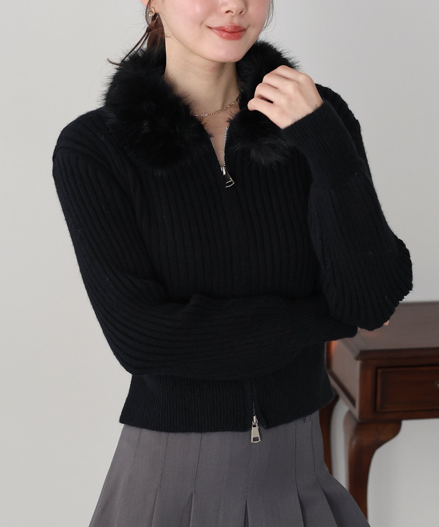 ボリューミーなファー襟が小顔見えを叶えるダブルジップニットカーディガン