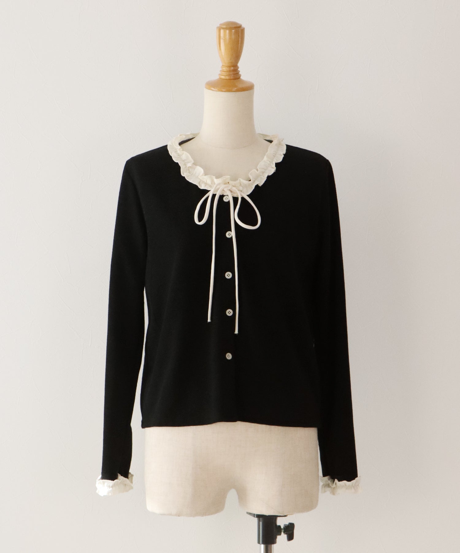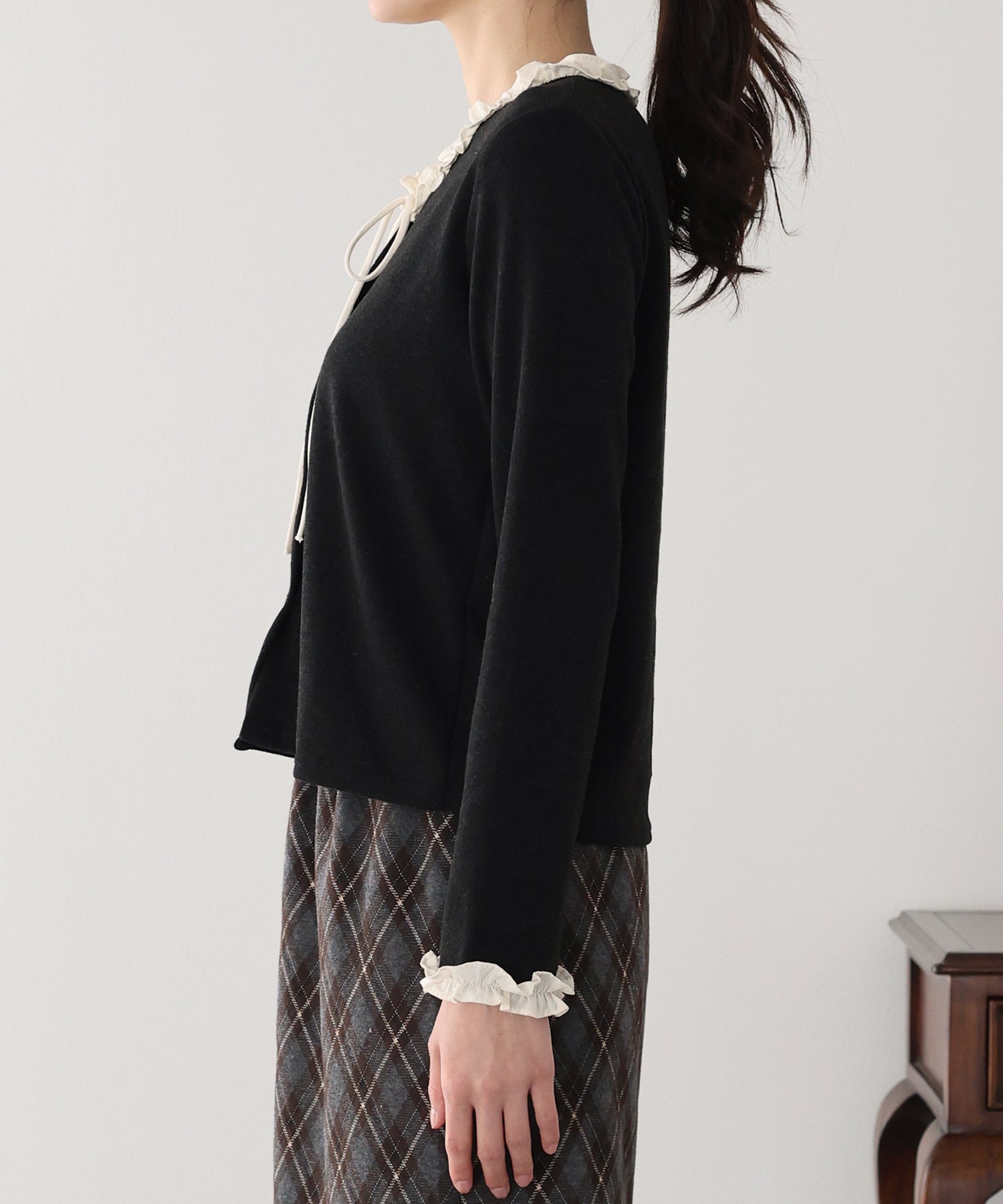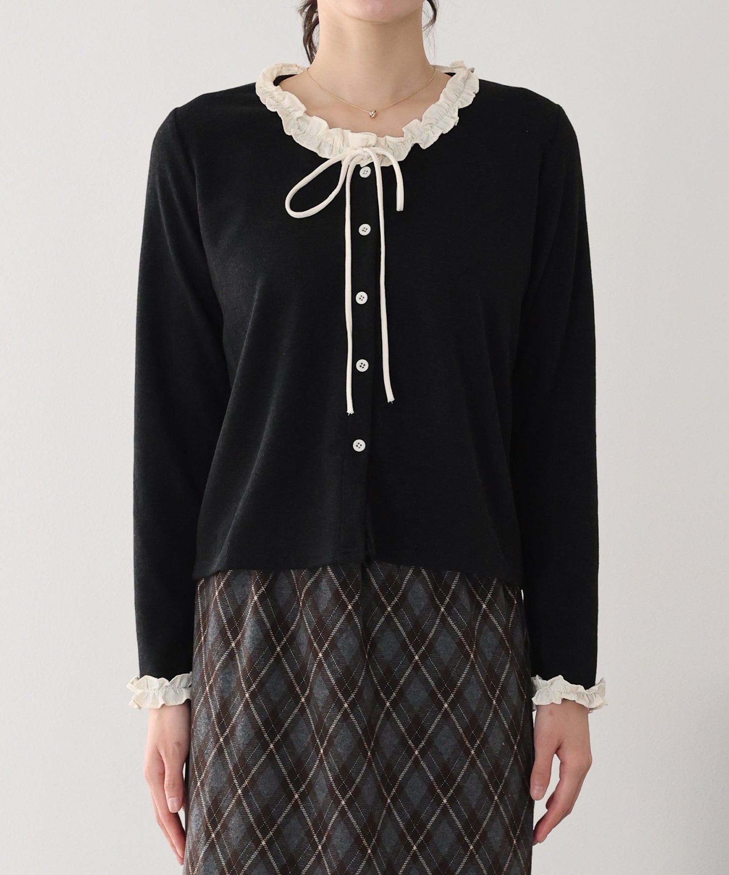 程よい甘さのフリルを施したフェミニンな雰囲気のニットカーディガン