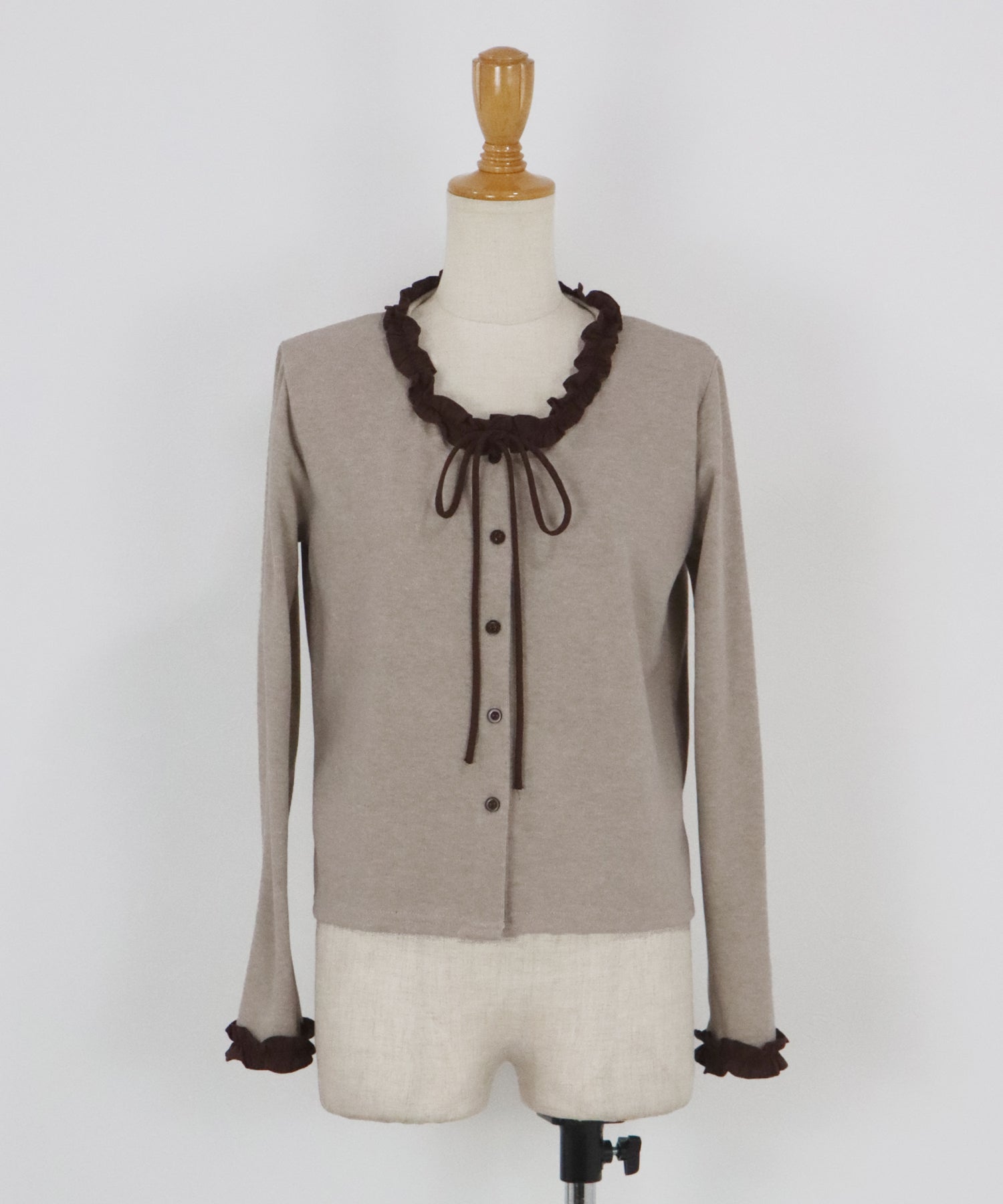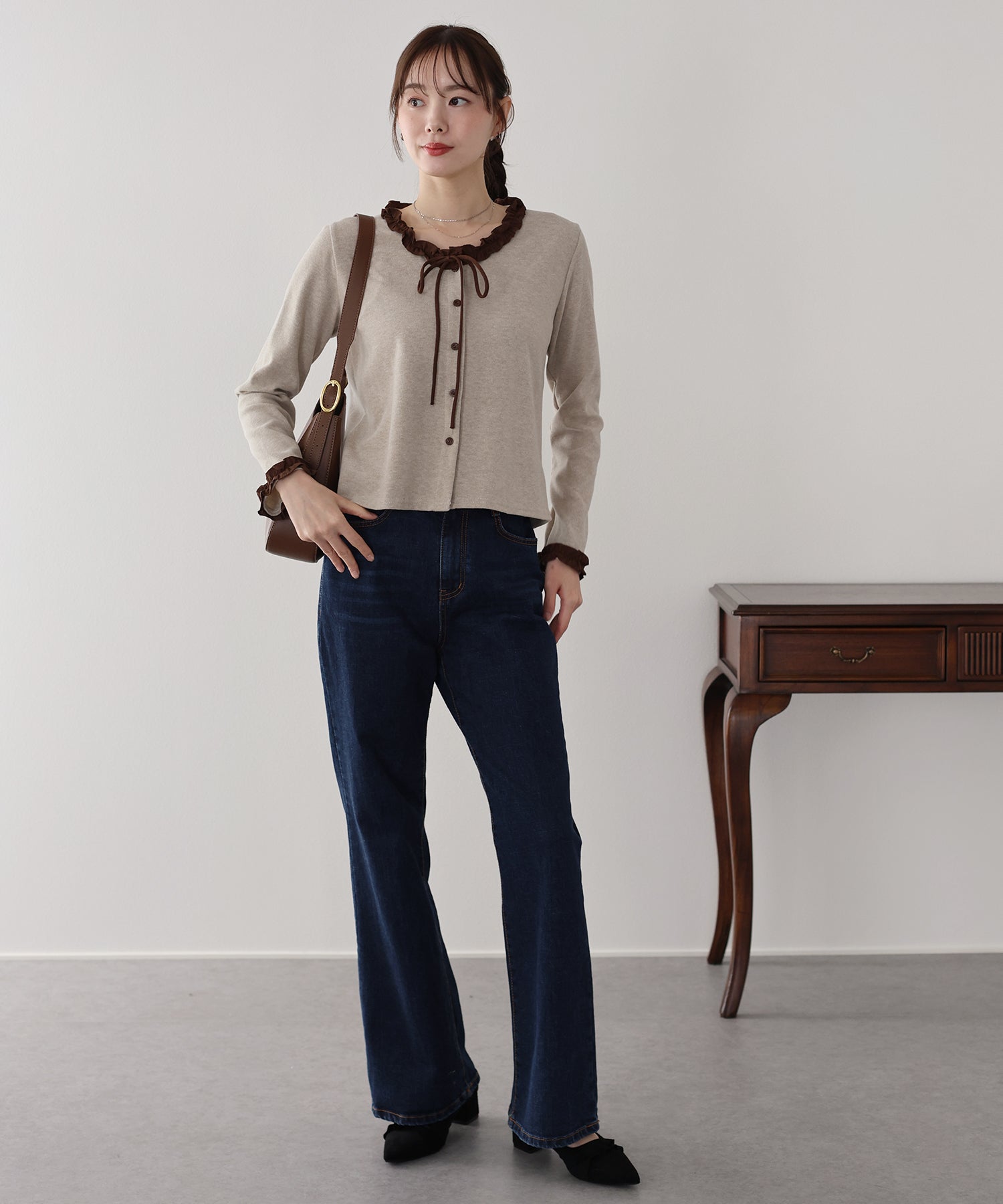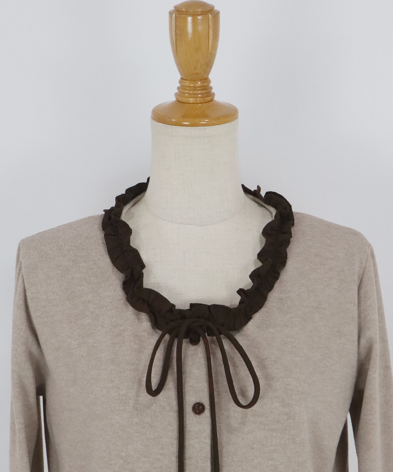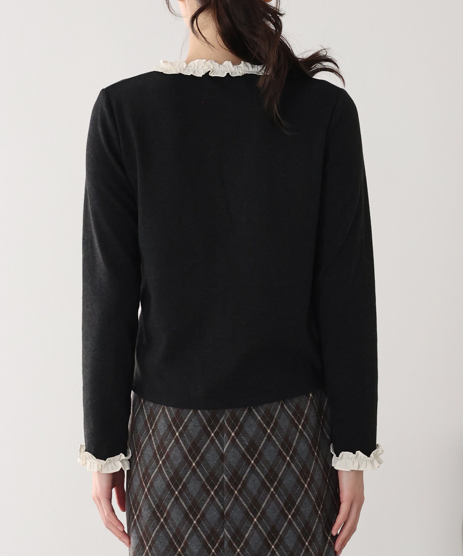 程よい甘さのフリルを施したフェミニンな雰囲気のニットカーディガン