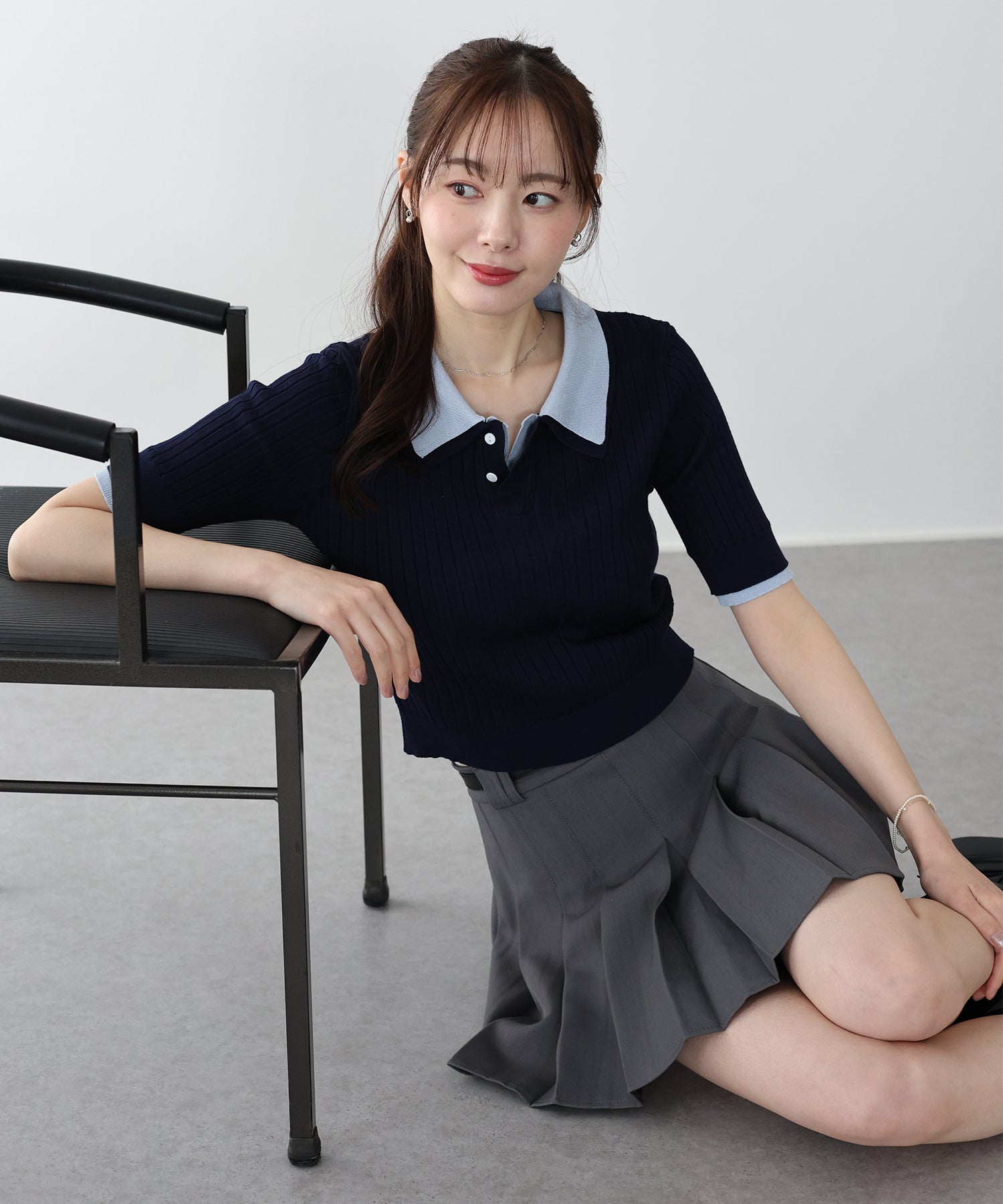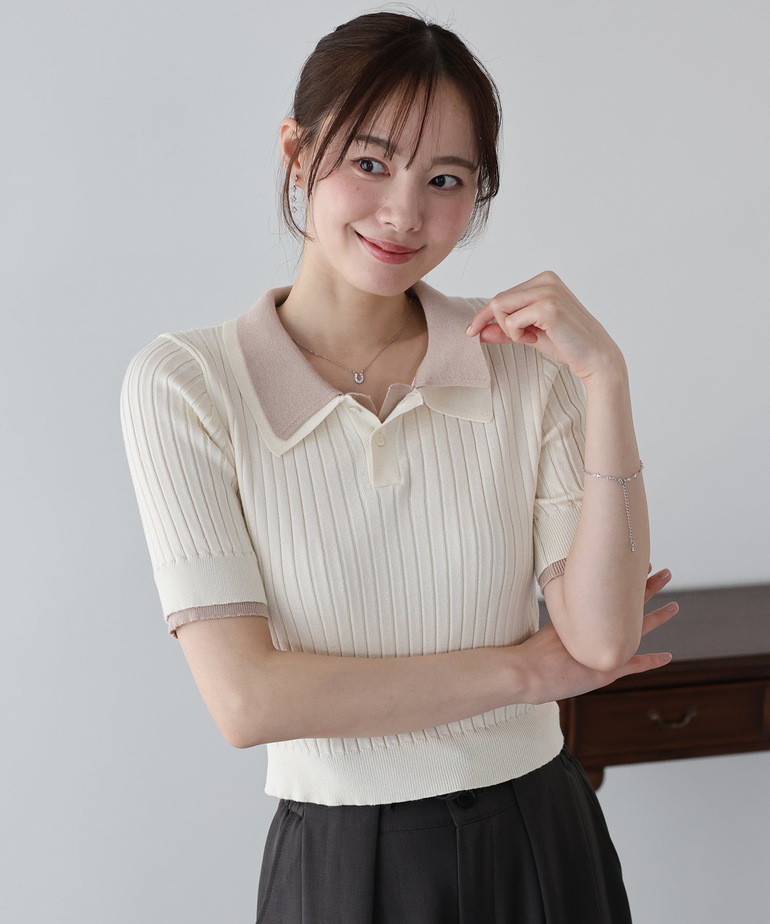 襟付きのポロデザインできちんと感を演出し、ボタンを開けるとカジュアルな抜け感がプラス◎