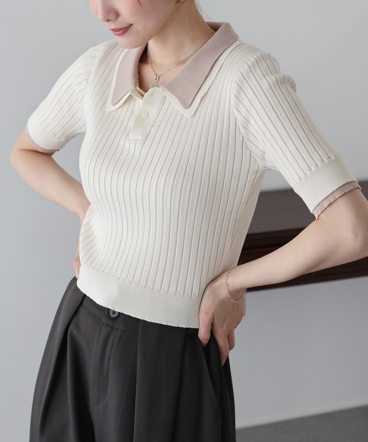 配色のレイヤード襟デザインがトレンドライクな半袖ポロニット