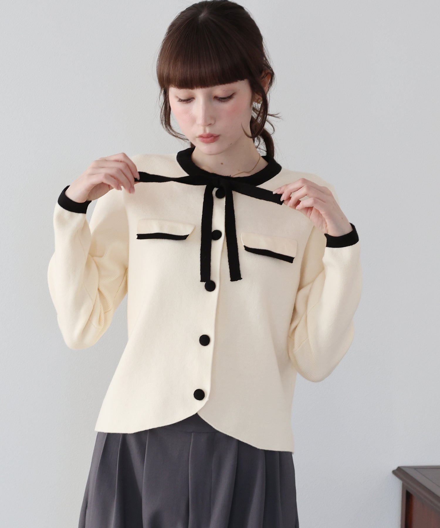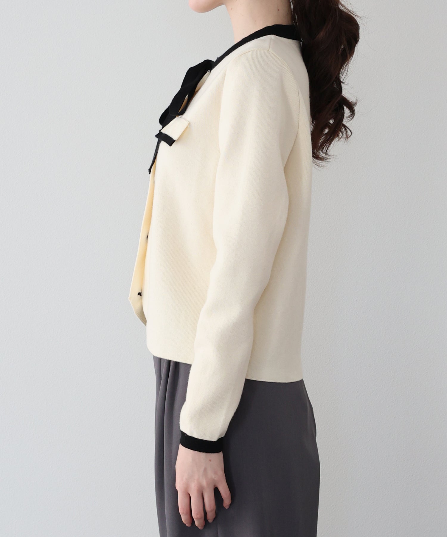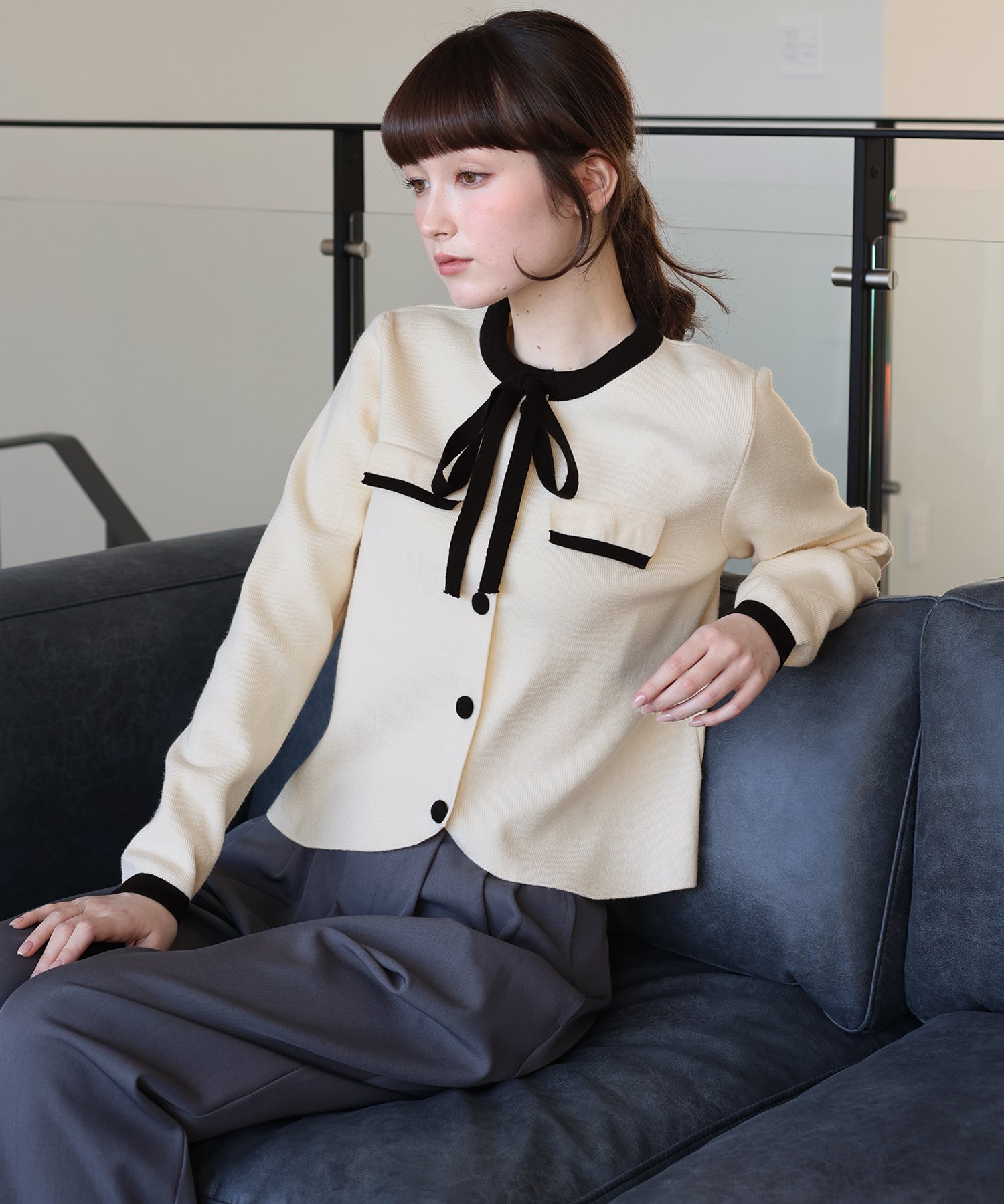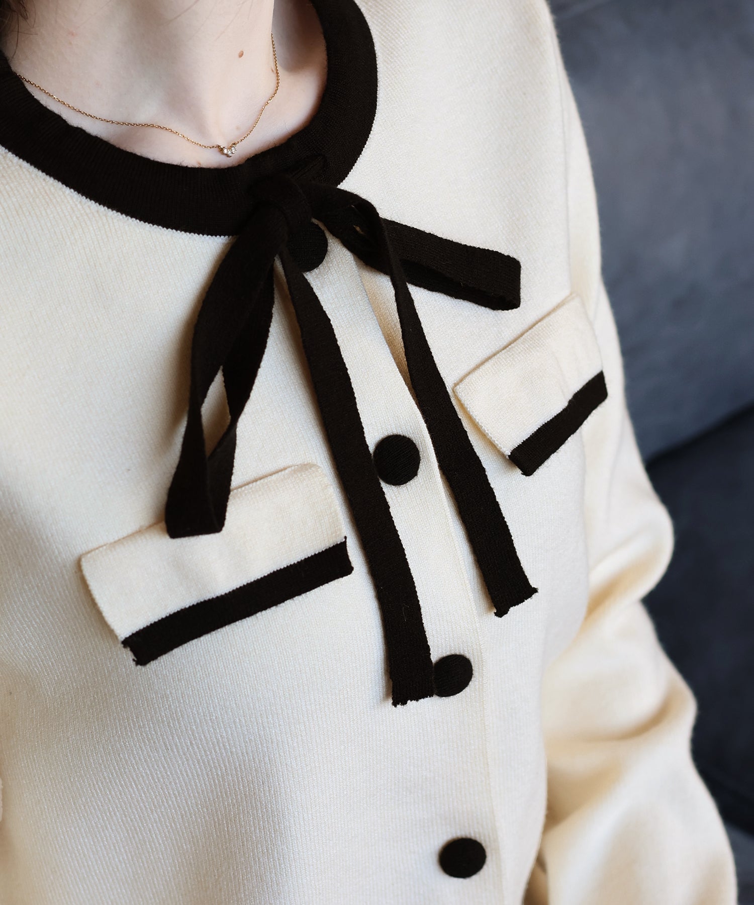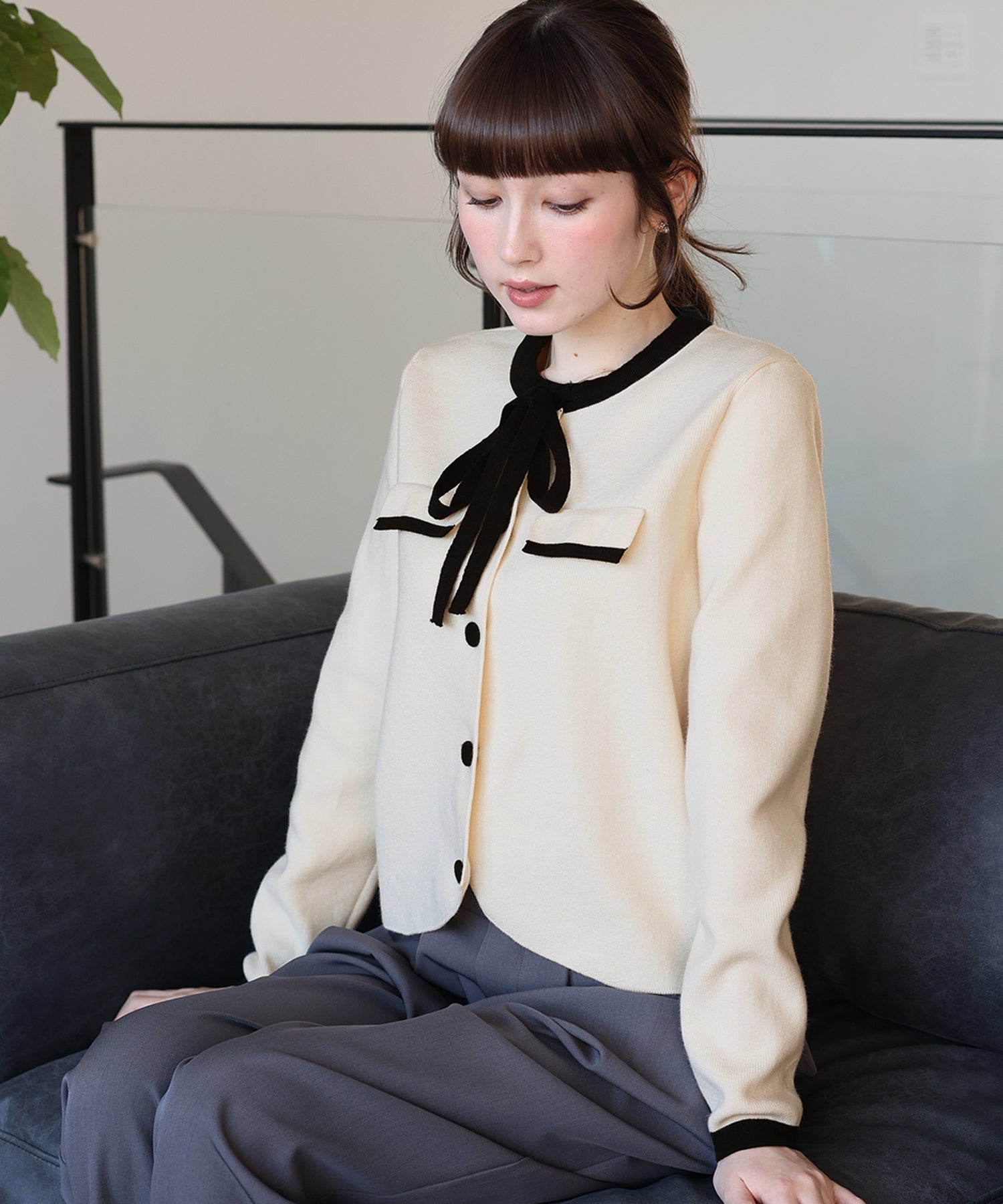 バイカラーのリボンとラインがクラシカルなアクセントを添える、トレンド感のあるリボンニットカーディガン。
