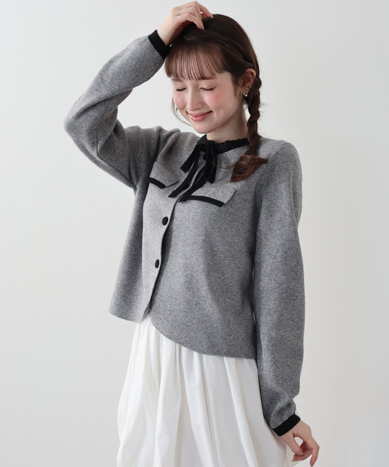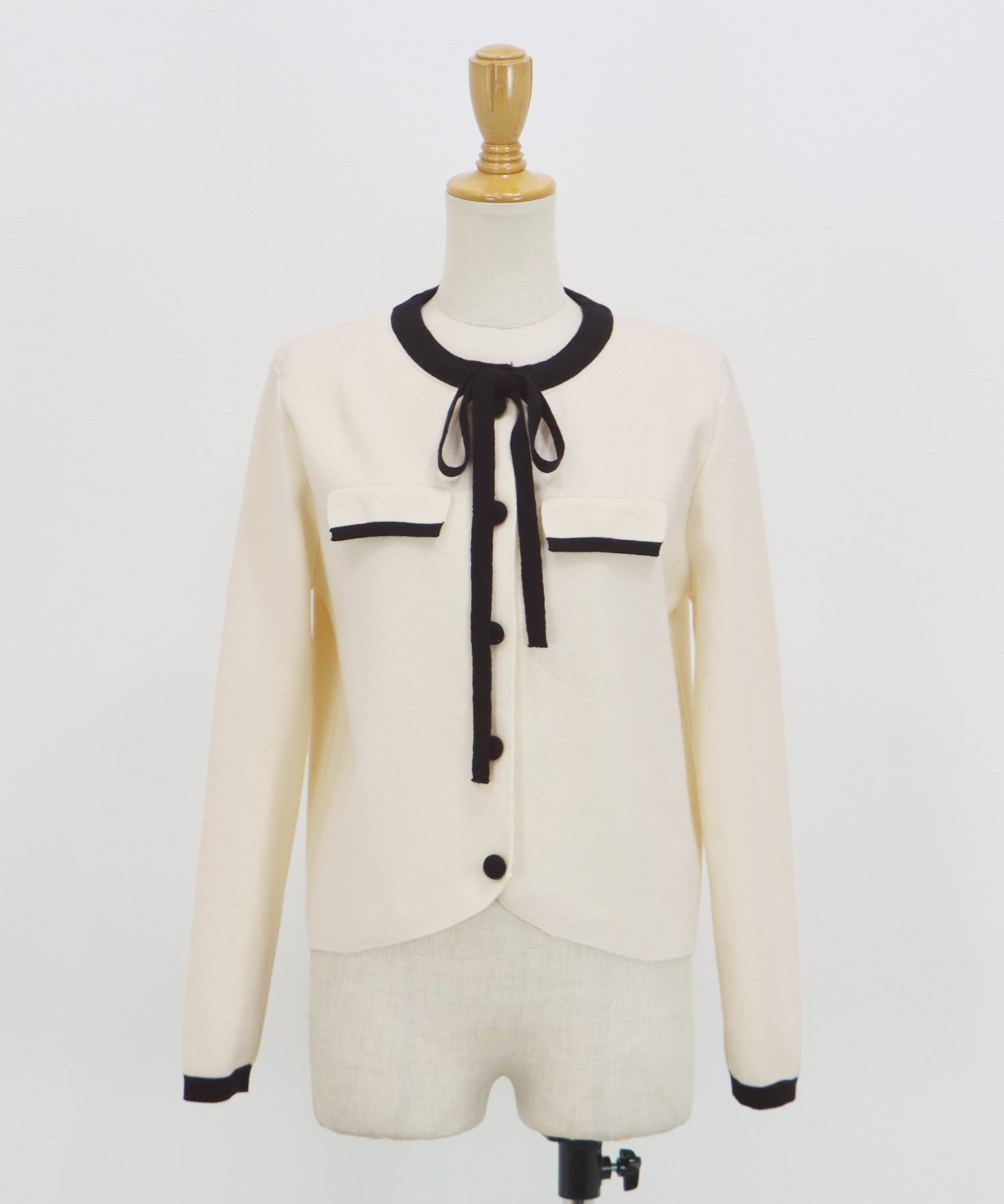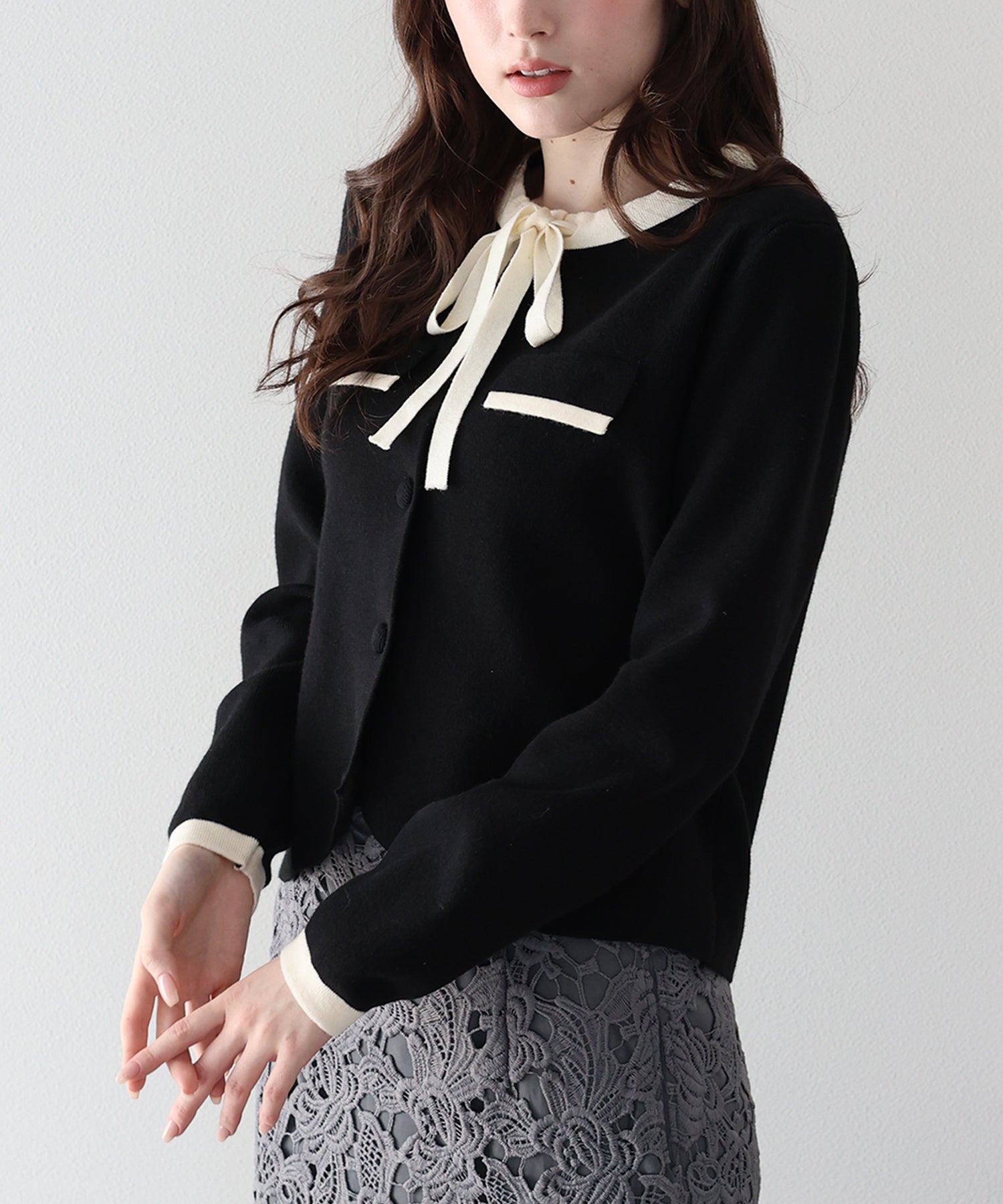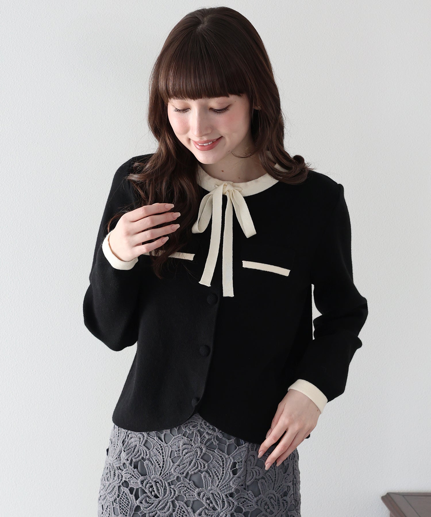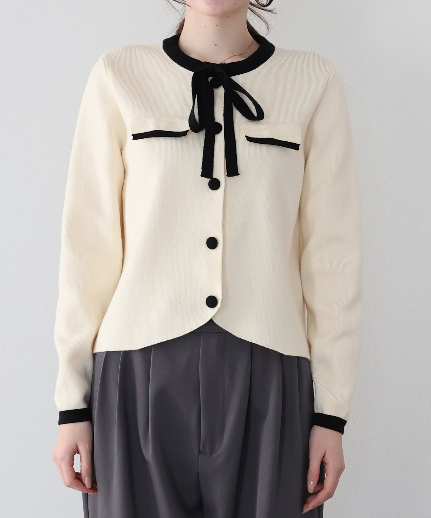 バイカラーのリボンとラインがクラシカルなアクセントを添える、トレンド感のあるリボンニットカーディガン。
