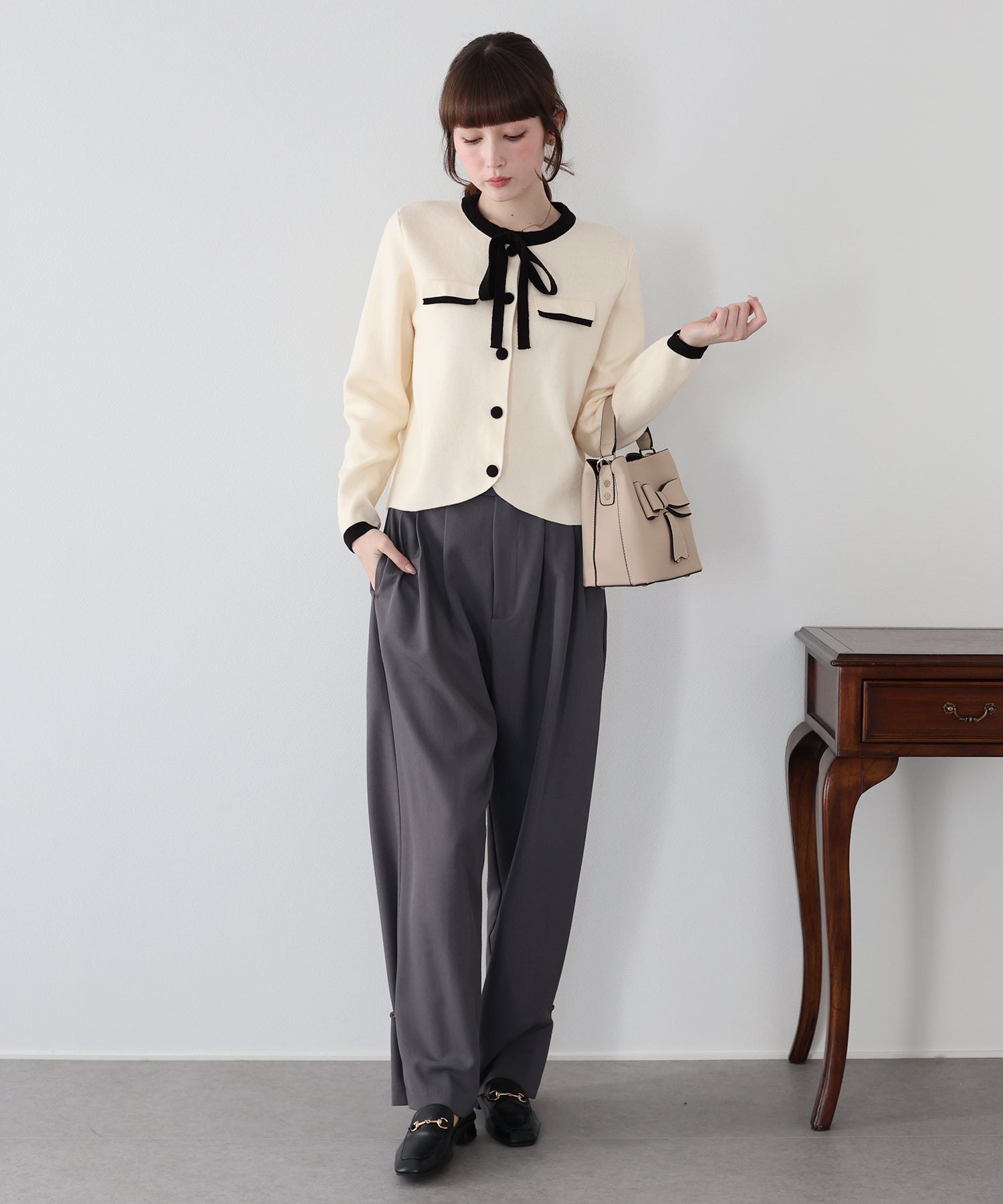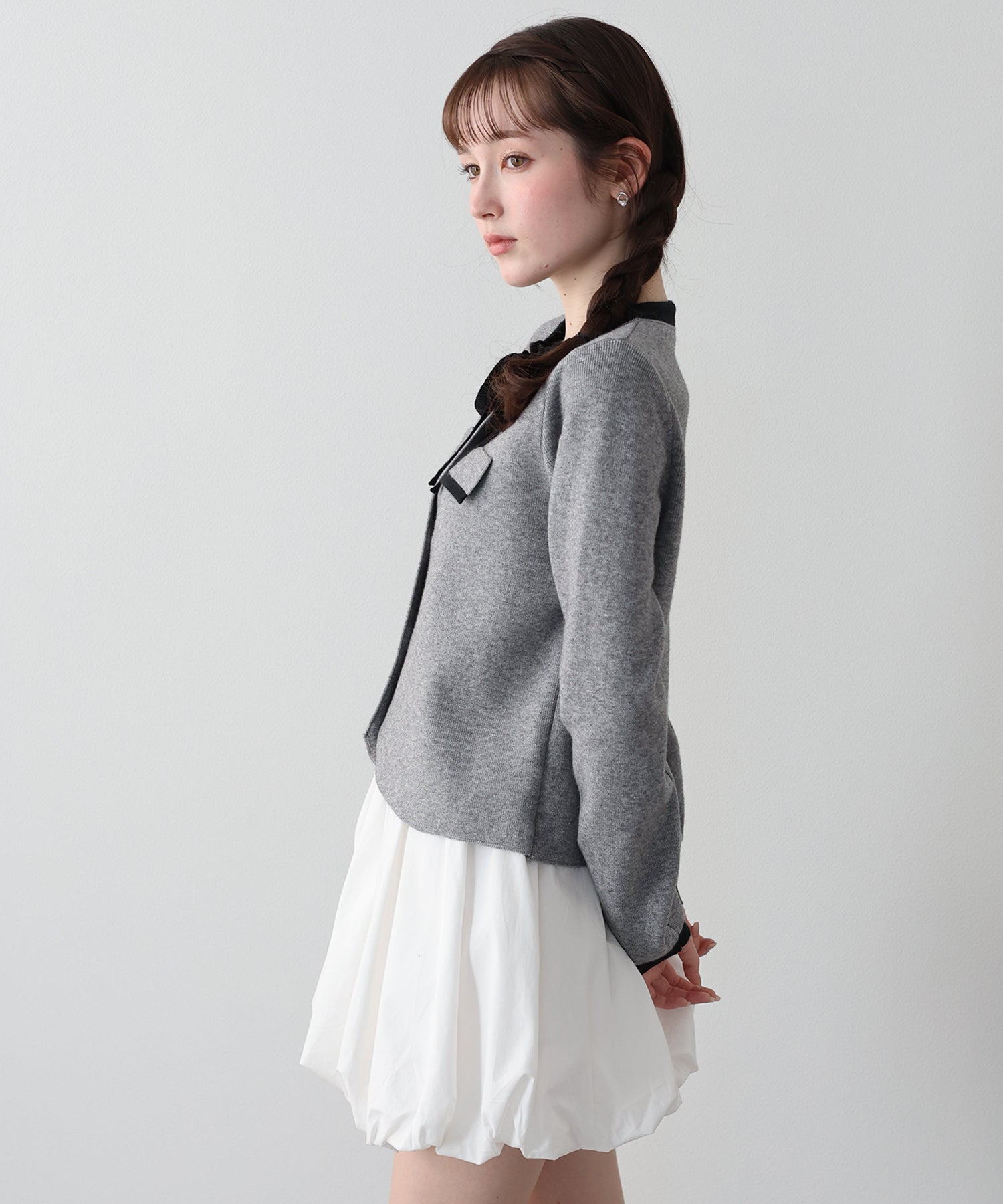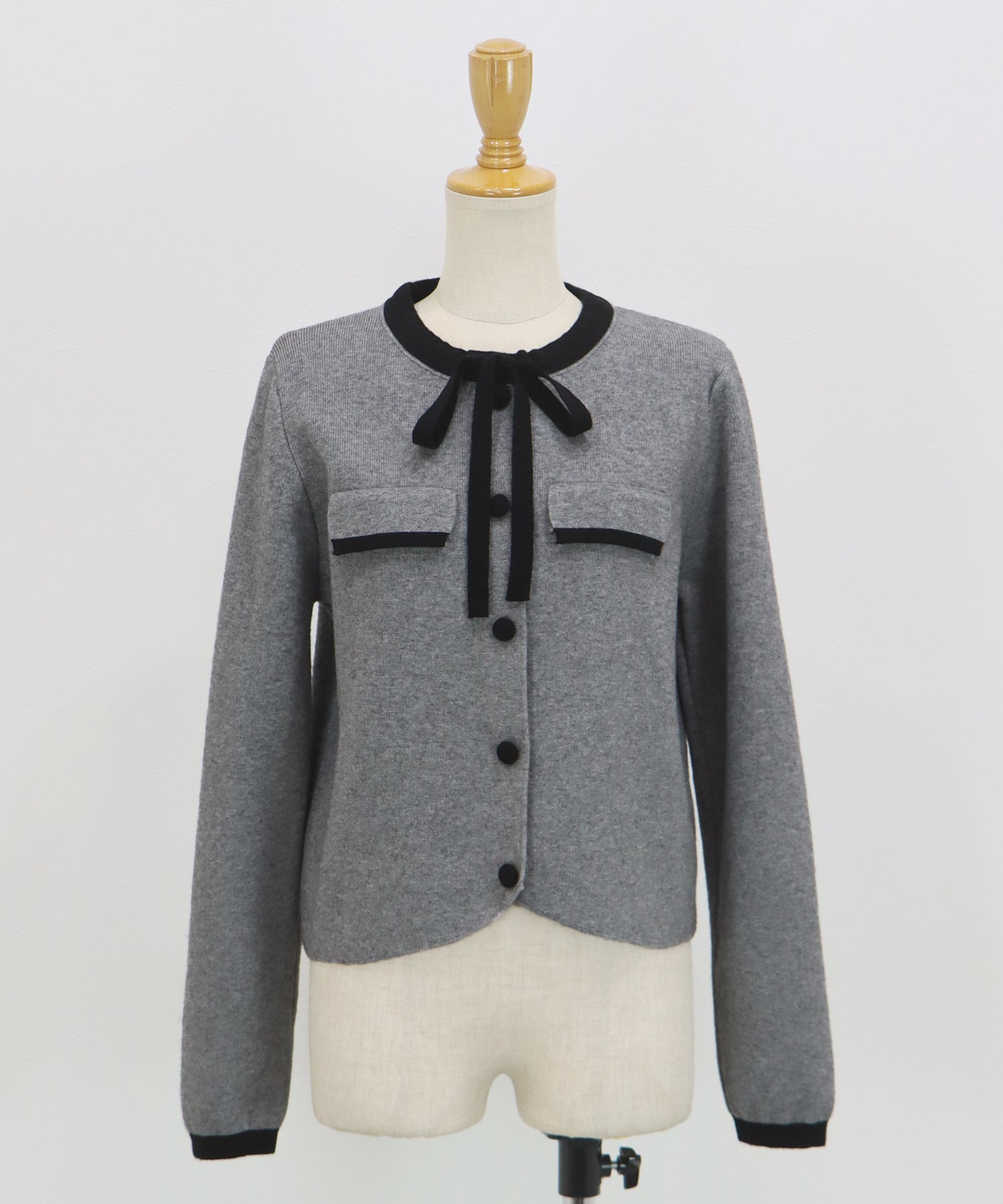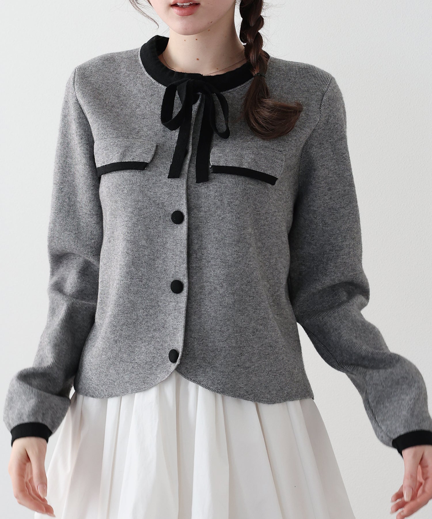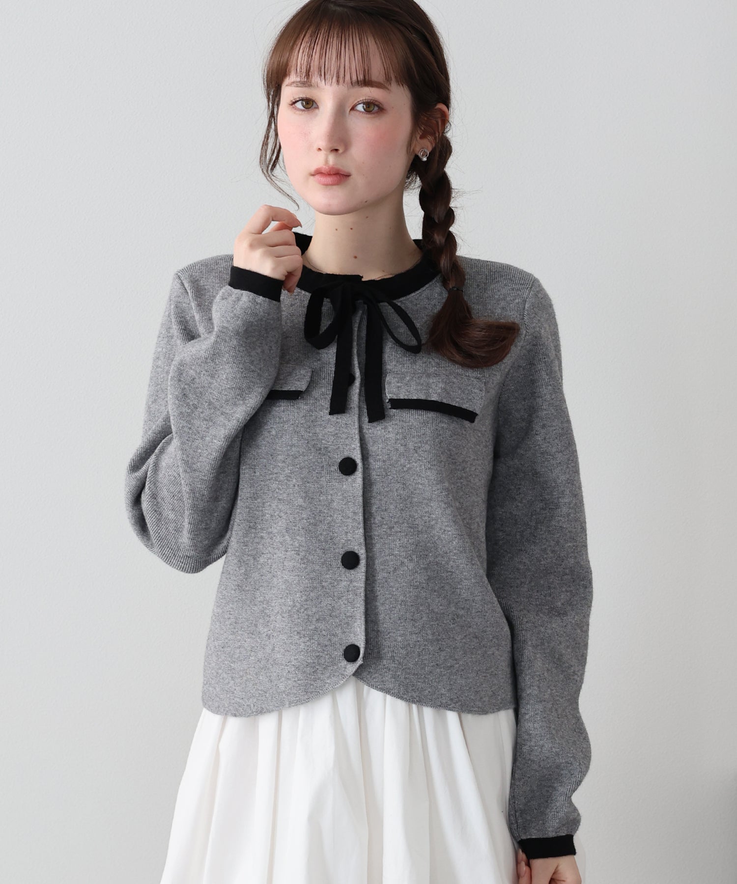 バイカラーのリボンとラインがクラシカルなアクセントを添える、トレンド感のあるリボンニットカーディガン。