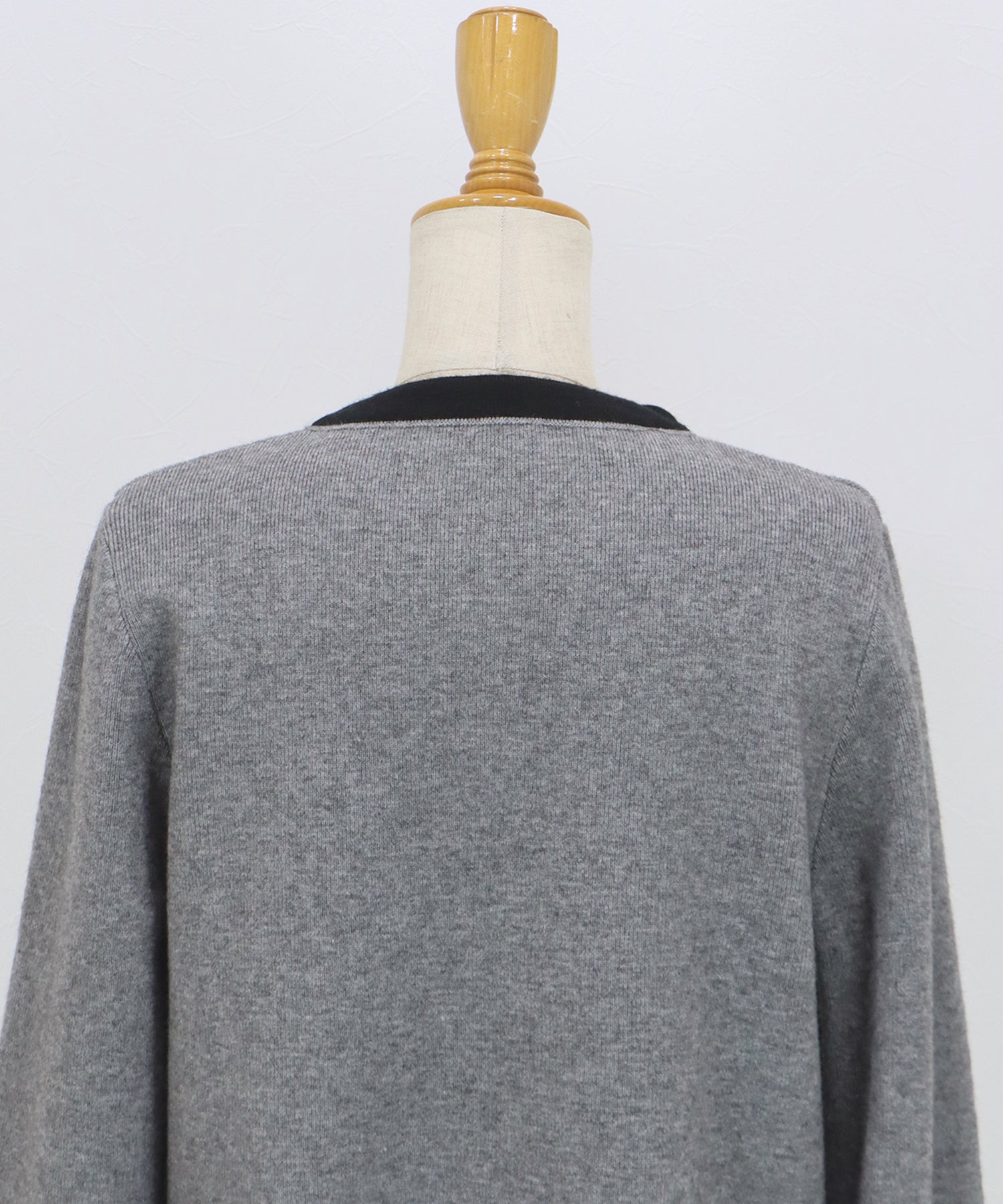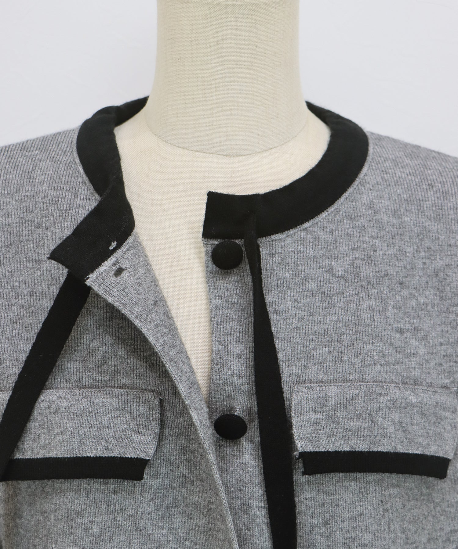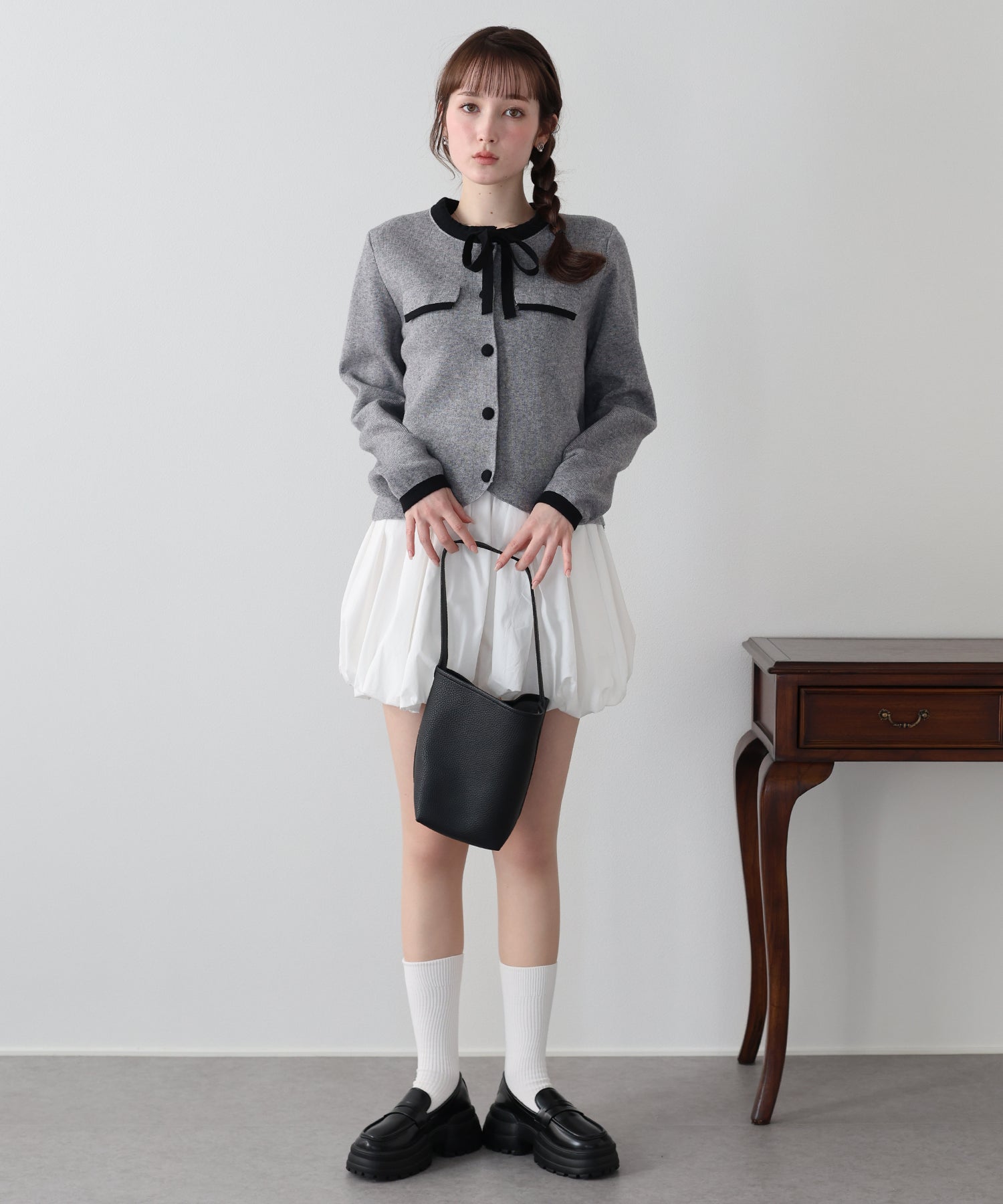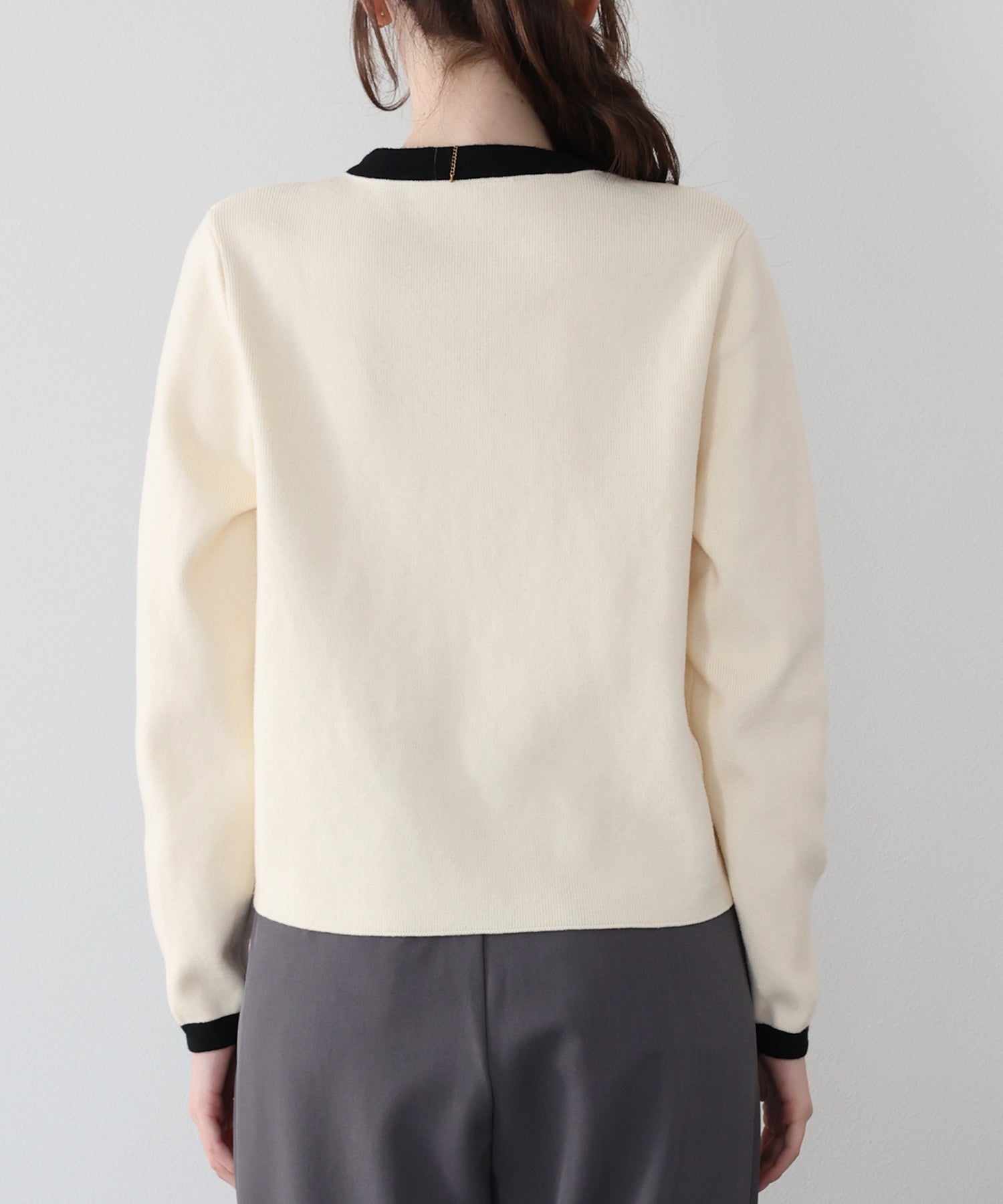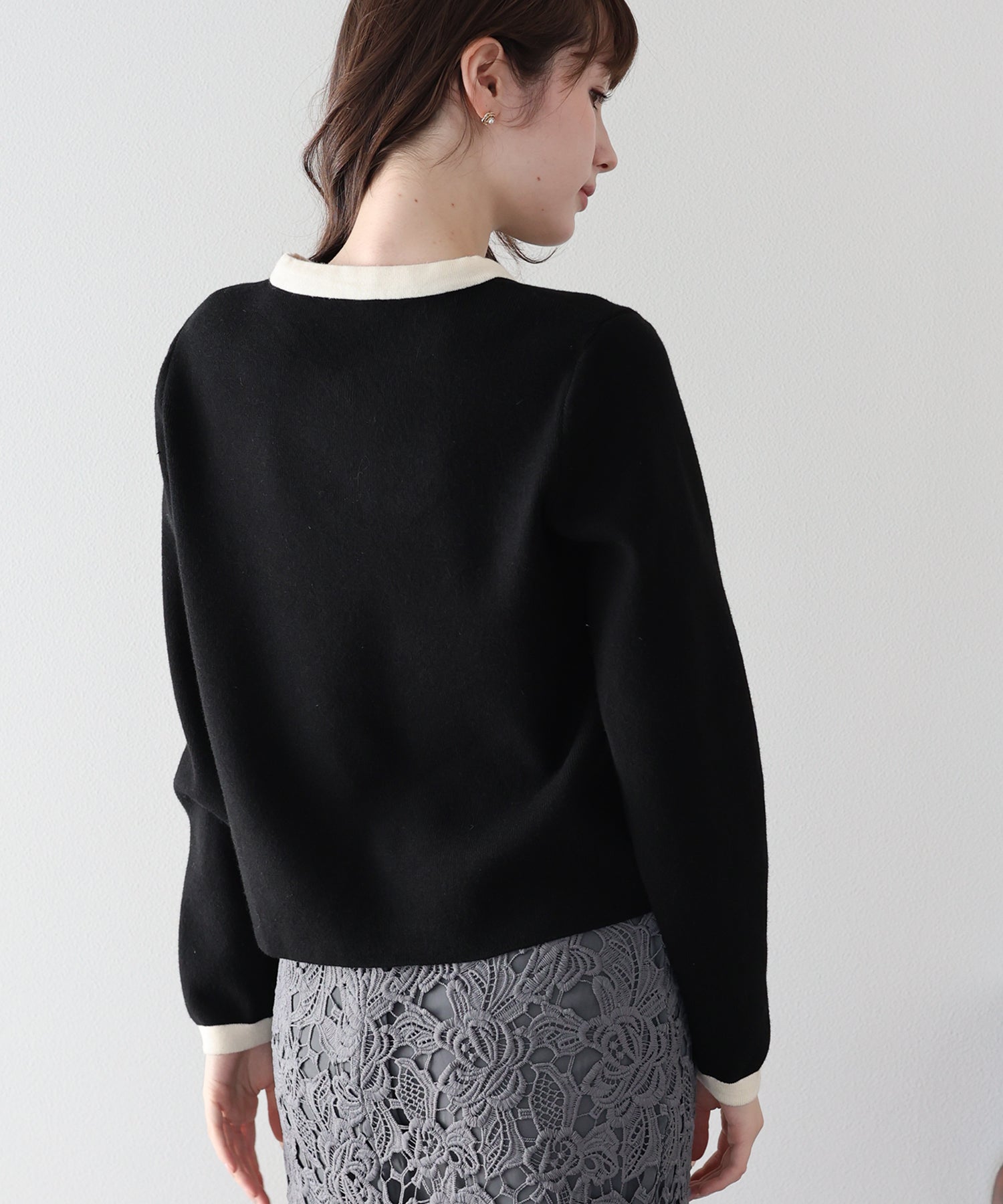 バイカラーのリボンとラインがクラシカルなアクセントを添える、トレンド感のあるリボンニットカーディガン。