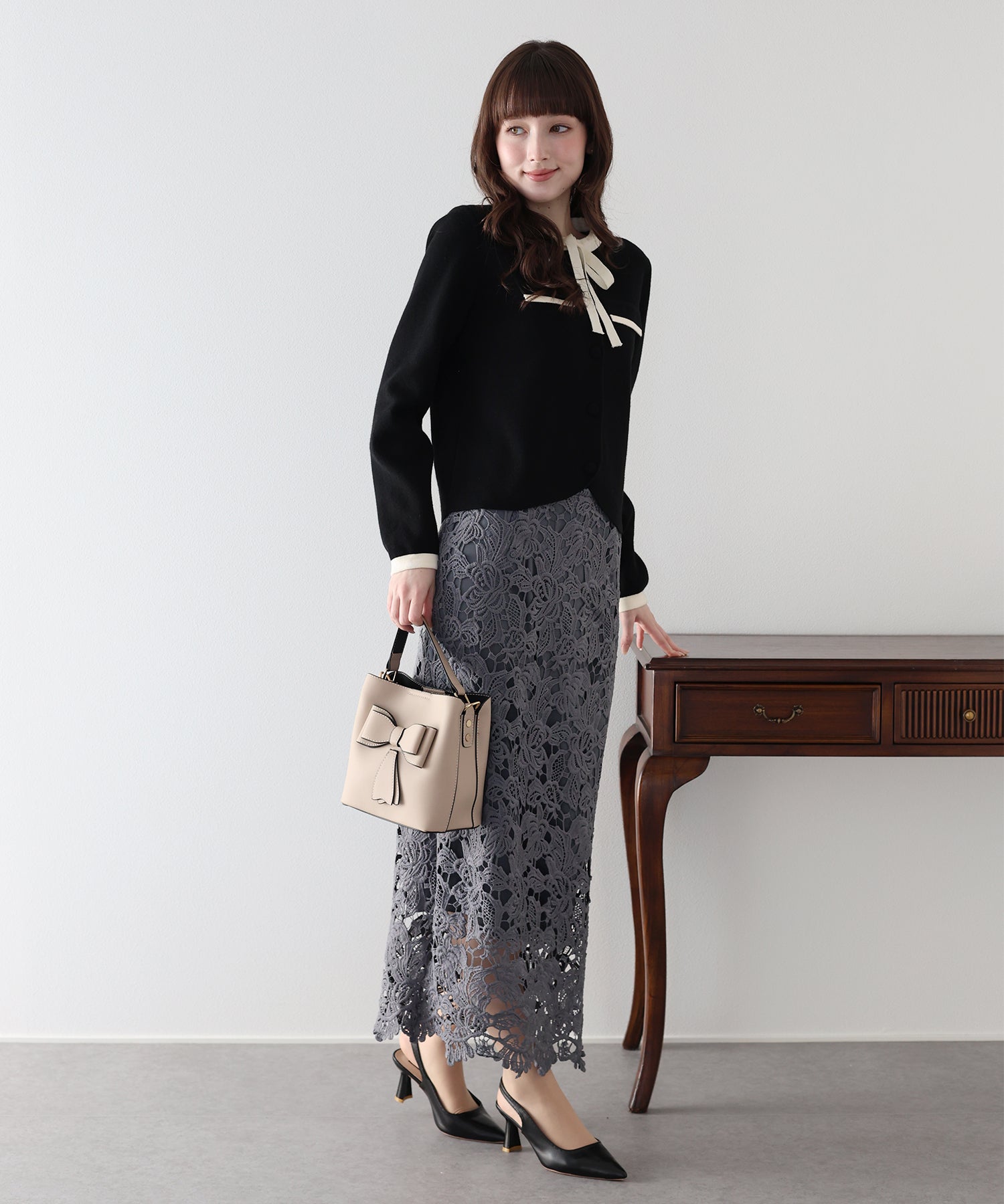 首元で結ぶドロスト仕様のニットリボンが顔周りを華やかに彩り、上品な女性らしさを演出します。