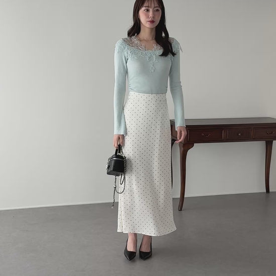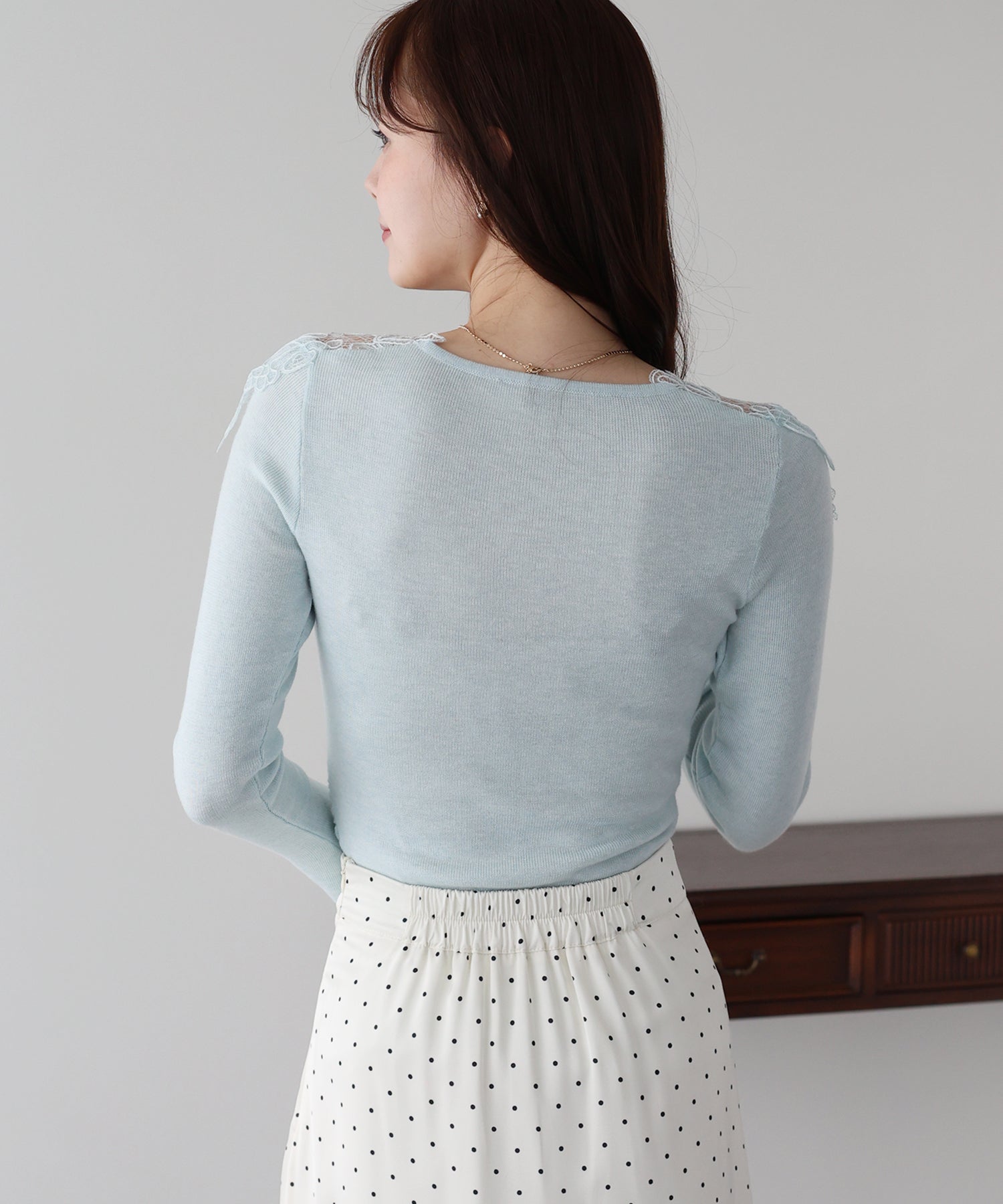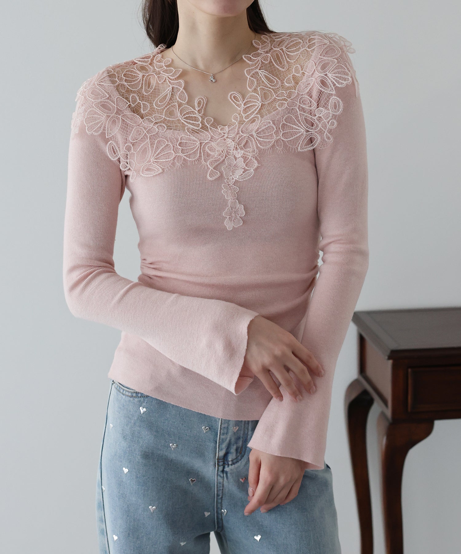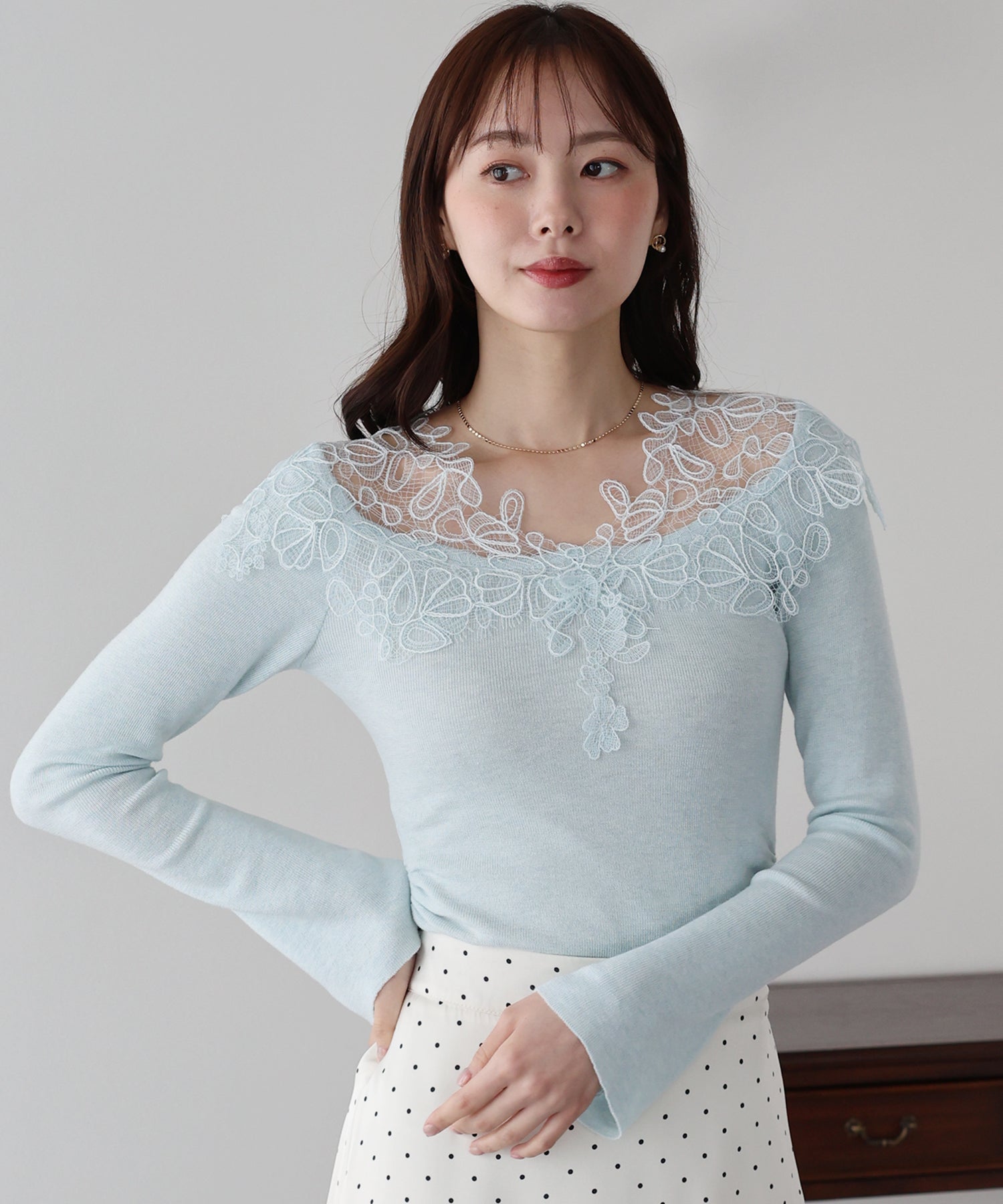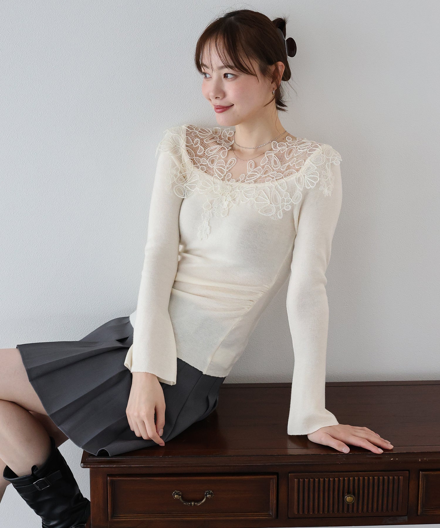デコルテを彩る大胆なフラワーレースが、大人の華やかさを放つニットトップス。