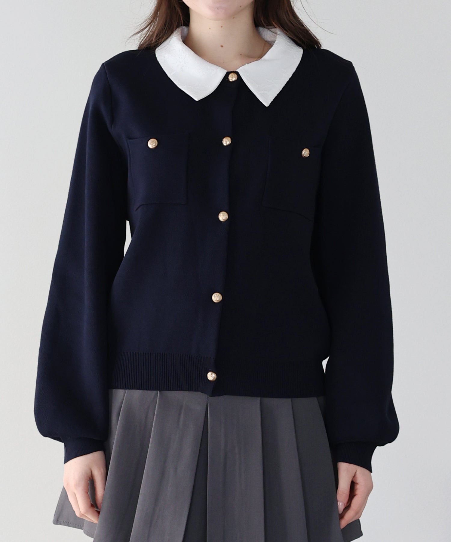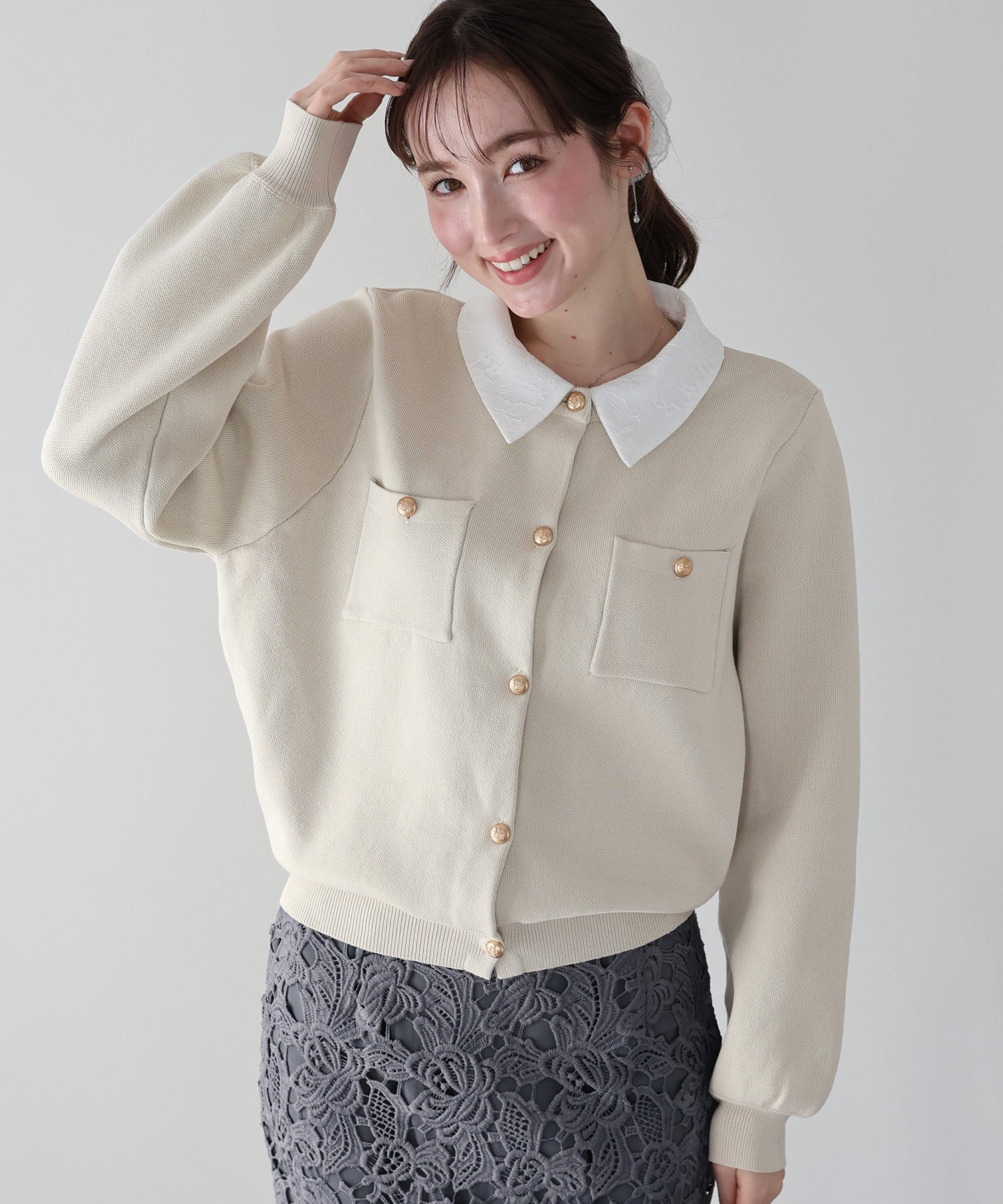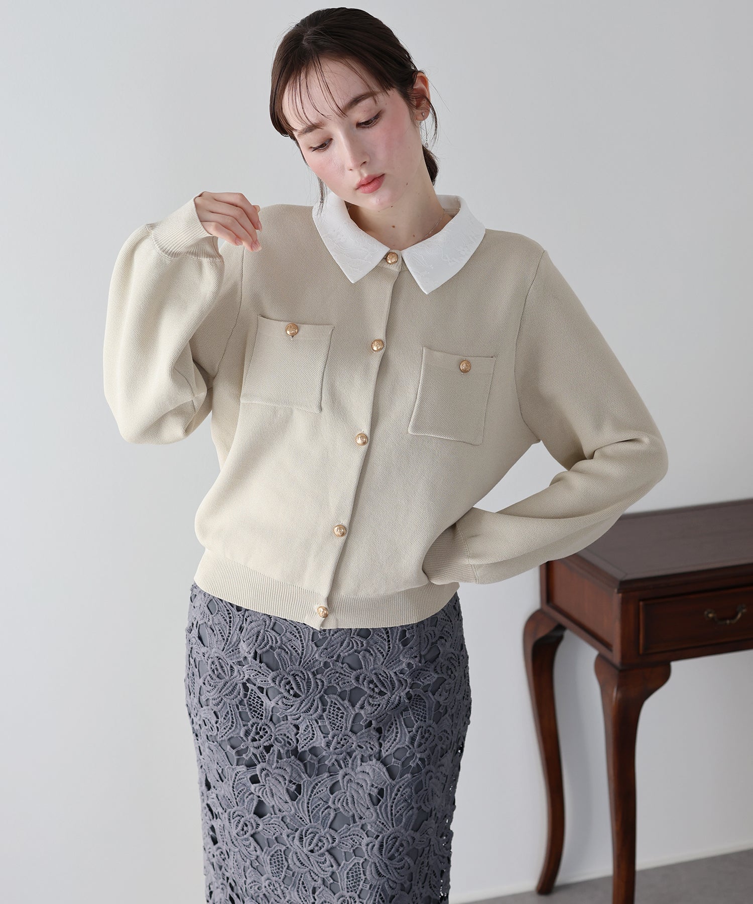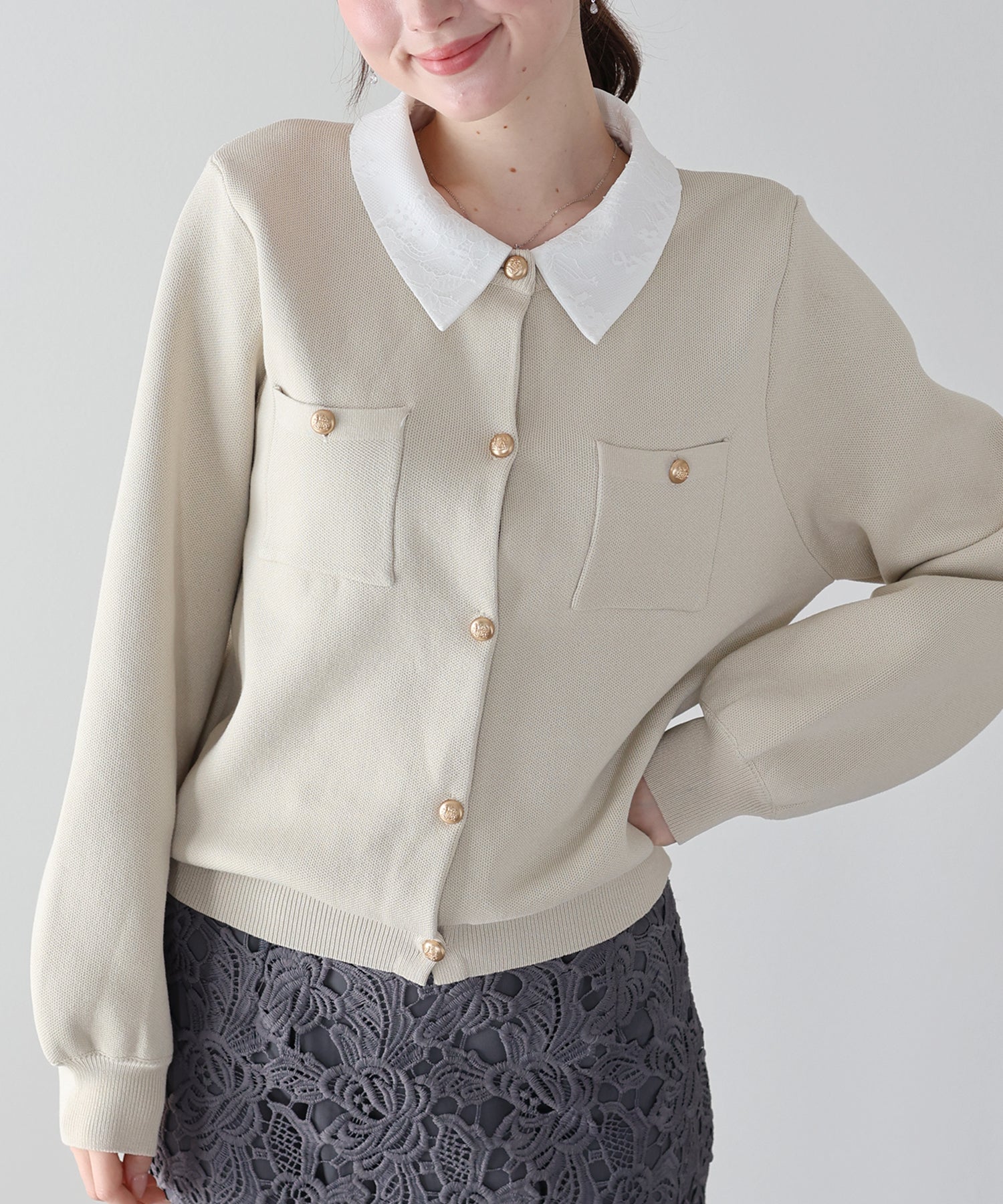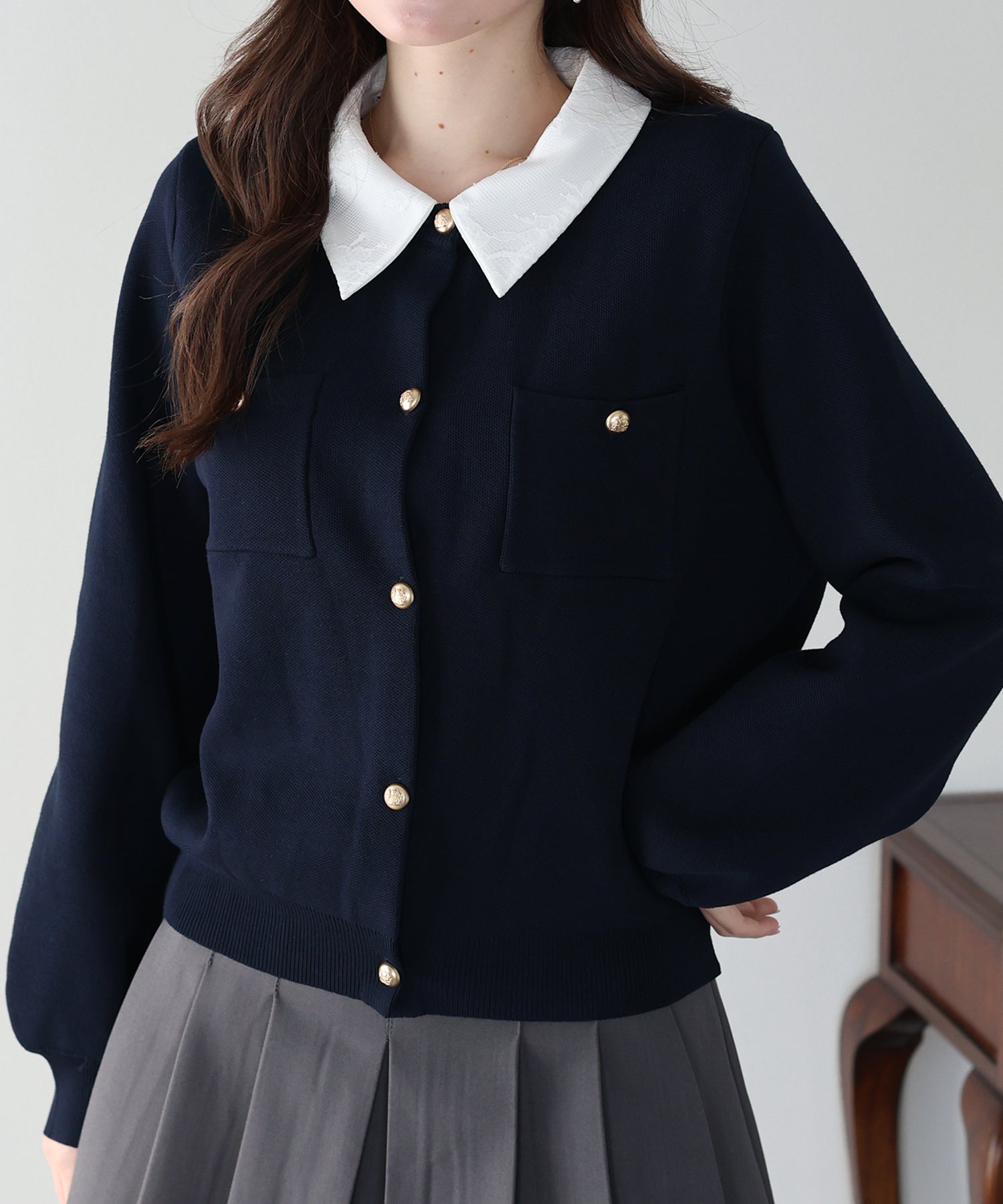 クラシカルな金ボタンがアクセントのニットカーディガンに、繊細なレースを重ねた襟をプラスした気品溢れる一着。