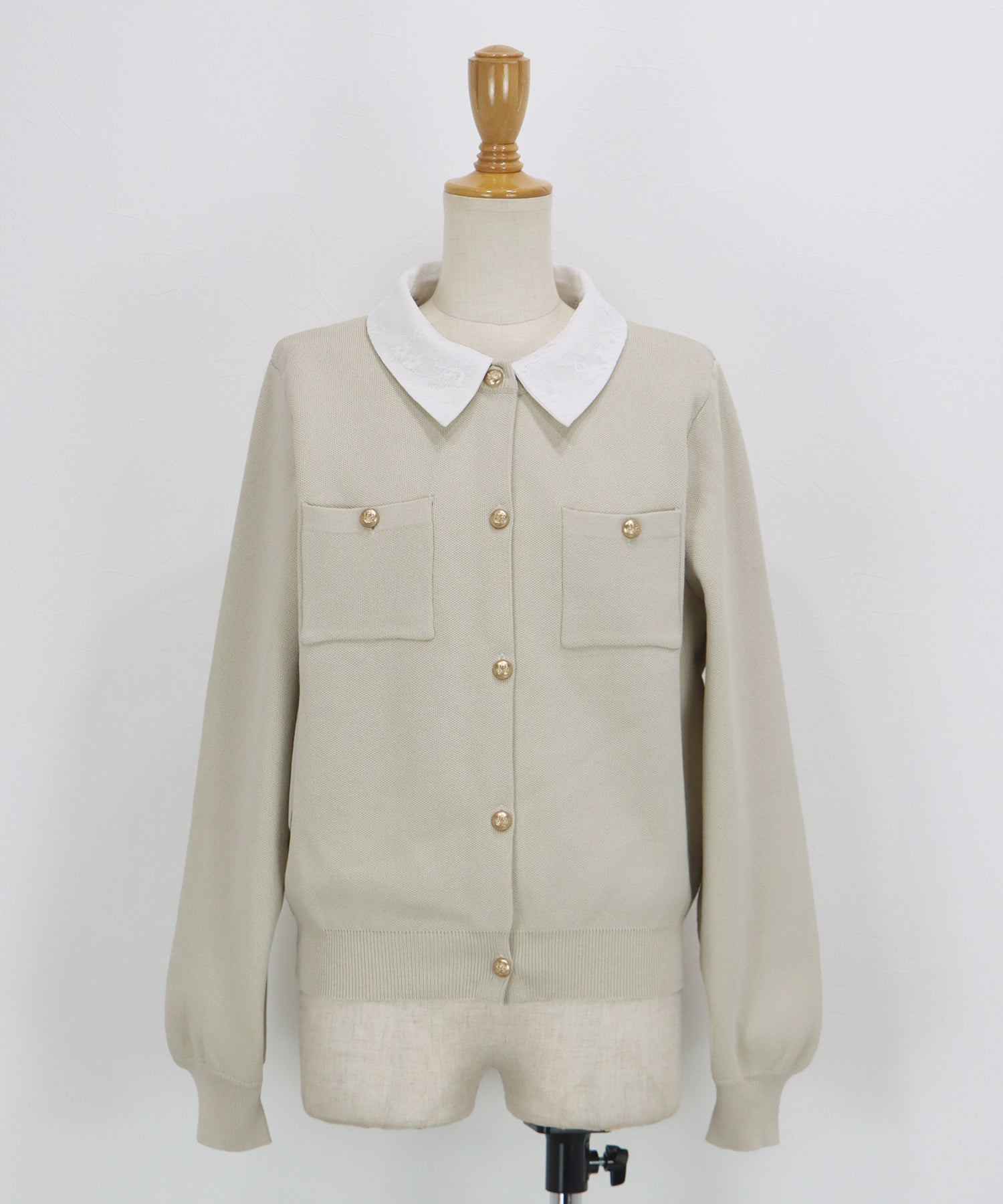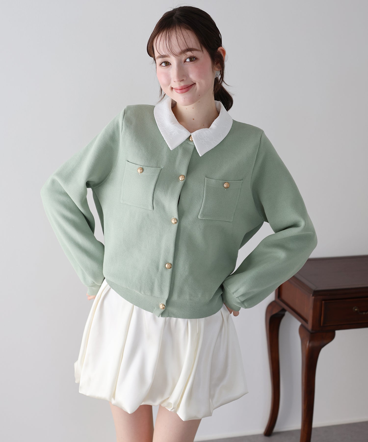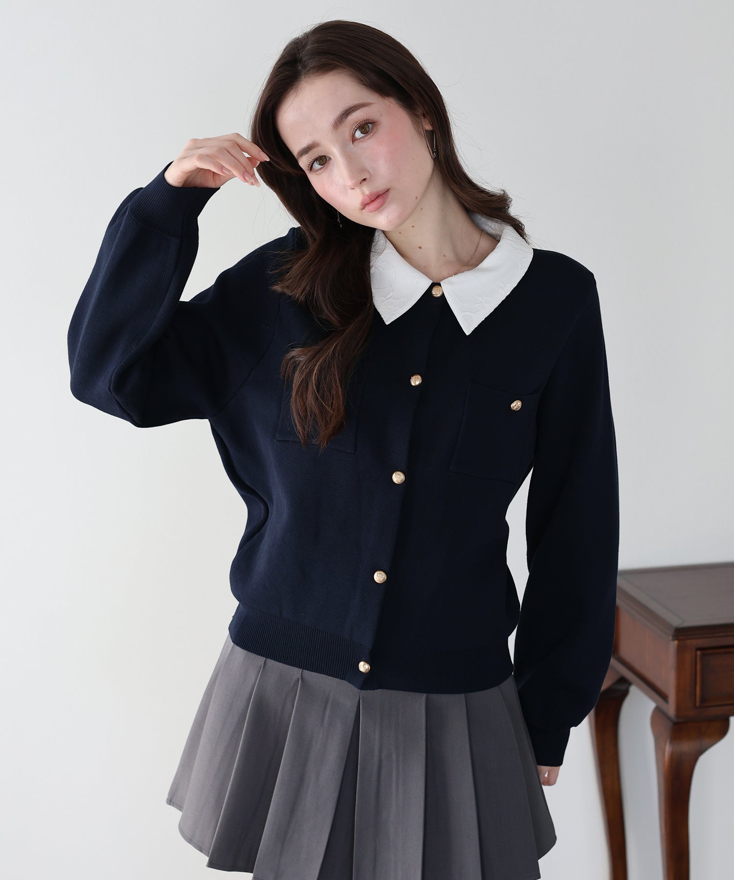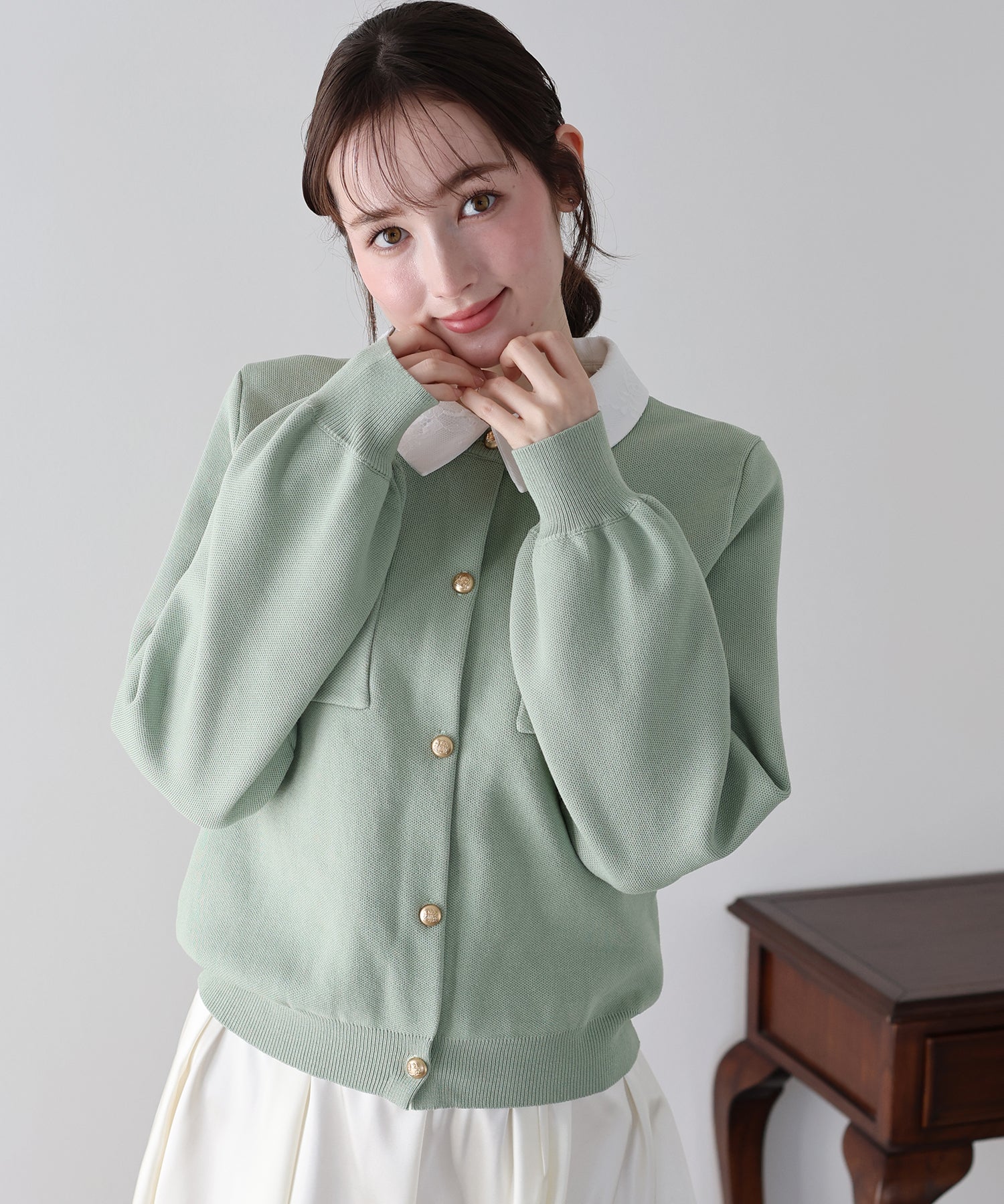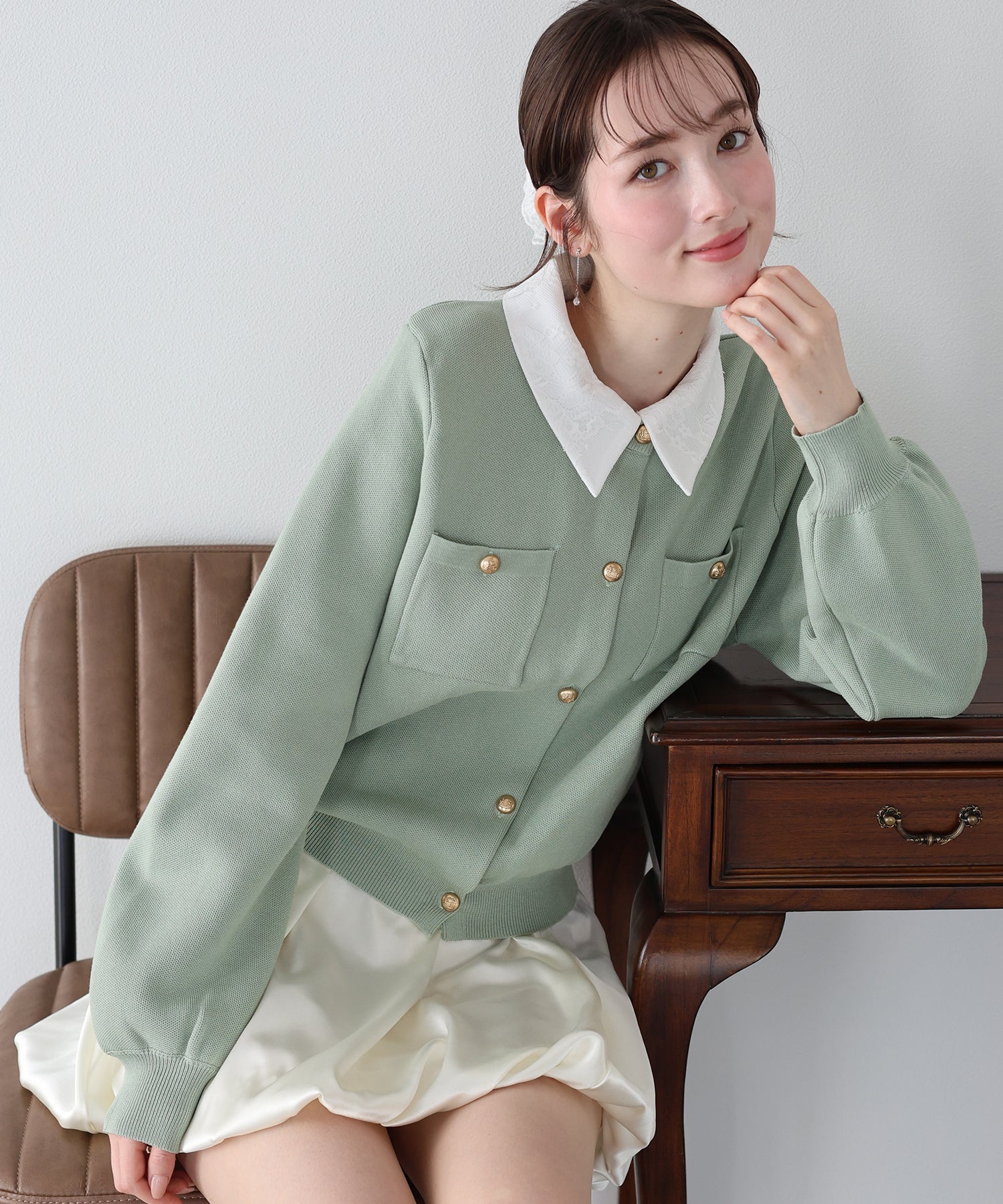 クラシカルな金ボタンがアクセントのニットカーディガンに、繊細なレースを重ねた襟をプラスした気品溢れる一着。
